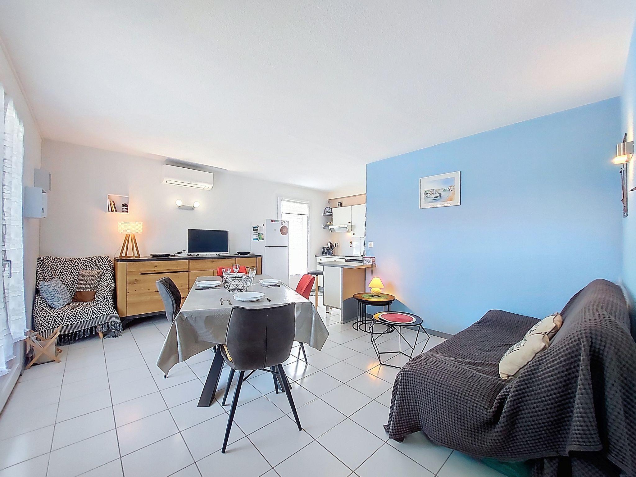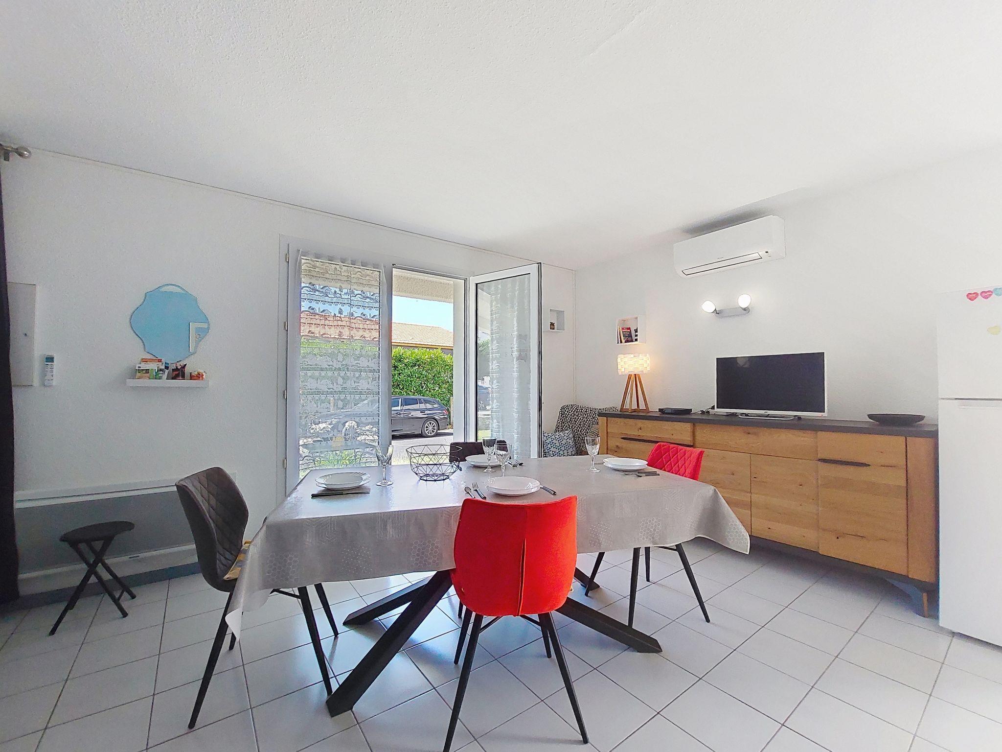 2-room apartment 40 m2, on the ground floor. Living/dining room with 1 double sofabed (1 x 140 cm, length 190 cm), TV (flat screen), air conditioning. Exit to the garden, to the terrace. 1 room with 1 french bed (1 x 140 cm, length 190 cm). Exit to the terrace. Kitchenette (3 induction hot plates, freezer, electric coffee machine, combination microwave). Shower, sep. WC. Electric heating. Terrace, patio 20 m2. Terrace furniture. Facilities: washing machine, iron. Internet (WiFi, free). Parking. Please note: smoke alarm. 1730600052339