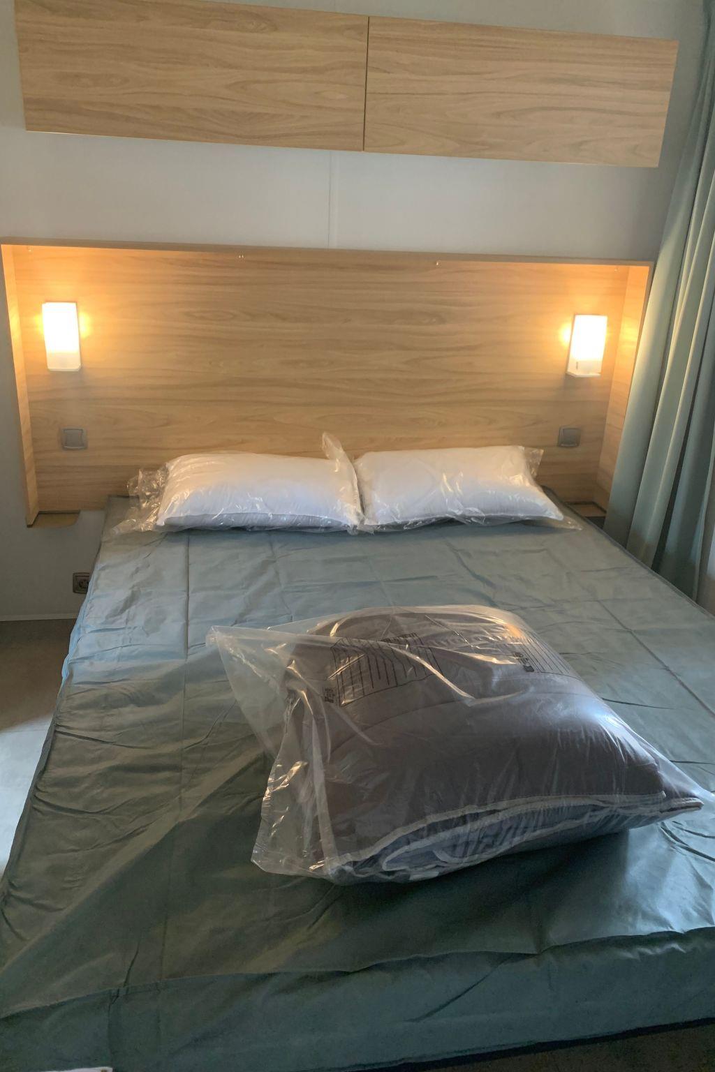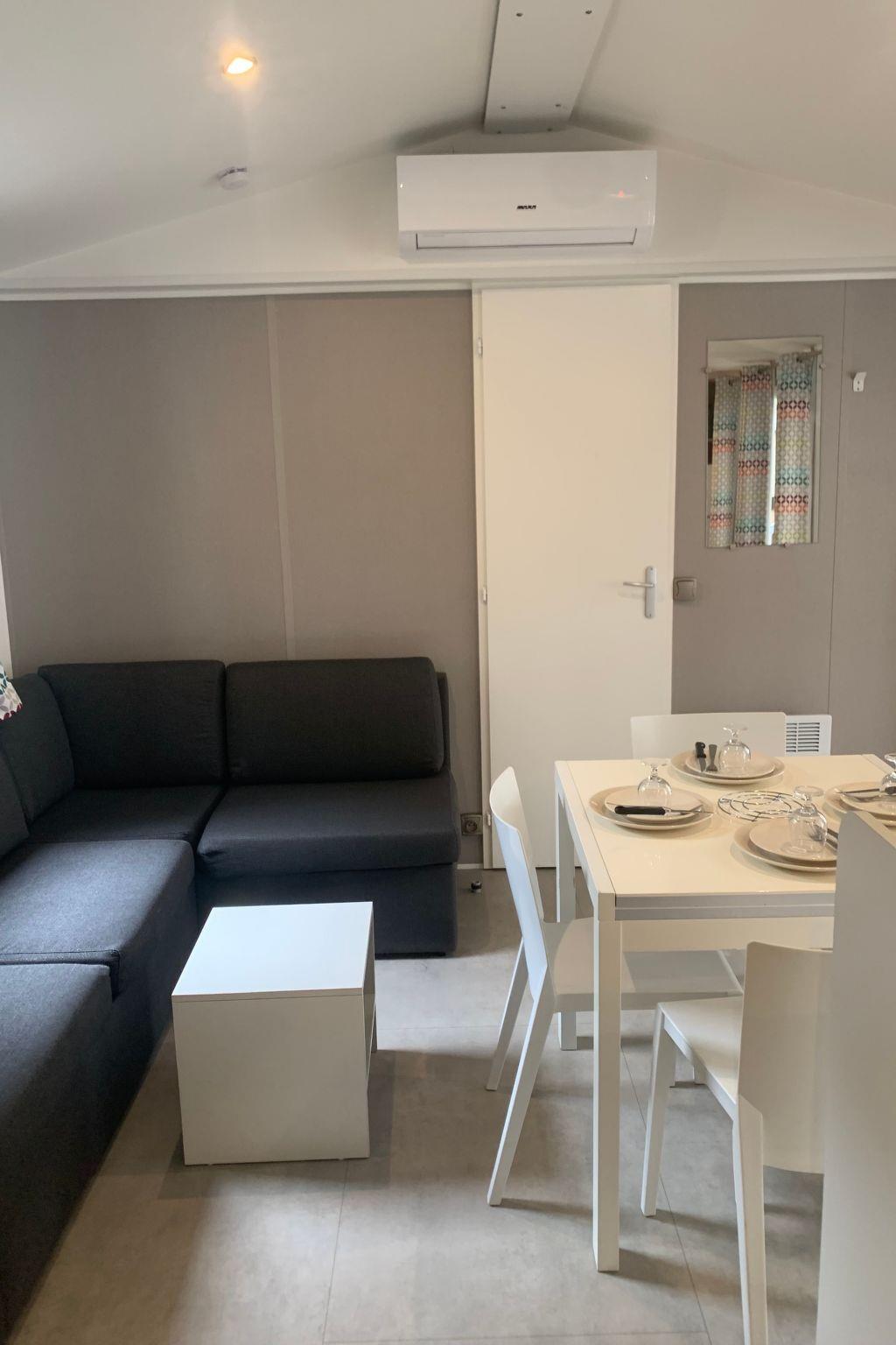 Inside, you'll be welcomed into a 40 m² space meticulously designed to meet your every need. The mobile home has three comfortable bedrooms and two practical bathrooms, ensuring a pleasant stay for all occupants. Adjustable air conditioning, available throughout, keeps you cool and cosy no matter how hot it gets outside. Amenities such as a mini-oven, dishwasher and electric kettle add a touch of comfort to your holiday.