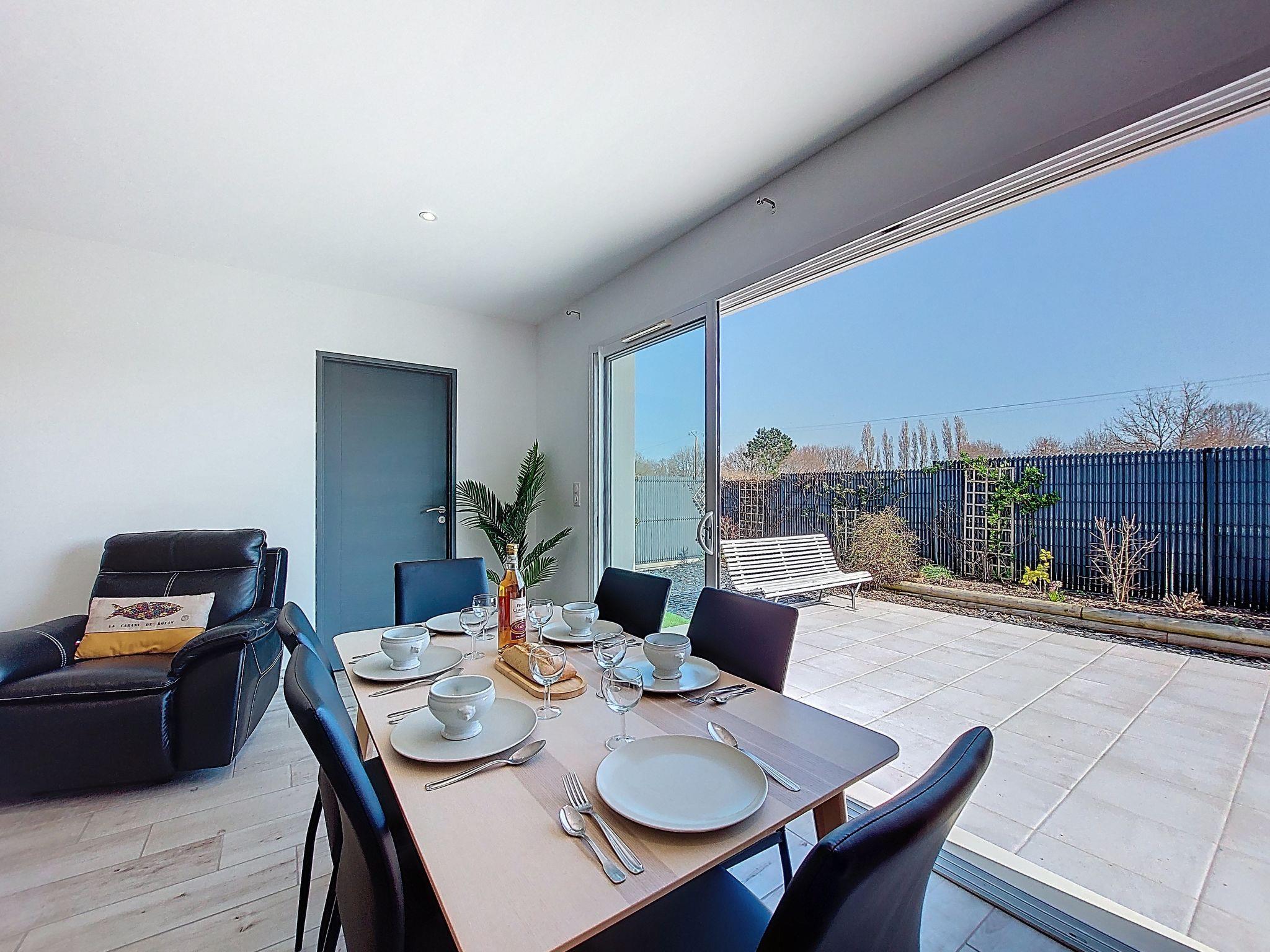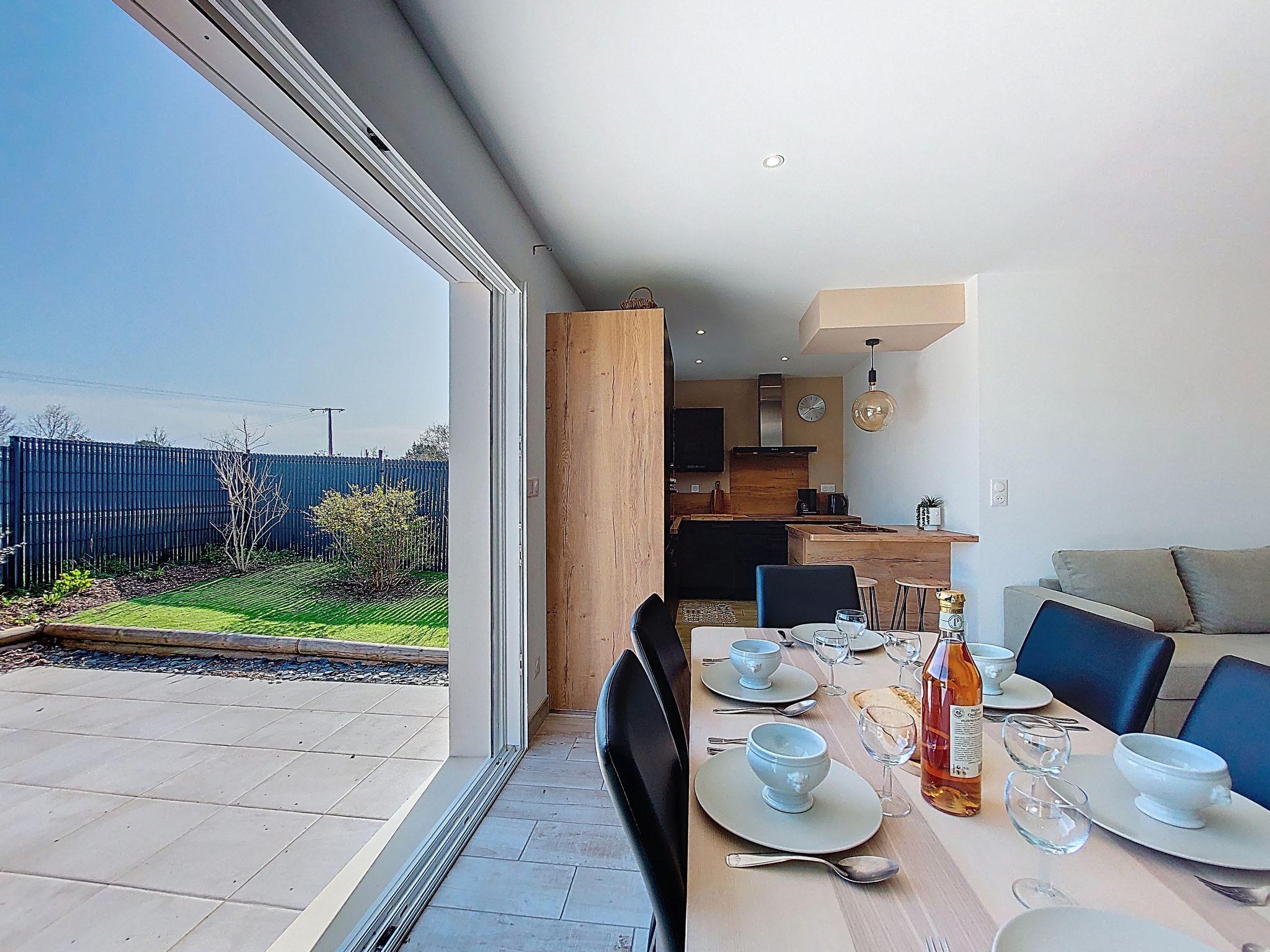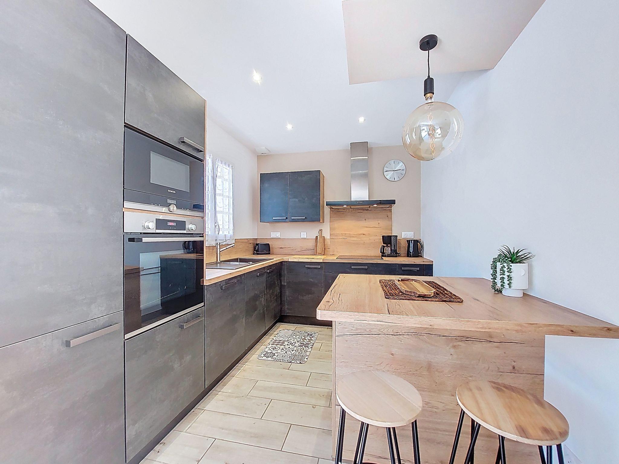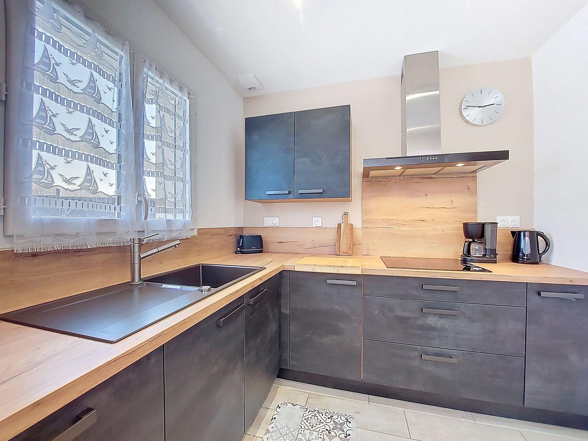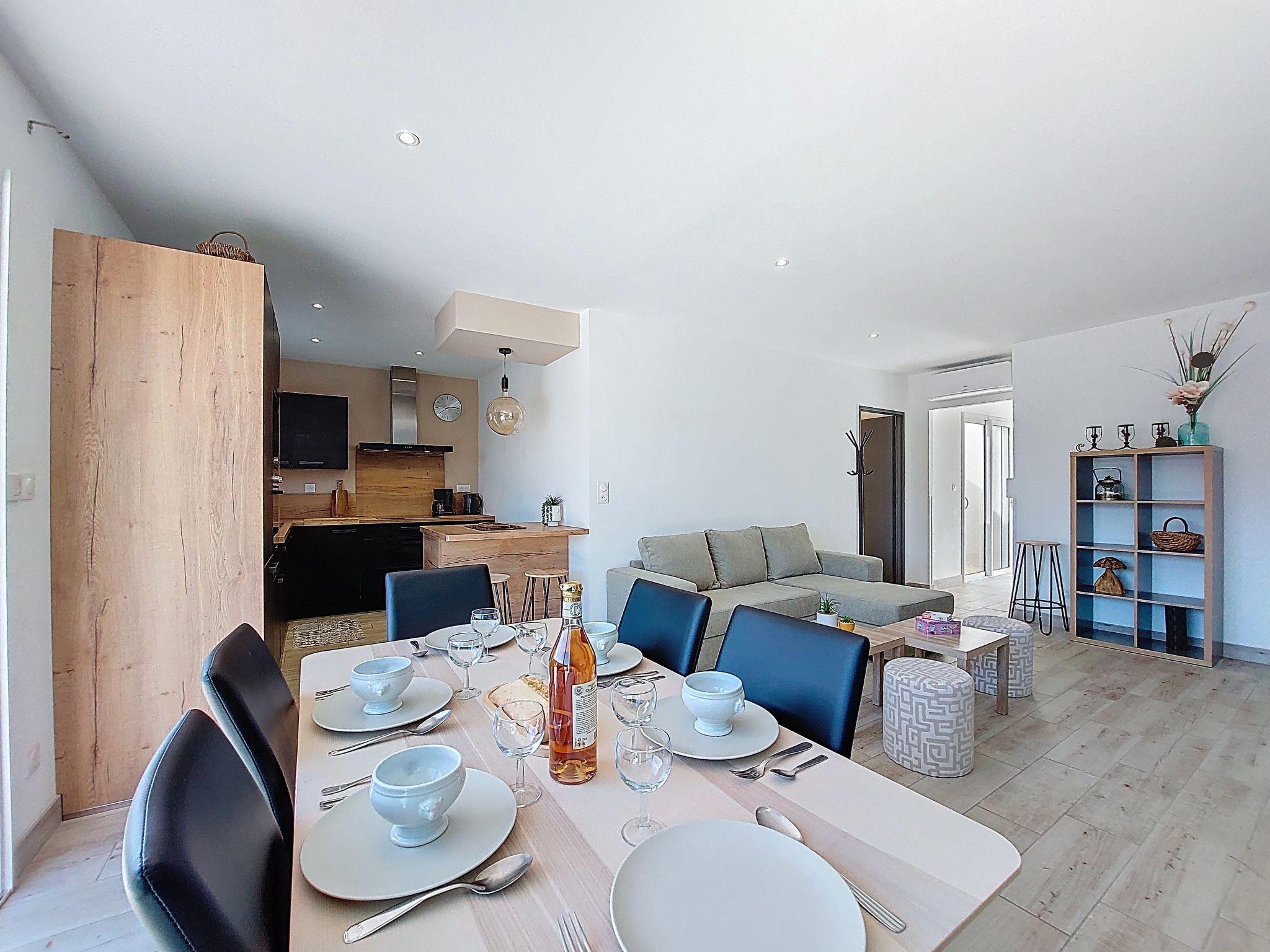 4-room terraced house 94 m2, south-west facing position. Modern furnishings: living/dining room with TV (flat screen), air conditioning. Exit to the terrace. 1 room with 1 french bed (1 x 160 cm, length 190 cm). 1 room with 1 french bed (1 x 140 cm, length 190 cm). 1 room with 2 beds (90 cm, length 190 cm). Open kitchen (oven, dishwasher, 3 induction hot plates, toaster, kettle, microwave, freezer, electric coffee machine). Shower, sep. WC. Large terrace 60 m2. Terrace furniture, electric barbecue. Facilities: washing machine, children's high chair, baby cot. Internet (WiFi, free). Parking (2 cars). Please note: maximum 1 pet/ dog allowed. Smoke alarm. Offer by a private individual according to Art. 155, IV of CGI.