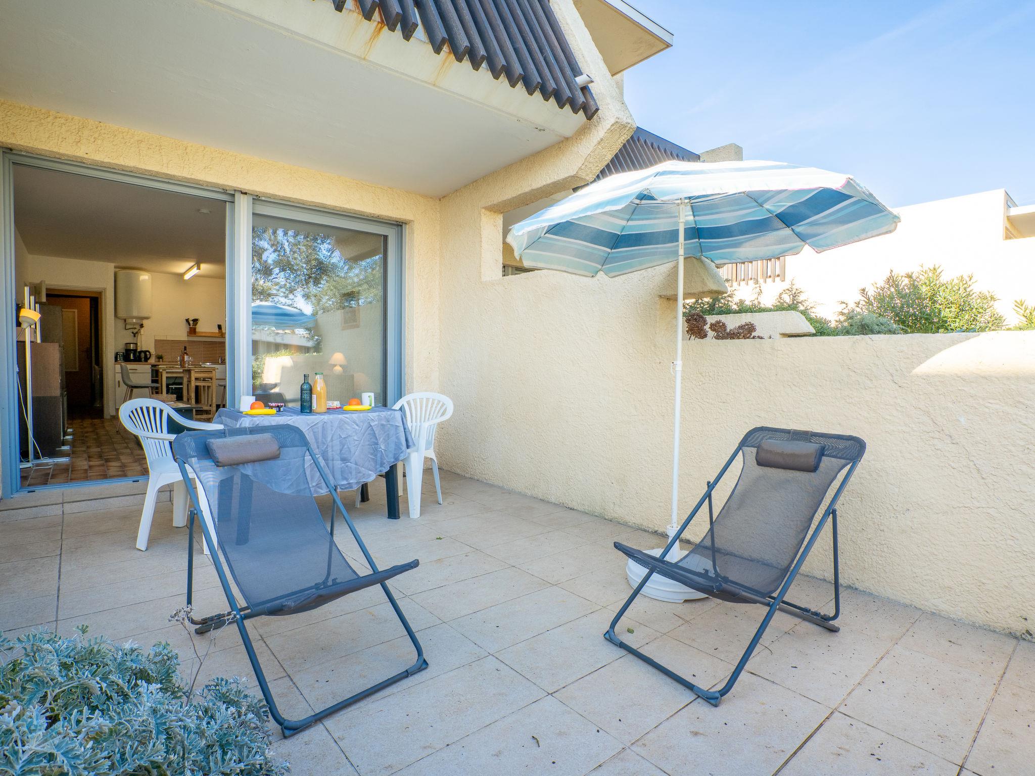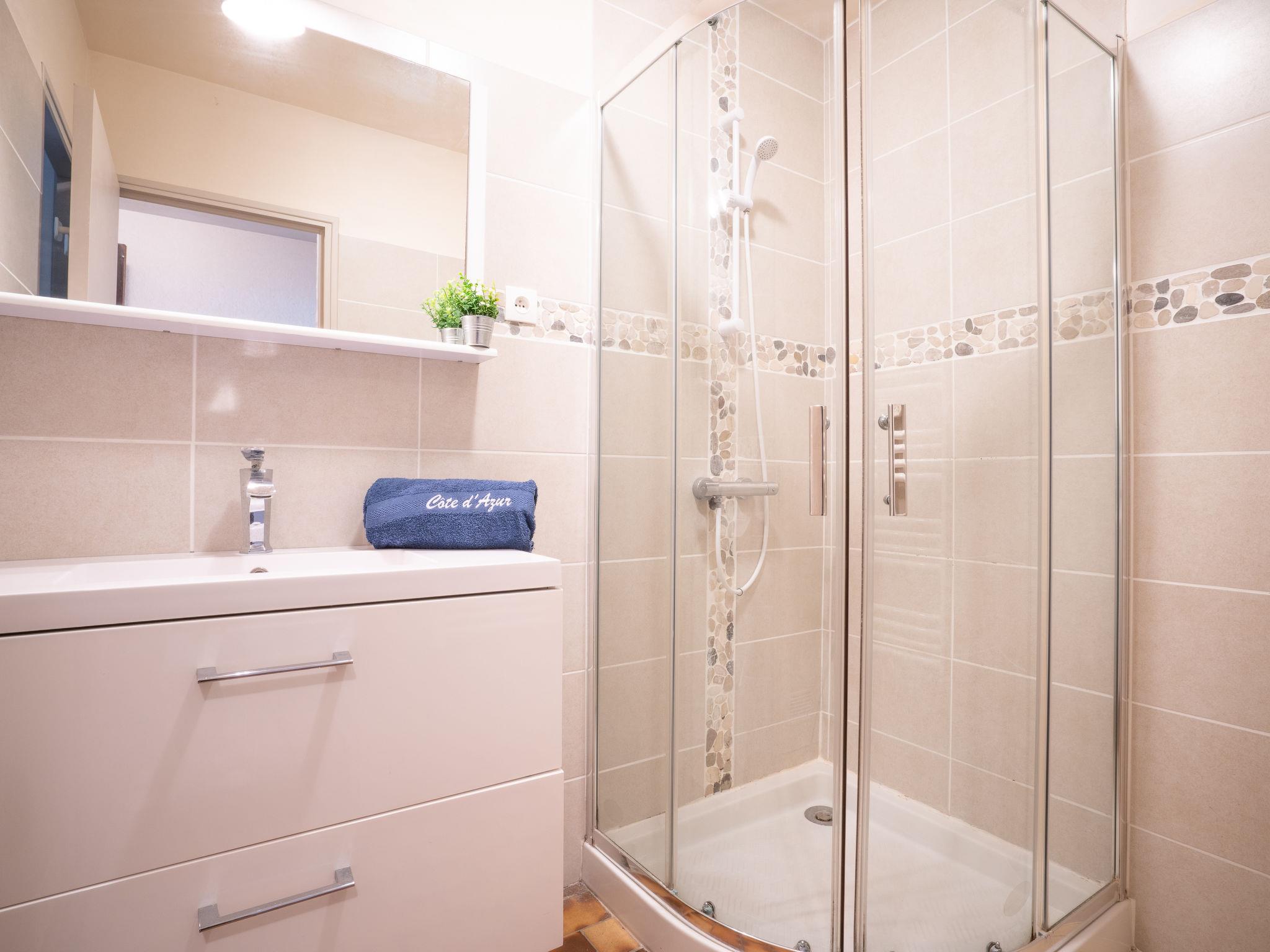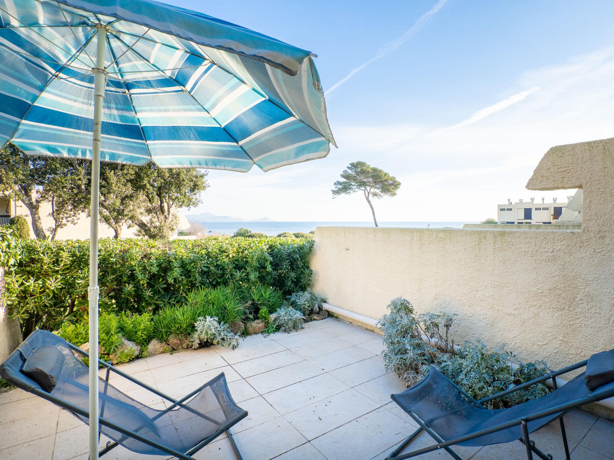 1-room studio 28 m2, on the ground floor, east facing position. Beautiful furnishings: living room with panoramic window with 1 double sofabed (160 cm, length 190 cm), TV and fan. Exit to the terrace. Kitchenette (oven, 2 ceramic glass hob hotplates, toaster, kettle, microwave, freezer, electric coffee machine). Shower/WC. Heating. Terrace 18 m2, east facing position. Terrace furniture, deck chairs (2). View of the sea. Facilities: iron. Internet (WiFi, extra). Parking space n B14. Please note: TV only FR. Smoke alarm. FJS830HT