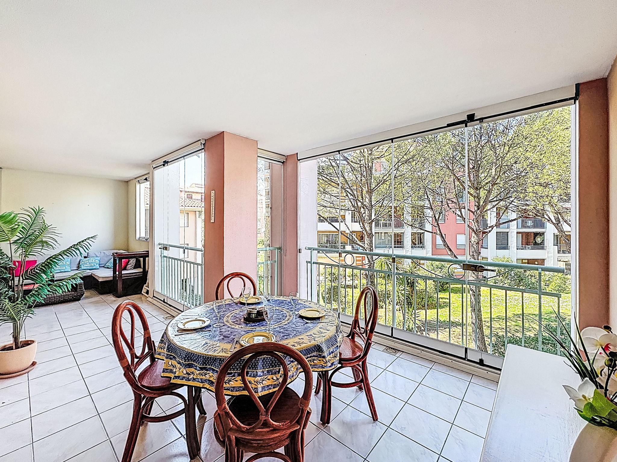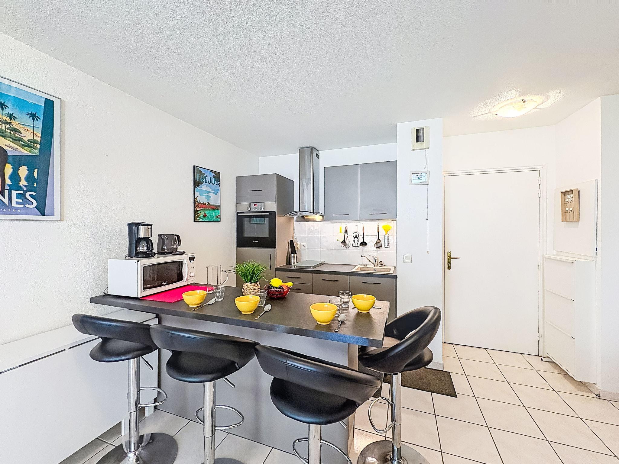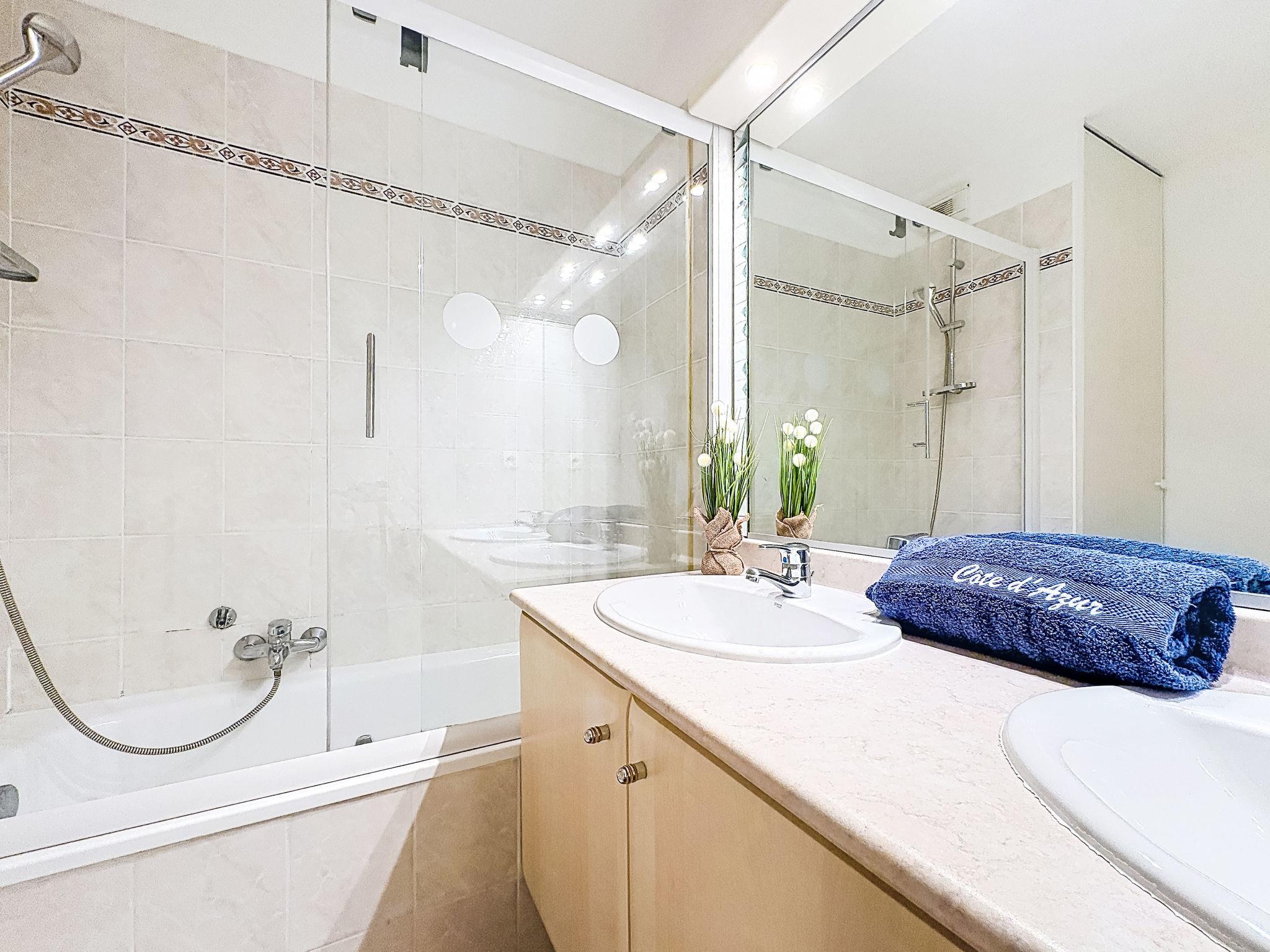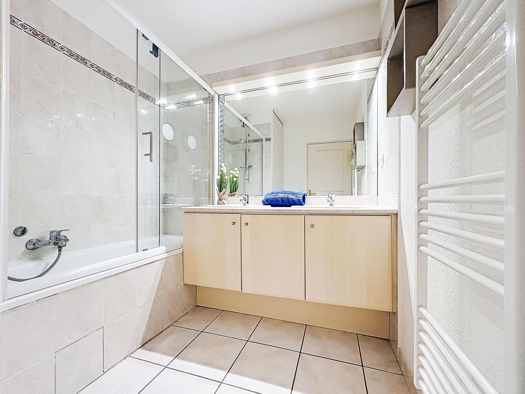 3-room apartment 48 m2 on 2nd floor. Beautiful and modern furnishings: living/dining room with TV (flat screen), fan. Exit to the terrace. 1 room with 1 french bed (180 cm, length 200 cm), fan. Exit to the terrace. 1 small room with 2 beds (80 cm, length 180 cm). Open kitchen (oven, dishwasher, 2 ceramic glass hob hotplates, toaster, kettle, microwave, freezer, electric coffee machine) with dining nook. Bathroom, sep. WC, double hand-basin. Heating. Large terrace 21 m2 partly roofed. Terrace furniture. Facilities: washing machine, dryer, iron, hair dryer. Internet (WiFi, free). Garage space n B26 (petite voiture) (1 car), height 200 cm, width 235 cm. Please note: TV only FR. Smoke alarm. Offer by a private individual according to Art. 155, IV of CGI. H2SUVY