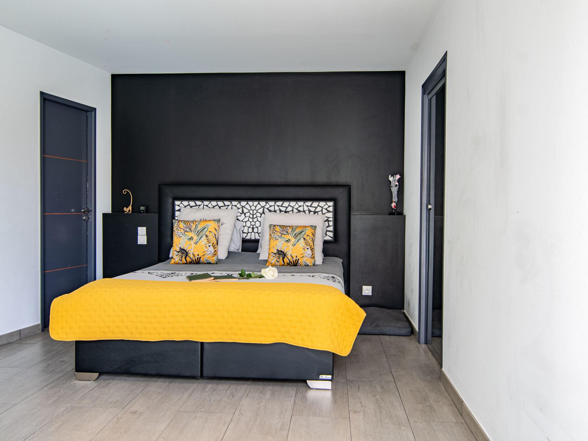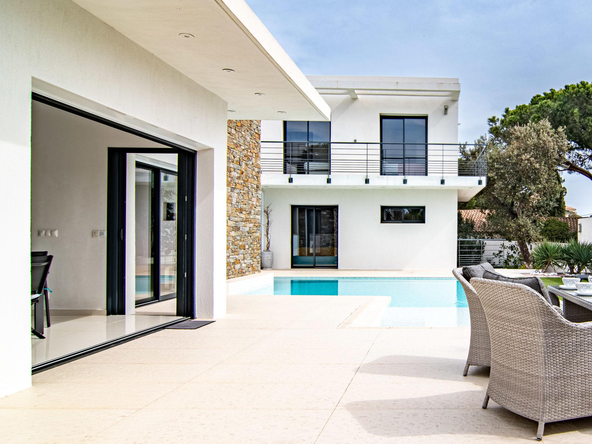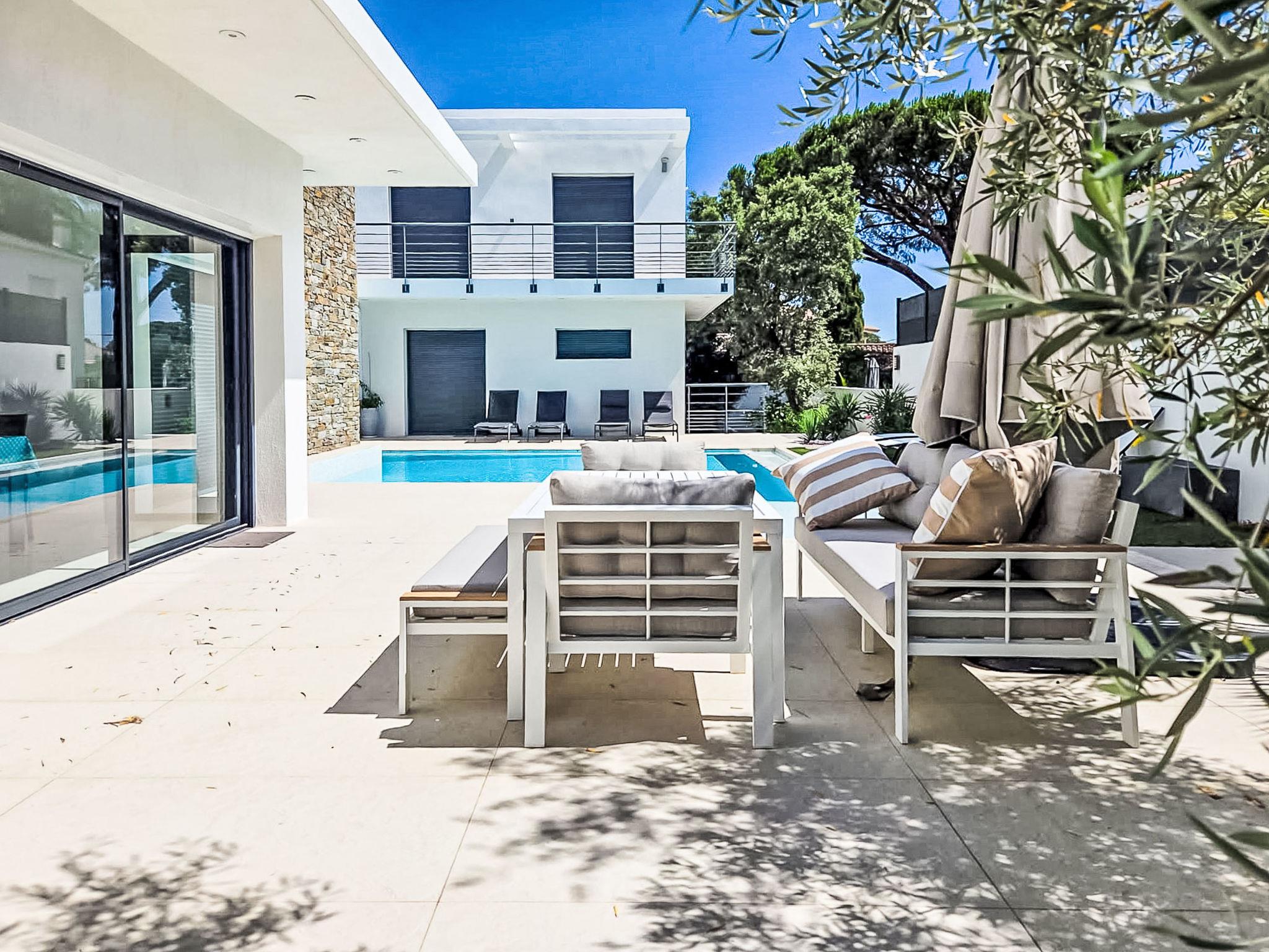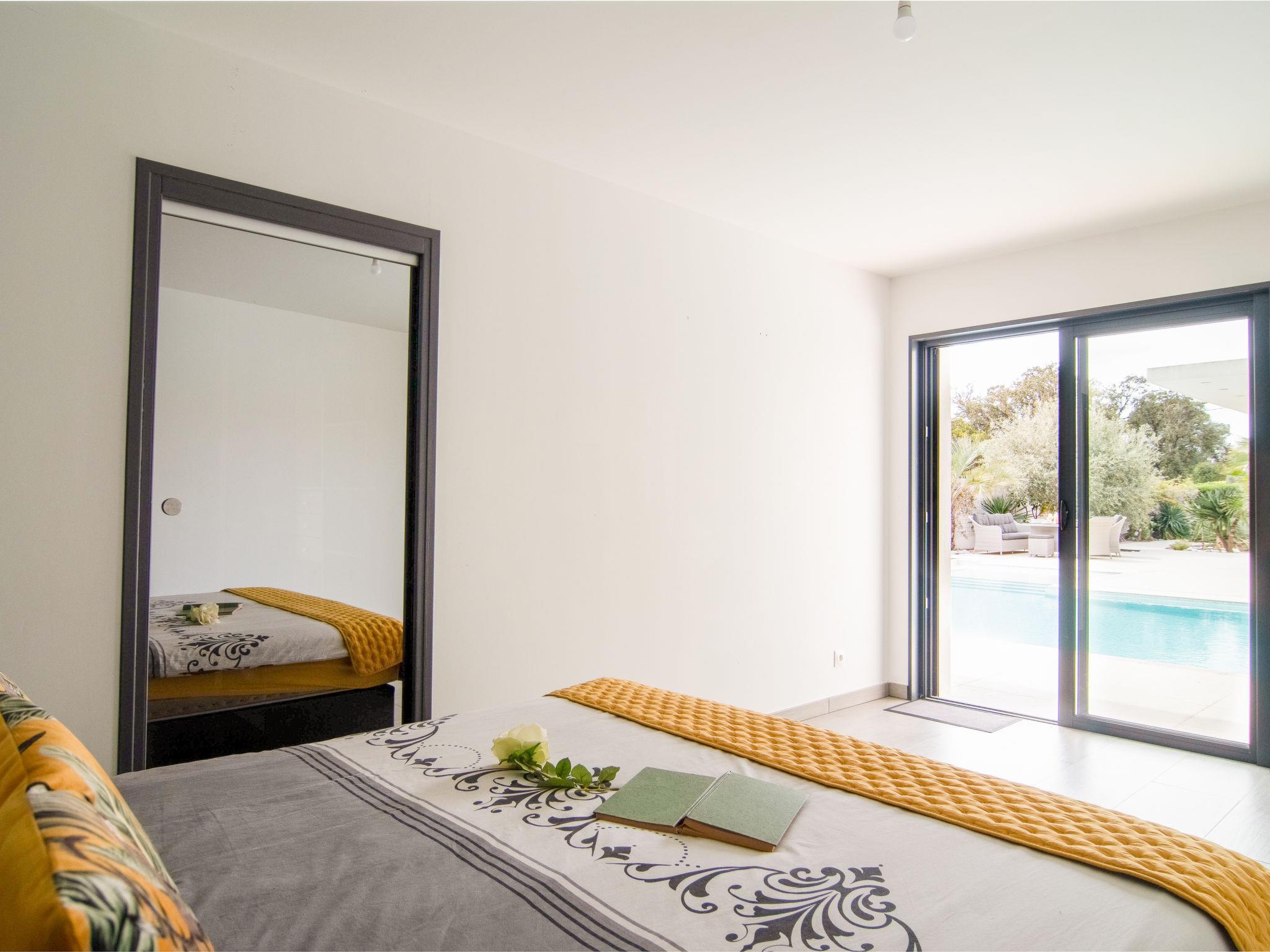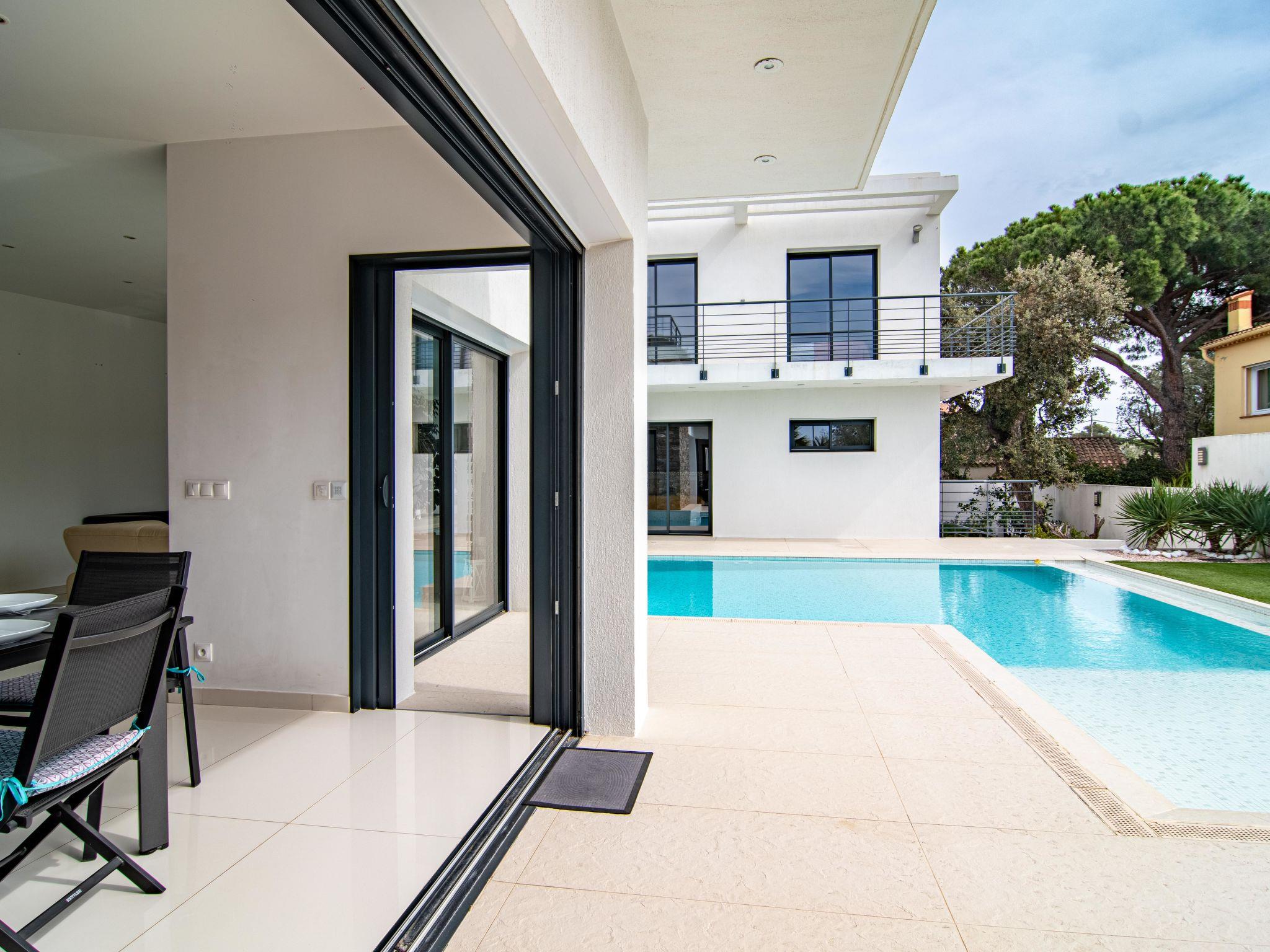 5-room villa 250 m2 on 2 levels. Very modern and cosy furnishings: large living/dining room with panoramic window with TV (flat screen), electric shutters. Exit to the swimming pool. 1 large room with panoramic window Dressing room with 1 french bed (1 x 160 cm, length 200 cm), bath/shower/WC, double hand-basin and TV (flat screen), electric shutters. Exit to the terrace. Open kitchen (oven, dishwasher, 4 induction hot plates, toaster, kettle, microwave, freezer, electric coffee machine, Capsules for coffee machine (Nespresso) extra, cooking island). Sep. WC. Air-conditioning. Upper floor: 1 room with panoramic window with 1 french bed (1 x 160 cm, length 200 cm), TV (flat screen), electric shutters. Exit to the terrace. 1 room with panoramic window with 1 french bed (1 x 140 cm, length 200 cm), TV (flat screen), electric shutters. Exit to the terrace. 1 room with 1 french bed (1 x 140 cm, length 200 cm), TV (flat screen). Bathroom, sep. WC, double hand-basin. Air-conditioning. Large terrace partly roofed. Terrace furniture, barbecue, deck chairs (8). Facilities: washing machine, iron, hair dryer. Internet (WiFi, free). Parking, garage. Please note: smoke alarm. Offer by a private individual according to Art. 155, IV of CGI. MHFIFJ