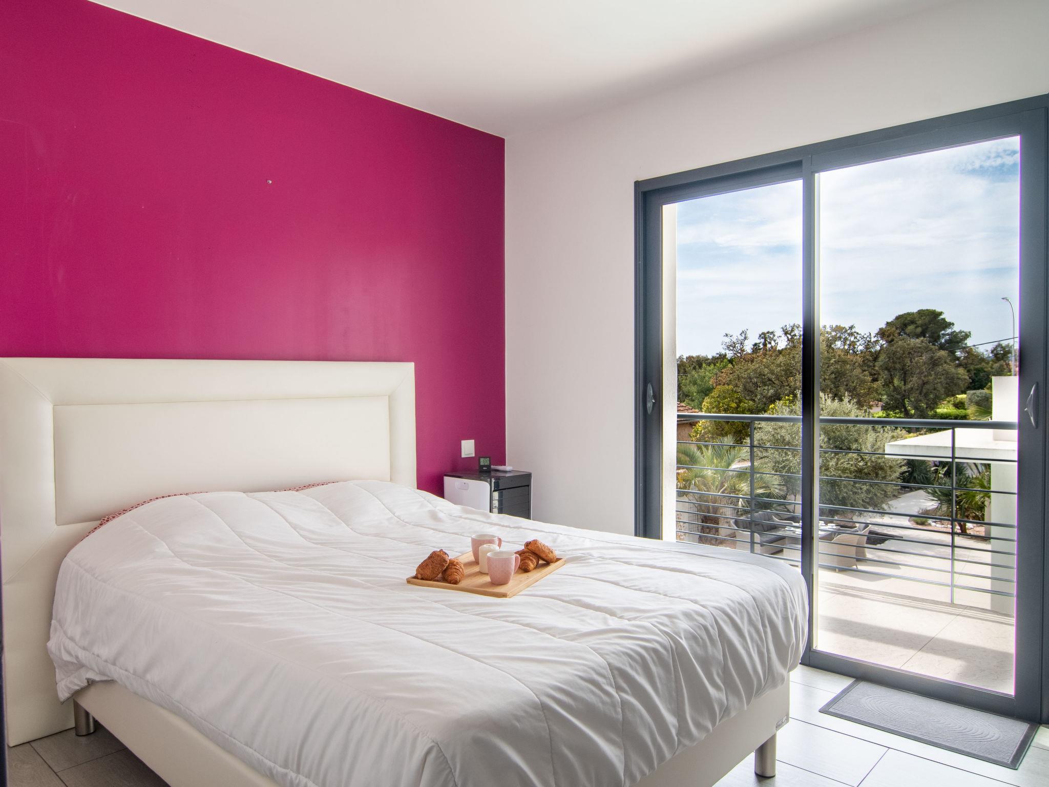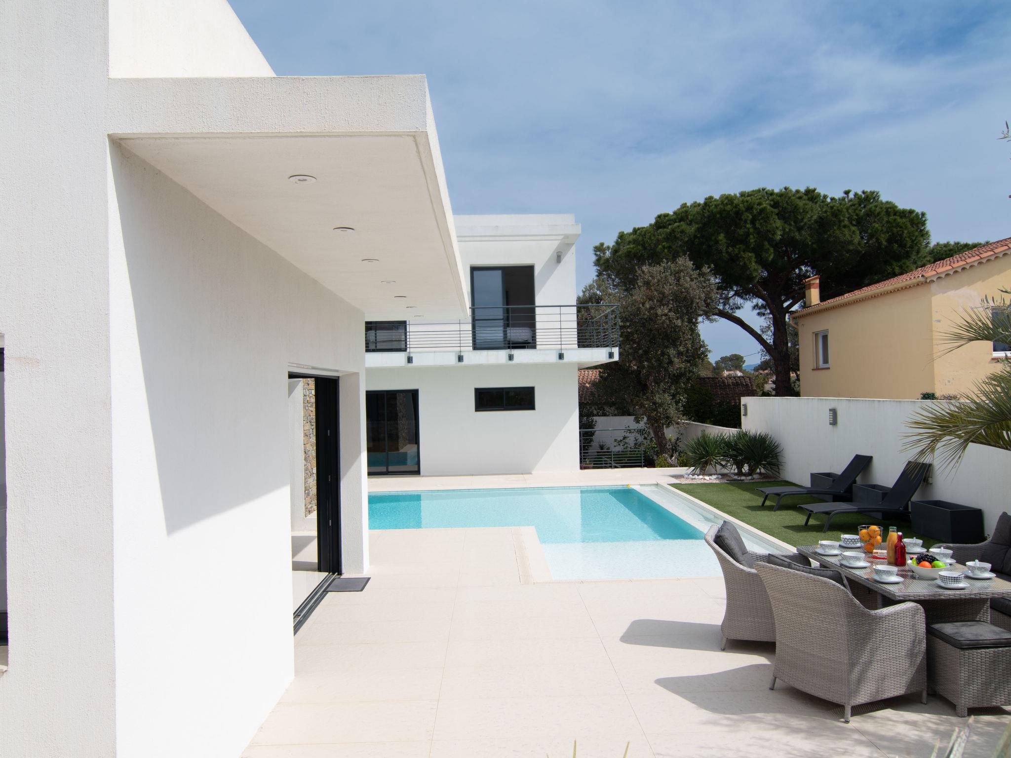 Single-family house "L'Oustaloun", 2 storeys, built in 2015. In the resort, 150 m from the centre, excellent location: right in the centre but still quiet, 600 m from the sea, 900 m from the beach. Private: property 600 m2 (fenced), swimming pool angular, heated (9 x 8 m, seasonal availability: 01.Apr. - 04.Nov.) with alarm system. Outdoor shower, pool house with fridge, boules, terrace, barbecue. Shop 350 m, shopping centre 5 km, 5 minute walk to the centre, bus stop "Saint-Aygulf La Poste" 400 m, railway station "Fréjus" 6 km, sandy beach "Saint Aygulf" 1.5 km, park "Areca" 950 m, diving center 6 km, thermal baths "Thalasso de Port Fréjus" 6 km. Sports harbour 1.5 km, golf course (18 hole) 8 km, sailing school 7 km, riding stable 1 km, sports centre 500 m. Nearby attractions: Aqualand, Lunapark 5 km, Frejus 6 km, Saint Raphael 10 m, Saint Tropez 30 km, Cannes 45 km, Nice 71 km. Well-known ski regions can easily be reached: Auron, Isola 2000 150 km. Well-known lakes can easily be reached: Lac de St Cassien 45 km, Lac du Du Verdon 90 km. Hiking paths: Estérel 16 km, Sentier du Littoral 1 km. The owner does not accept any youth groups. Guarded residence. Residence with electric gates. Owner lives in separate semi-detached house.