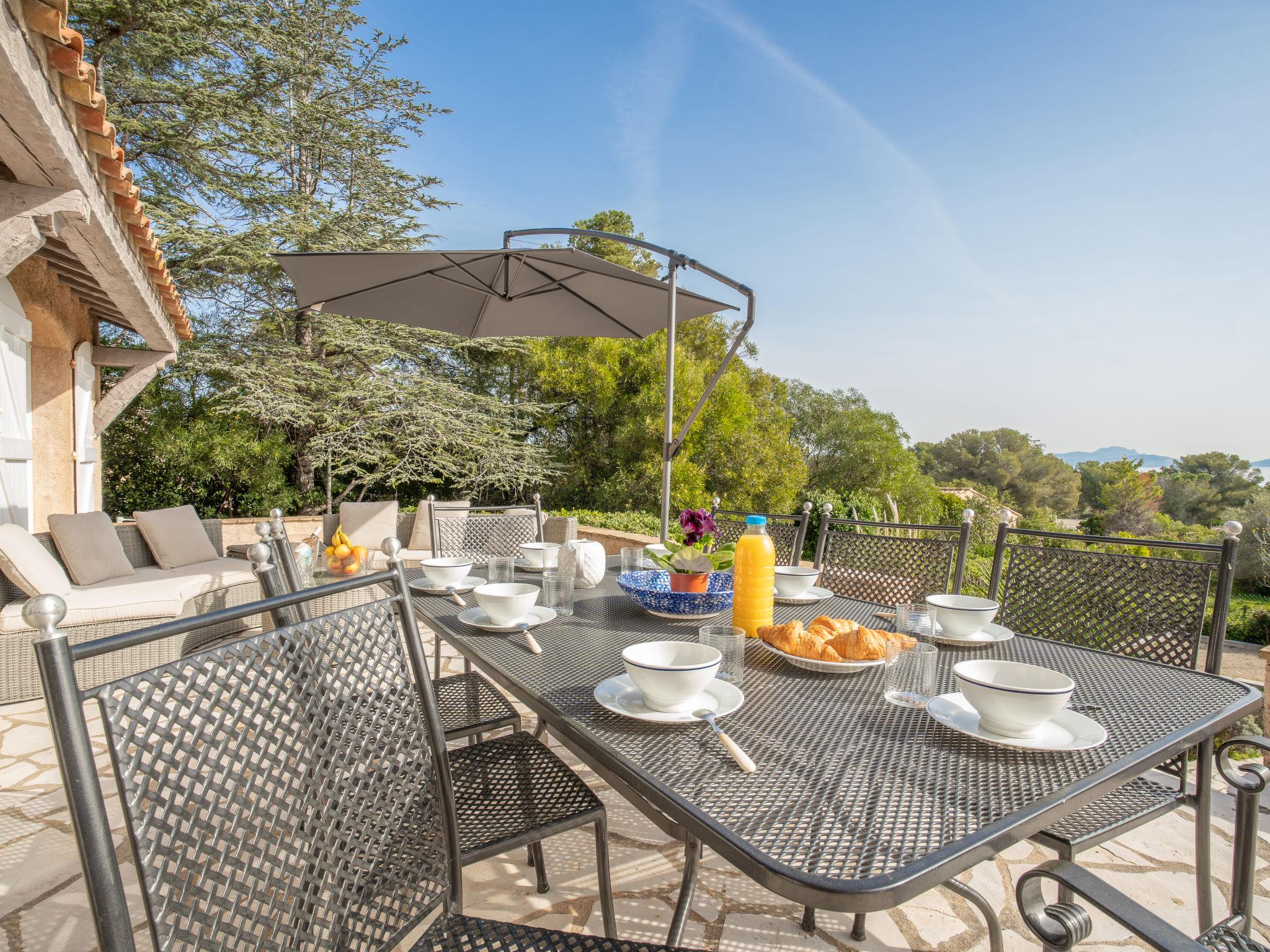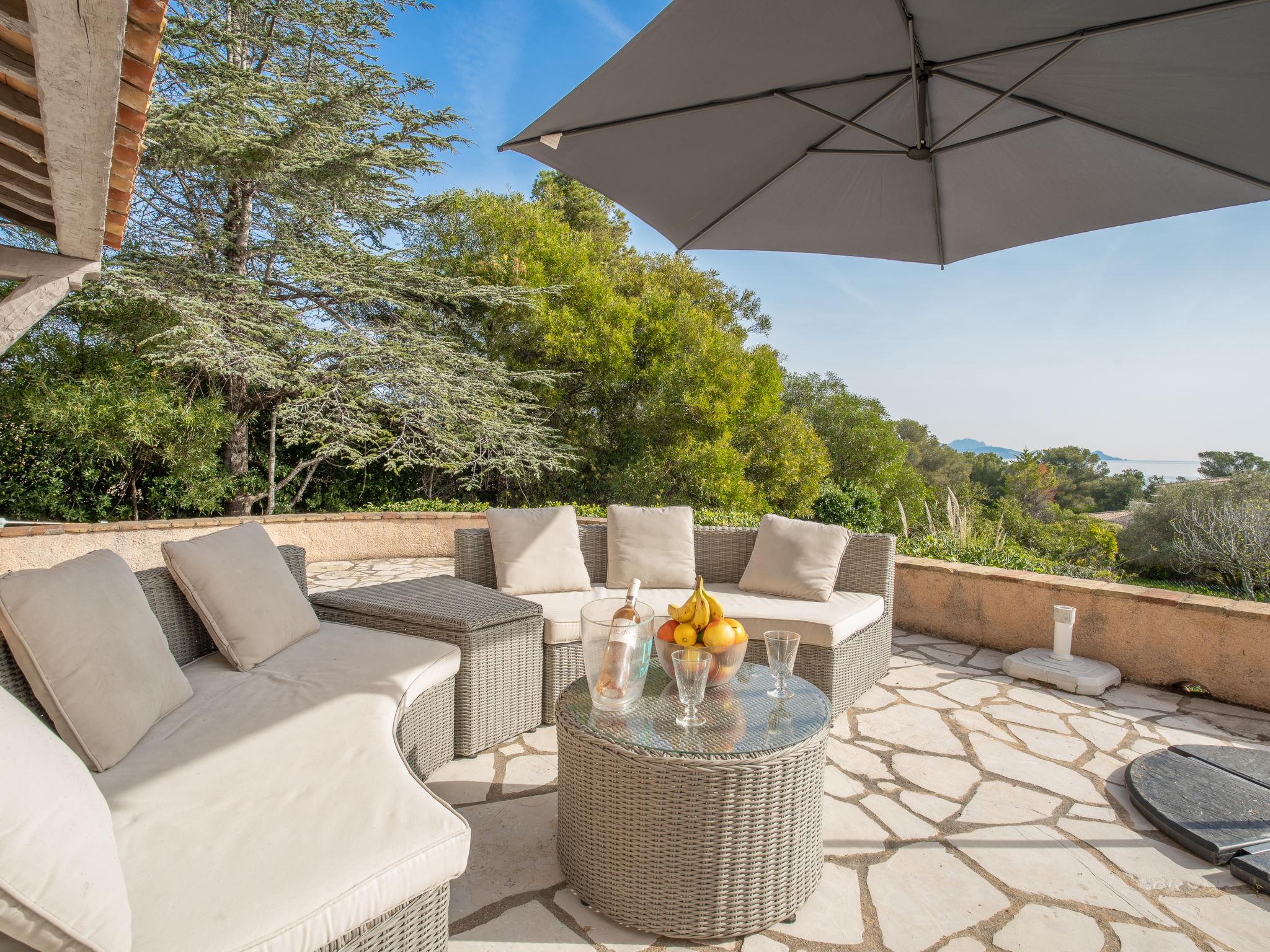 "L'Escarpe des Arbousiers", 6-room house 170 m2 on 2 levels. Bright, comfortable and tasteful furnishings: living room with dining table and TV. Exit to the terrace. Open dining room with dining table. Exit to the terrace. 1 room with 2 beds (90 cm, length 190 cm), air conditioning. Exit to the terrace. Mezzanine. 1 room with 1 french bed (140 cm, length 190 cm), bath/WC and air conditioning. Exit to the balcony. 1 room with 1 french bed (160 cm, length 200 cm), shower/WC and air conditioning. Kitchen (oven, dishwasher, 4 ceramic glass hob hotplates, microwave, electric coffee machine). Shower/WC. Upper floor: 1 room with 1 french bed (140 cm, length 190 cm), air conditioning. Electric heating. Large terrace 25 m2, south-east facing position. Terrace furniture, deck chairs. Very beautiful panoramic view of the sea and the bay. Facilities: washing machine, iron, baby cot. Internet (WiFi, free). Please note: smoke alarm.