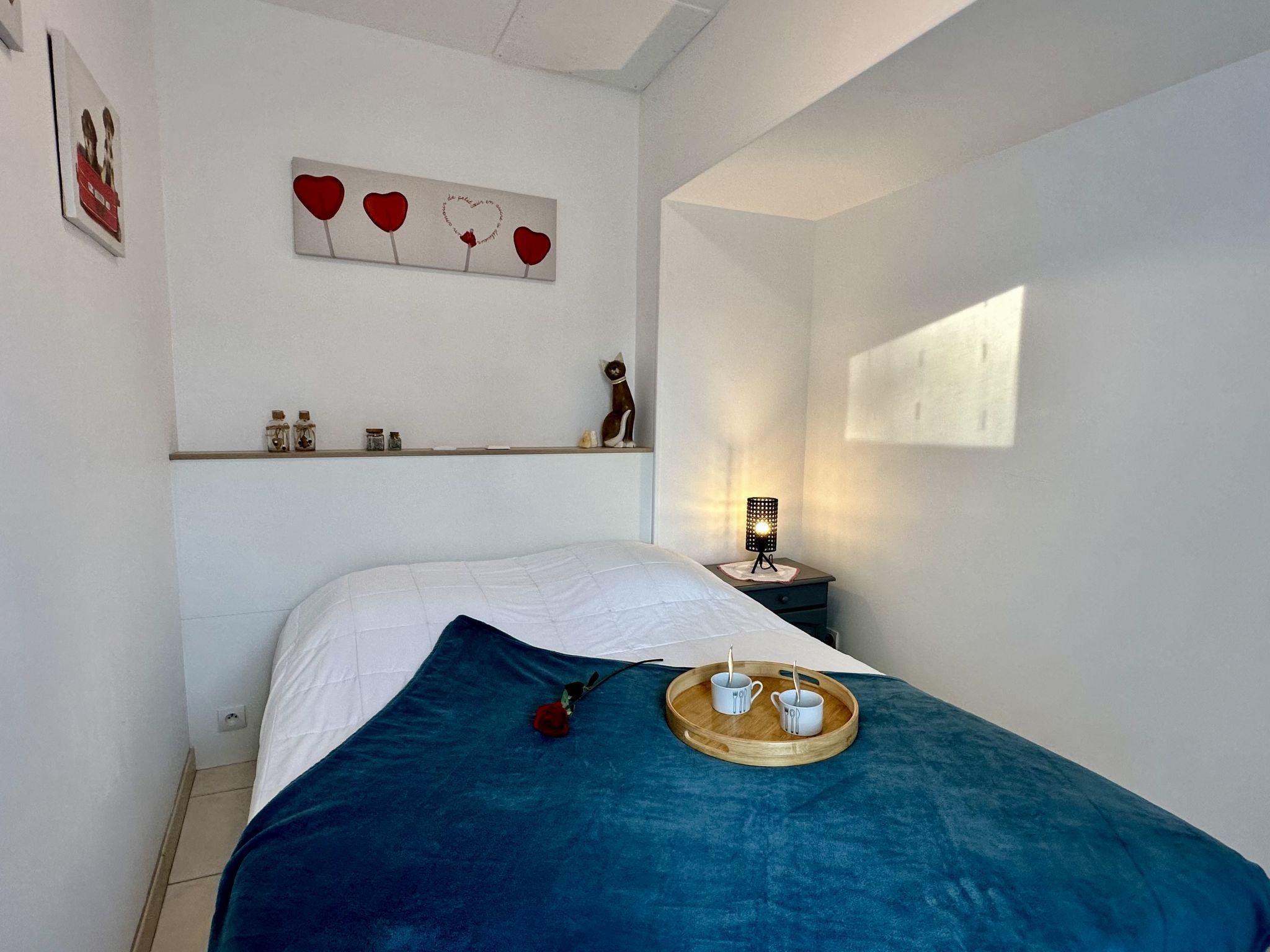 "Joannie", 2-room house 45 m2, south facing position. Comfortable furnishings: living/dining room with panoramic window with 1 double sofabed (1 x 140 cm, length 200 cm), TV (flat screen). Exit to the terrace. 1 room with 1 french bed (1 x 140 cm, length 200 cm). Exit to the terrace. Open kitchen (oven, dishwasher, 3 induction hot plates, toaster, kettle, microwave, electric coffee machine). Shower, sep. WC. Electric heating. Large terrace 50 m2, south facing position. Terrace furniture, barbecue, deck chairs (2). Facilities: washing machine, iron, hair dryer. Internet (WiFi, free). Please note: non-smoking house. Smoke alarm. Offer by a private individual according to Art. 155, IV of CGI.