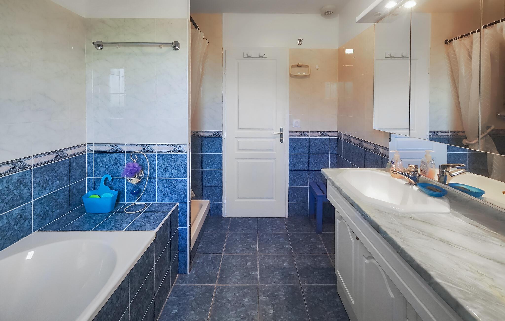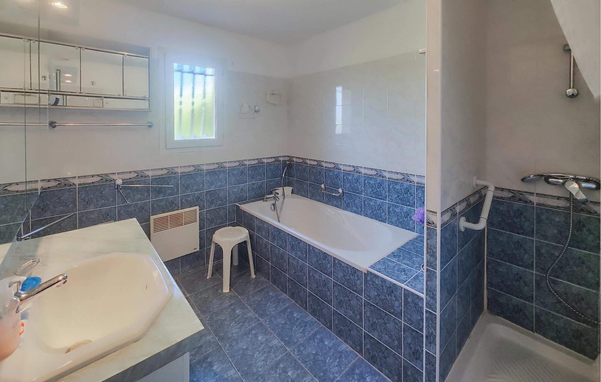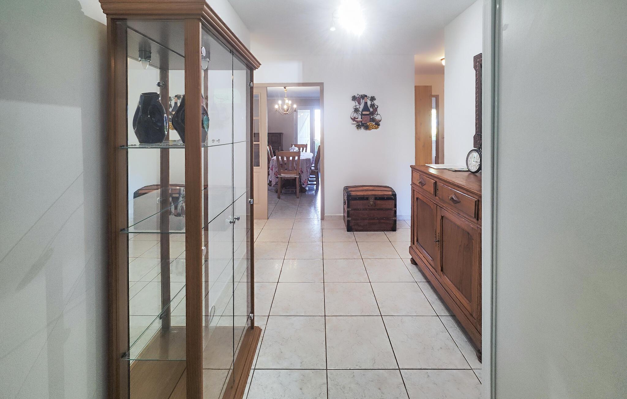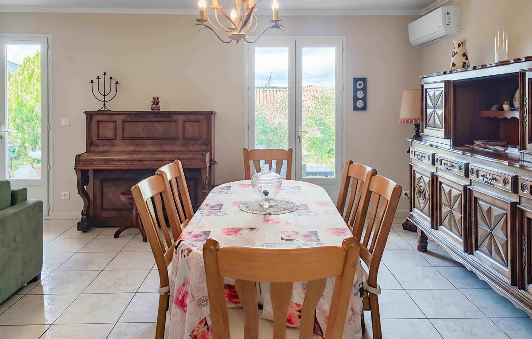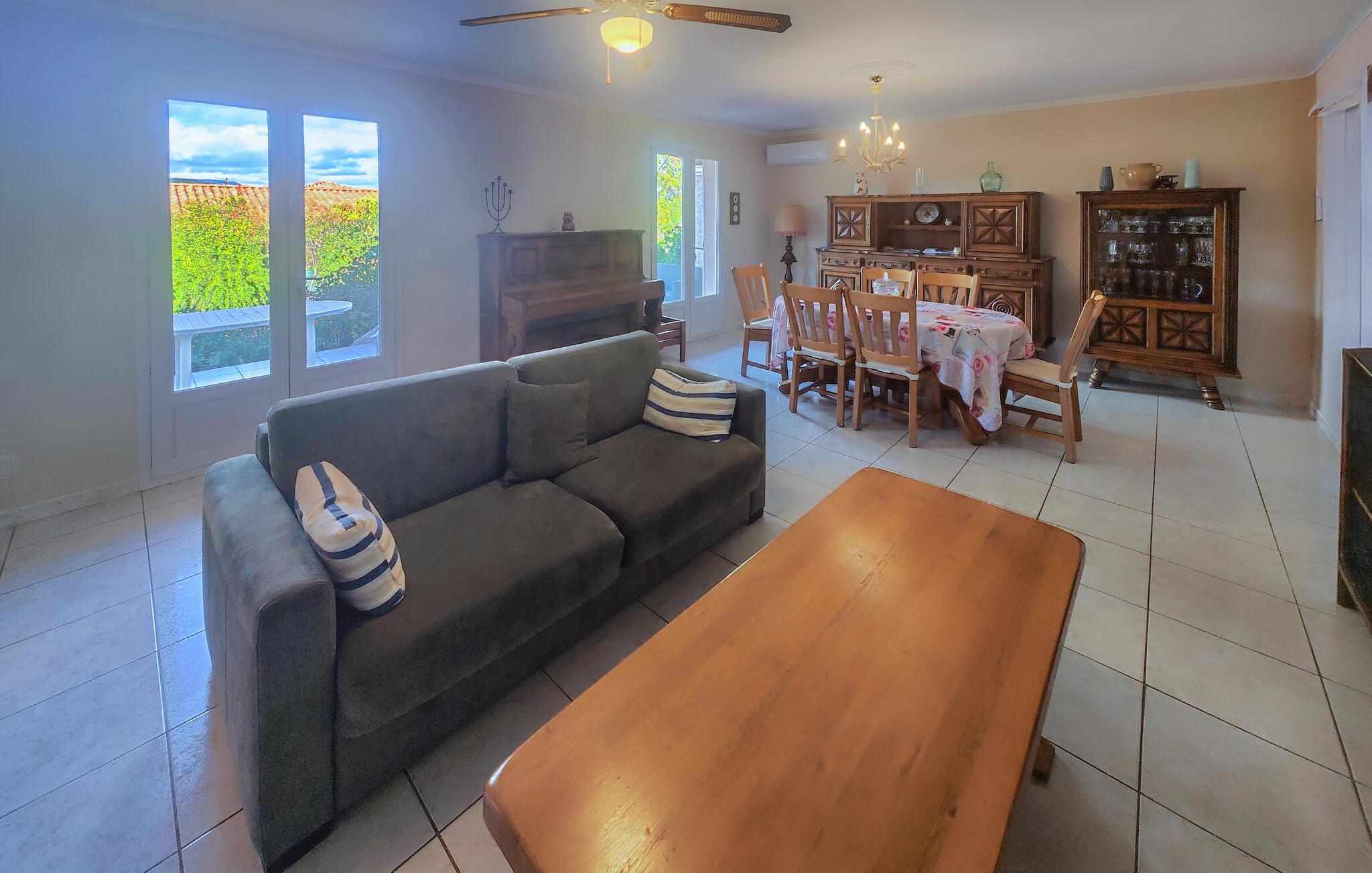 Umgeben von den Weinbergen und Hügeln des Languedoc, finden Sie hier den idealen Ort, um zu entspannen und die Natur zu genießen. Der helle Wohnbereich ist großzügig gestaltet und mit geschmackvollen Holzmöbeln eingerichtet. Entspannen Sie auf dem bequemen Sofa, lesen Sie ein Buch aus dem gut bestückten Regal oder genießen Sie einen Filmabend im gemütlichen Wohnzimmer. Bereiten Sie in der Küche Ihre Lieblingsgerichte zu. Am Esstisch finden Familie und Freunde Platz für gemeinsame Mahlzeiten.