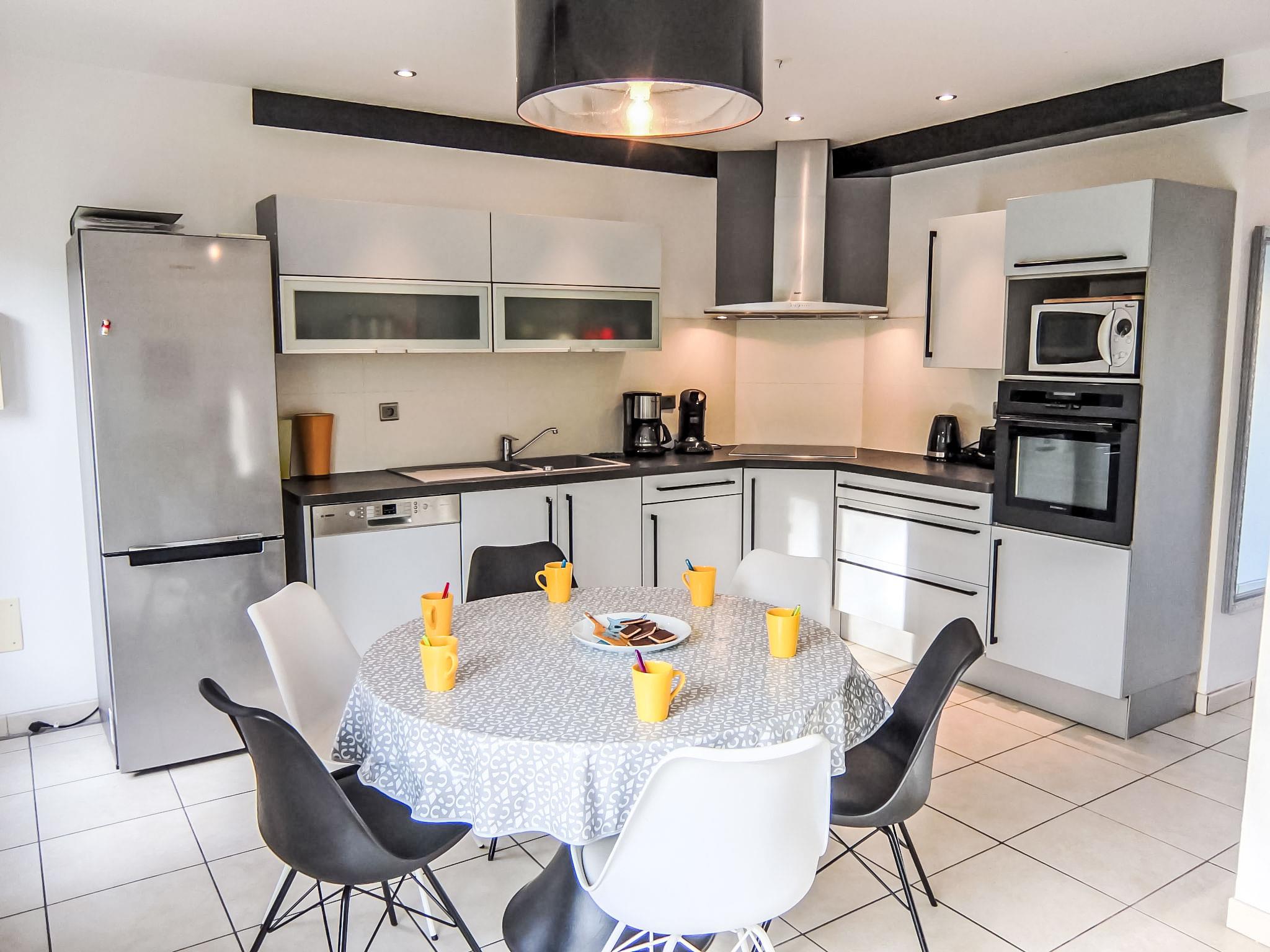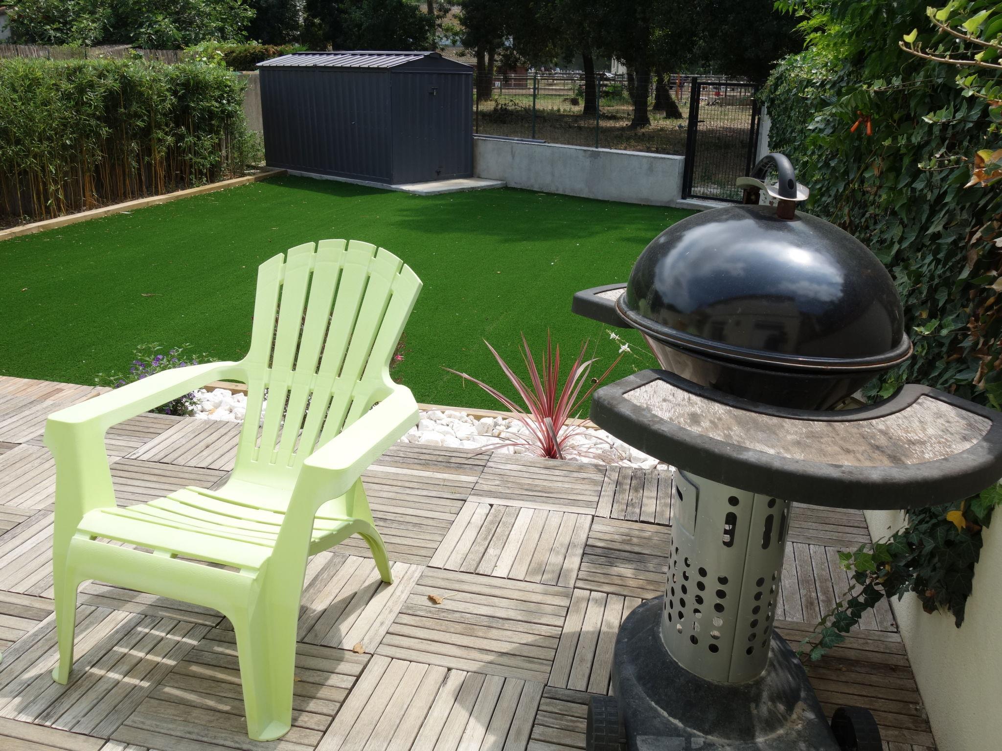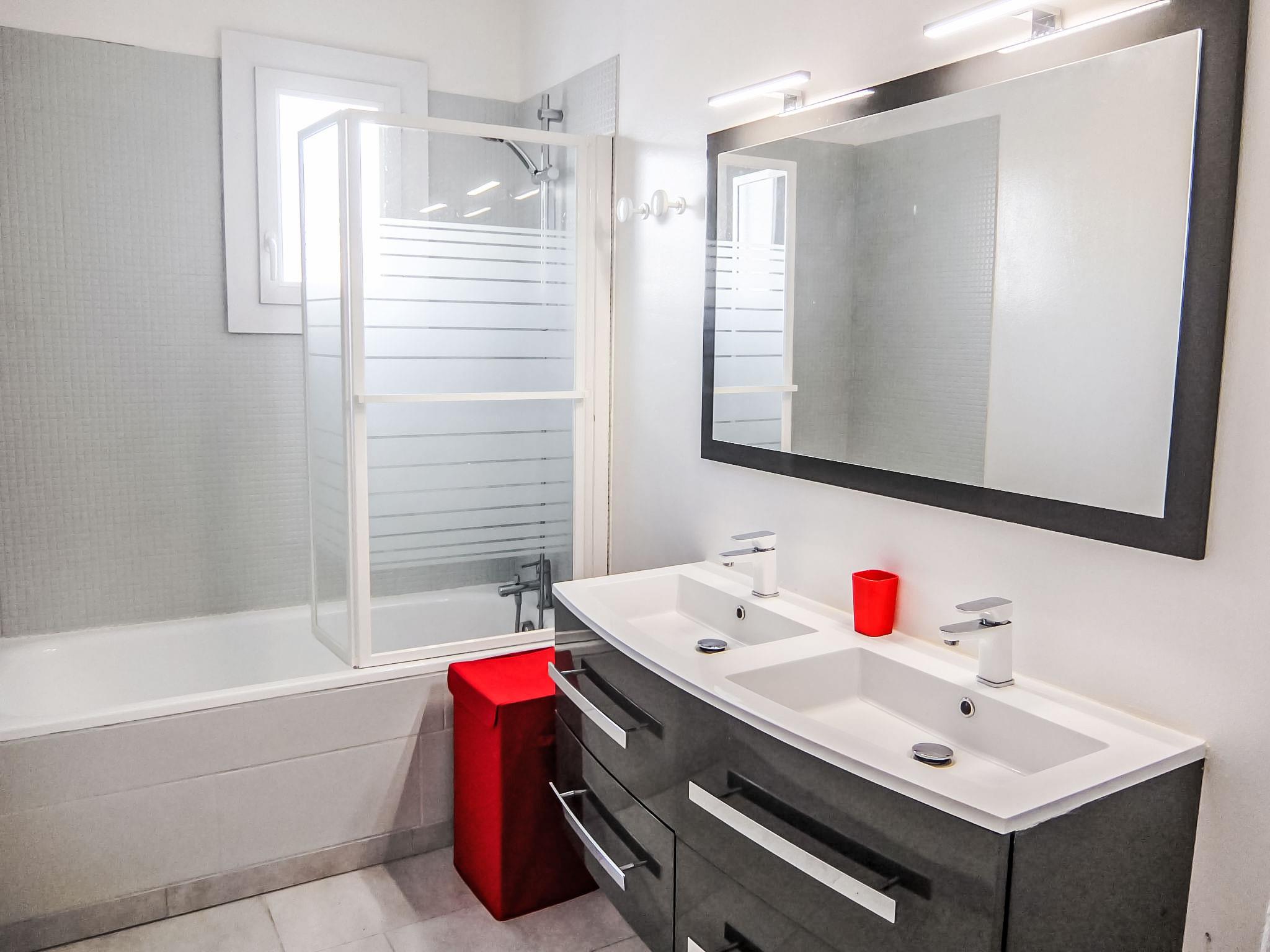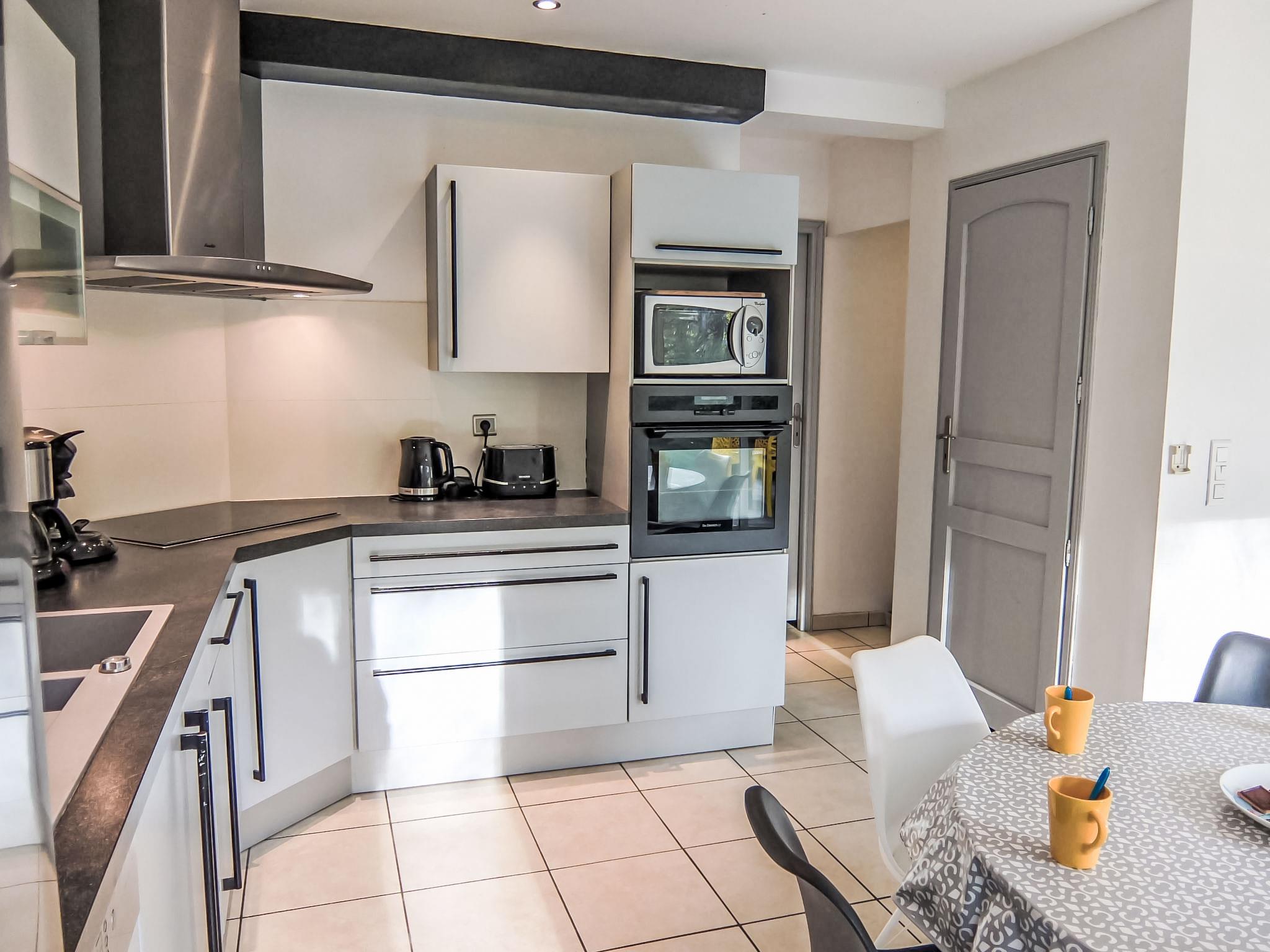 5-room terraced house 120 m2 on 2 levels. Comfortable furnishings: living/dining room with TV and air conditioning. Exit to the garden, to the terrace. Open kitchen (oven, dishwasher, 3 induction hot plates, microwave, freezer). Shower/WC. Heating, air-conditioning. Upper floor: playroom. Exit to the balcony. 2 rooms, each room with 1 french bed (140 cm). 1 room with 2 beds (90 cm). Bathroom, sep. WC. Terrace 40 m2, west facing position. Terrace furniture, barbecue. Facilities: washing machine, baby cot. Internet (WiFi, free). Please note: non-smoking house. Smoke alarm.