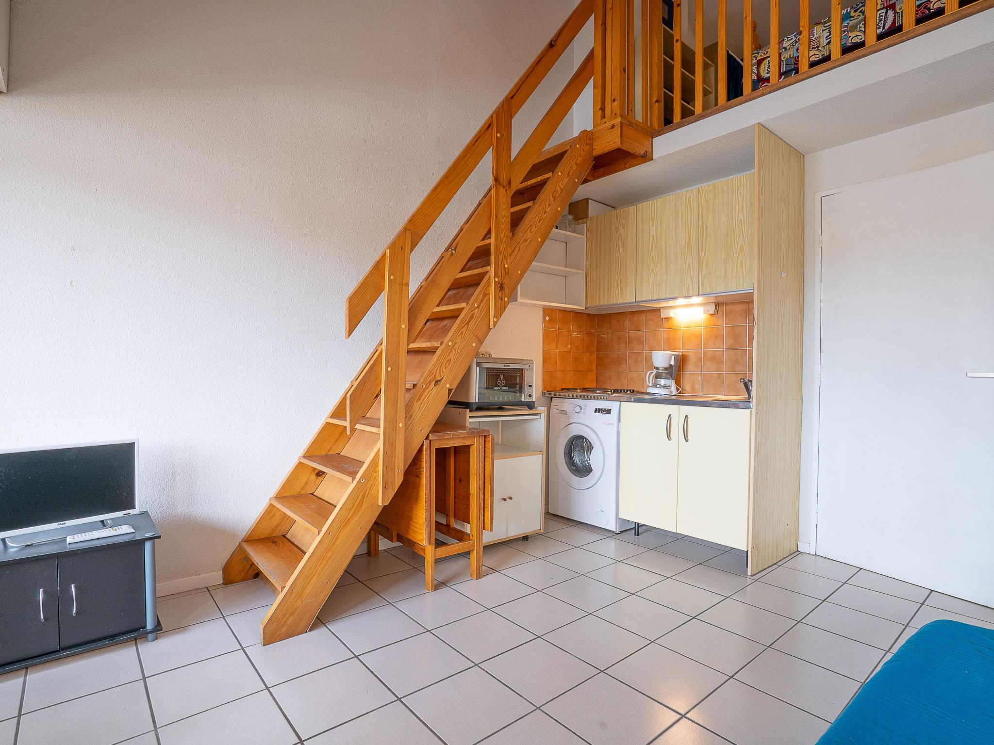 2-room apartment 35 m2 on 2 levels on 2nd floor. Practical furnishings: living/dining room with TV (flat screen). Exit to the loggia. 1 small room with 1 french bed (140 cm, length 190 cm). Kitchenette (4 hot plates, mini-oven, microwave, freezer, electric coffee machine). Shower, sep. WC. Electric heating. Upper floor: (steep stair) gallery with sloping ceilings with 2 beds (90 cm, length 190 cm). Covered balcony. View of lagoon. Facilities: washing machine. Internet (WiFi, extra). Parking. Please note: smoke alarm. Instead of an enclosed bedroom, some sleeping areas are located in an open-plan area (gallery, alcove, etc.). 661710192478