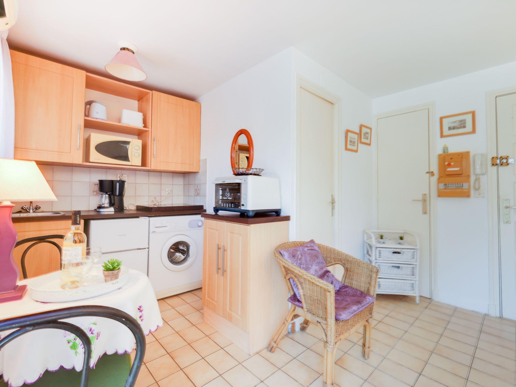1-room studio 20 m2 on 1st floor, west facing position. Practical furnishings: living/dining room with 1 pull-out bed (2 pers. 2 x 80 cm, length 190 cm), TV (flat screen), air conditioning. Kitchenette (mini-oven, 4 ceramic glass hob hotplates, microwave, freezer, electric coffee machine). Shower/WC. Balcony 8 m2, west facing position. Facilities: washing machine. Internet (WiFi, extra). Please note: apartment street side.