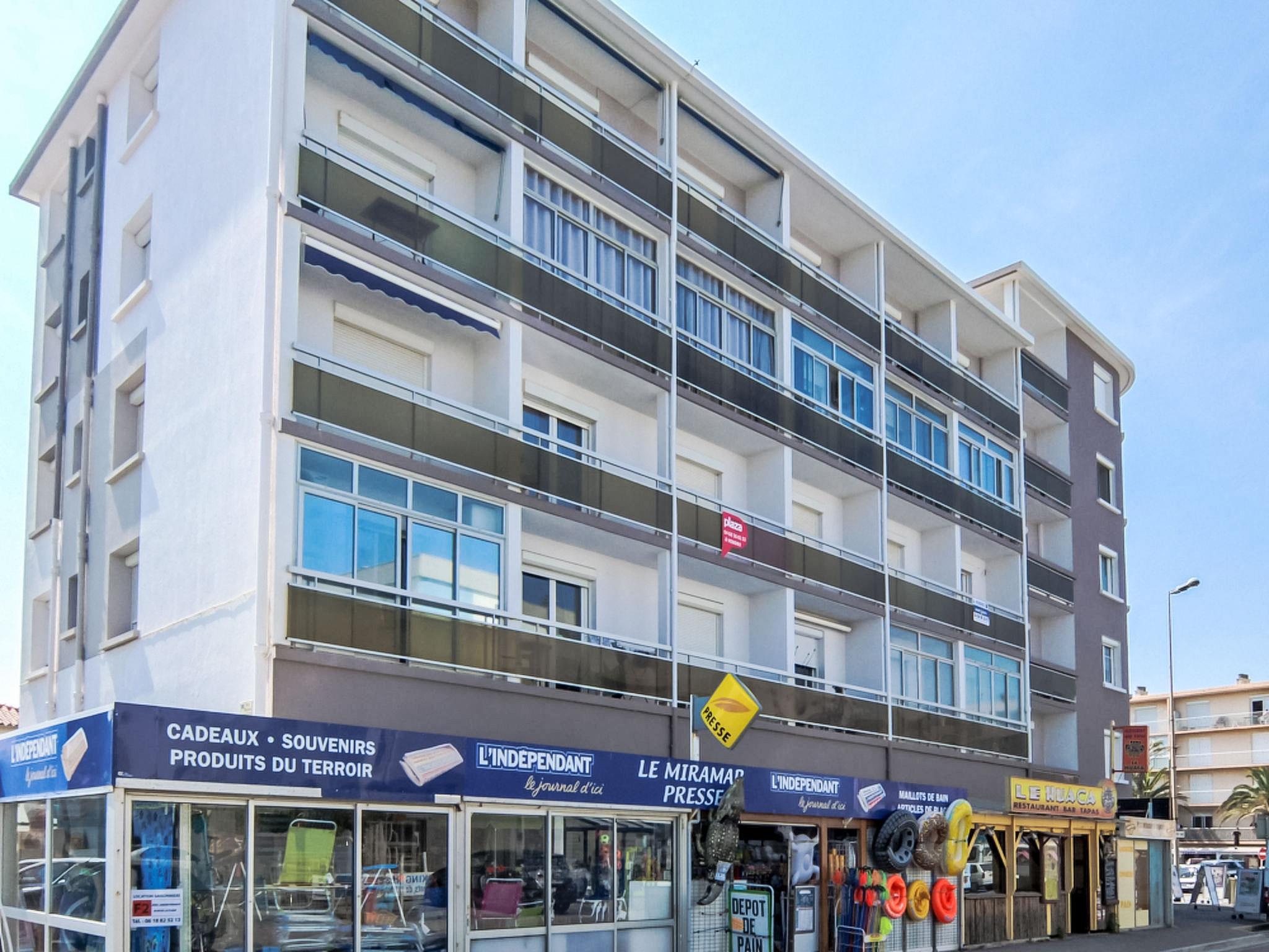 Residence "Le Miramar", 6 storeys. In the district of Place Maillol, in a central, busy position, 100 m from the sea, 100 m from the beach. In the house: lift. Public parking on the road extra. Shop 50 m, supermarket 800 m, restaurant 50 m, bakery 300 m, bus stop 350 m, railway station "Elne" 8 km, sandy beach "Plage Maillol" 100 m. Sports harbour 800 m, golf course (27 hole) 2.7 km, sailing school 3 km, minigolf 1.4 km, riding stable 2.2 km, sports centre 3.5 km. Nearby attractions: Aqualand 4.7 km.