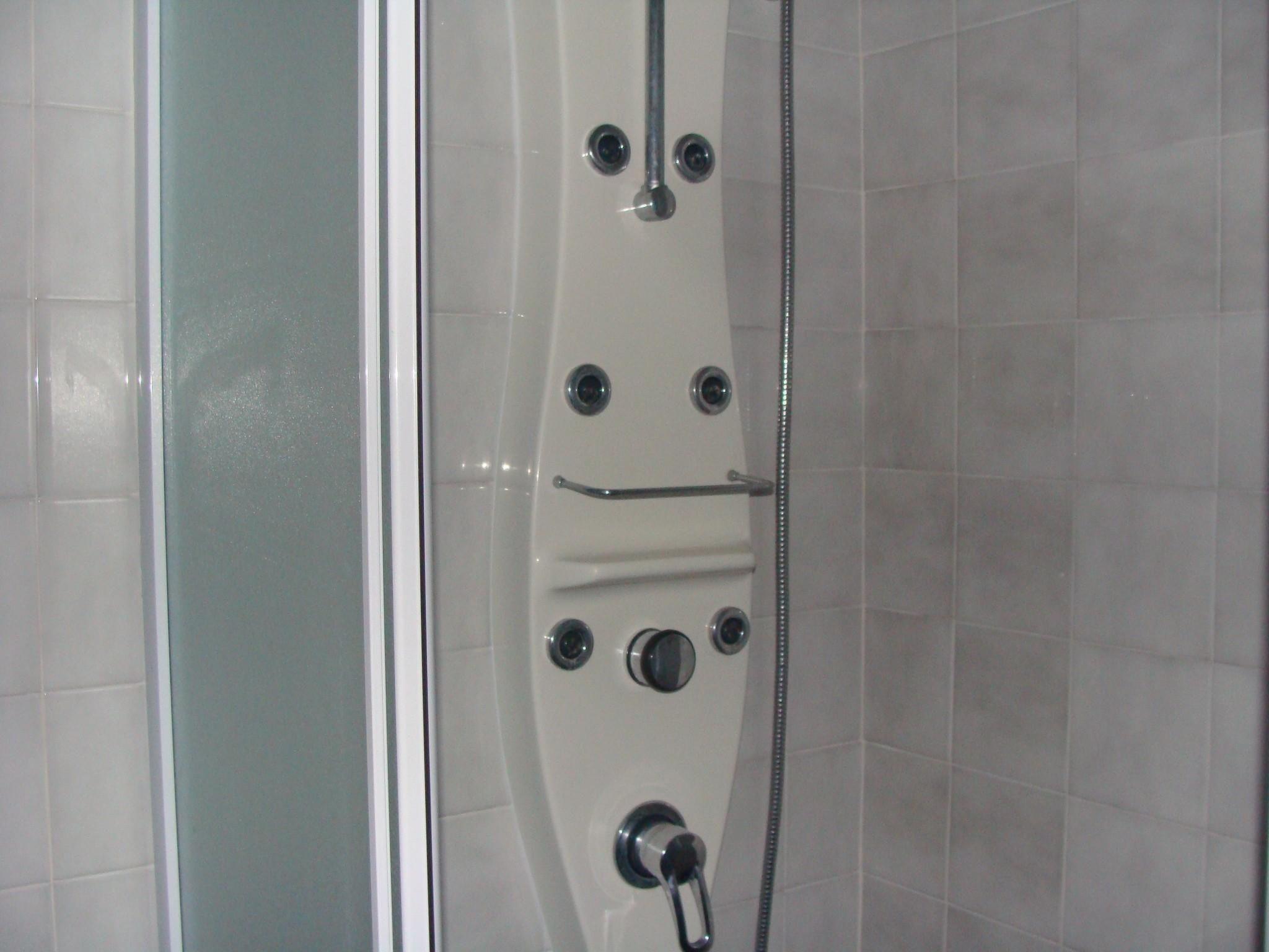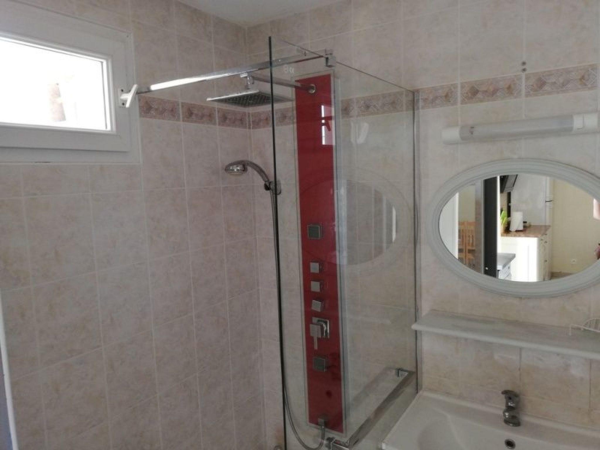 The living room on the ground floor also has a fold-out sofa bed (140cm wide when folded out) for two people. The ground floor of the holiday house also has a bedroom with a double bed (140cm wide) and a bathroom with a shower cubicle with massage jets. The toilet is in a separate room. The kitchen is equipped with a washing machine, a dishwasher, a fridge with a freezer compartment, an oven, a microwave, a ceramic hob with two rings, a toaster and an electric Plancha grill. All the rooms have electric radiators. There are ceiling fans in the bedrooms.