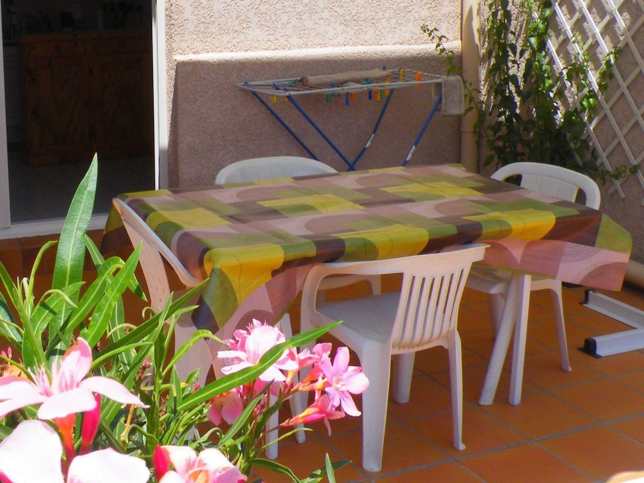 An electric griddle is available. The flat has a walk-through layout and is located entirely within the residence. The south-facing patio is very bright and under the large, double-sloped awning, you can enjoy breakfast in the fresh air.