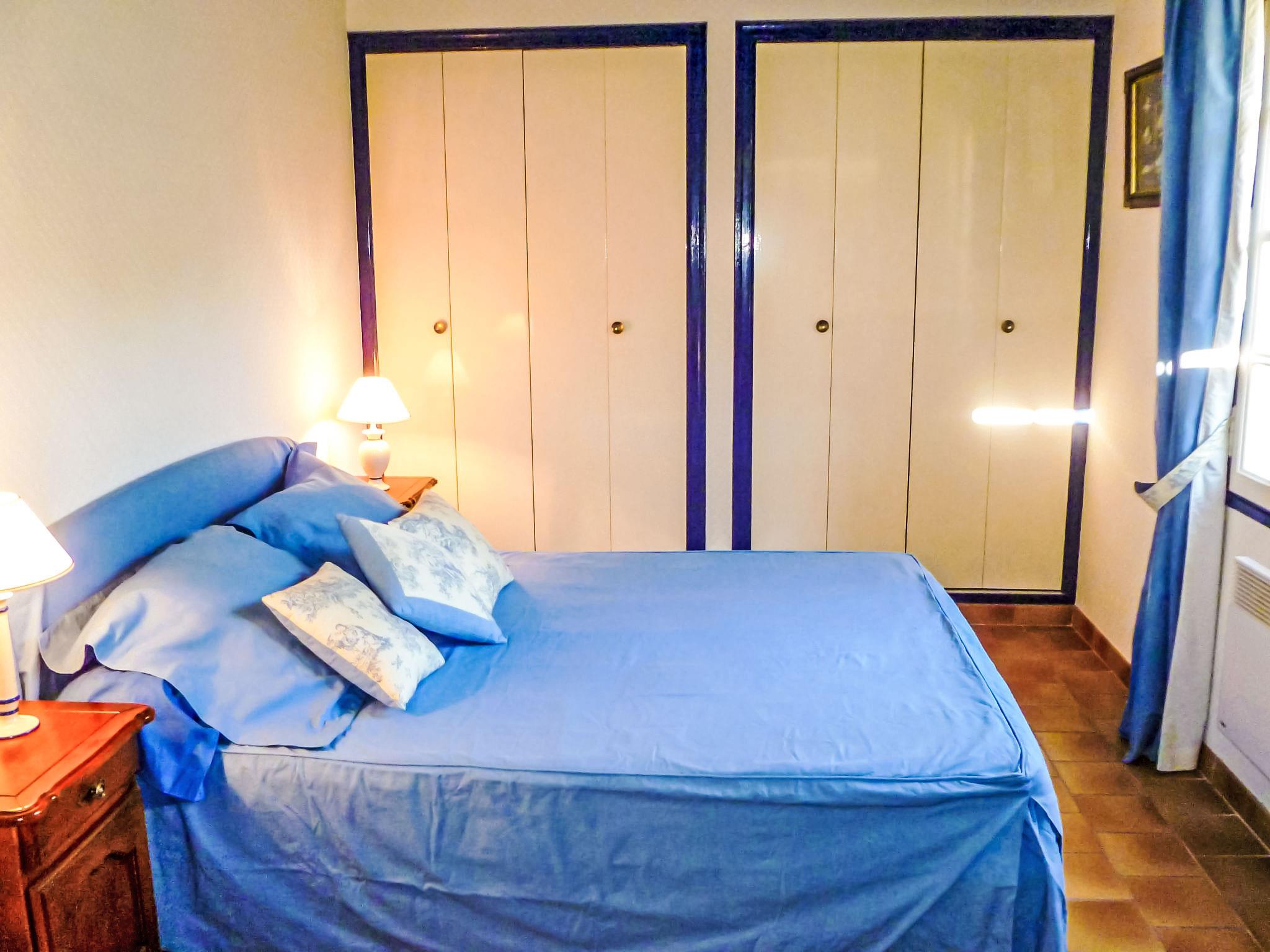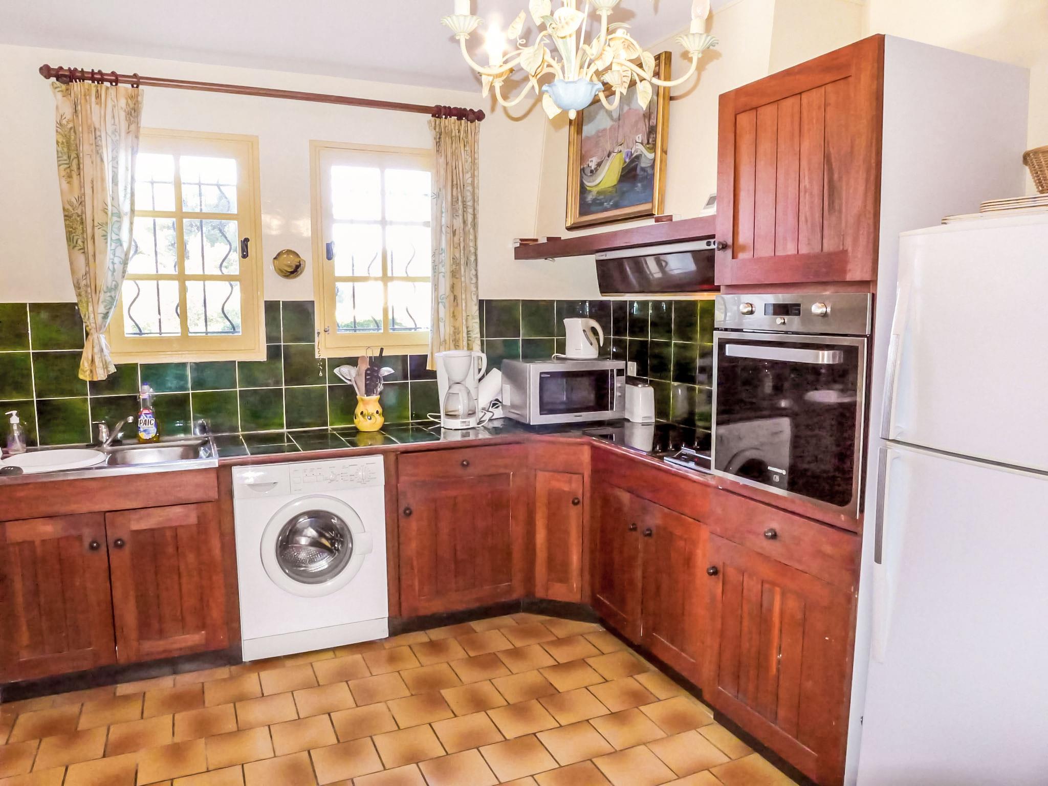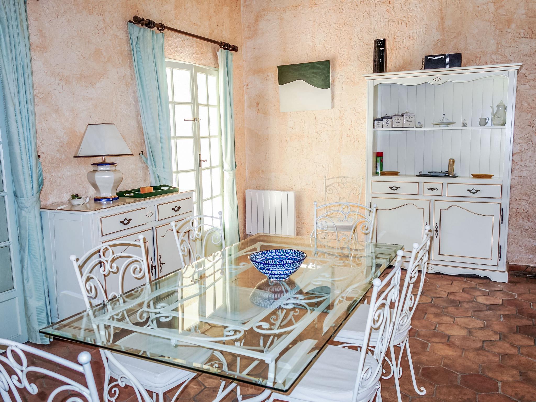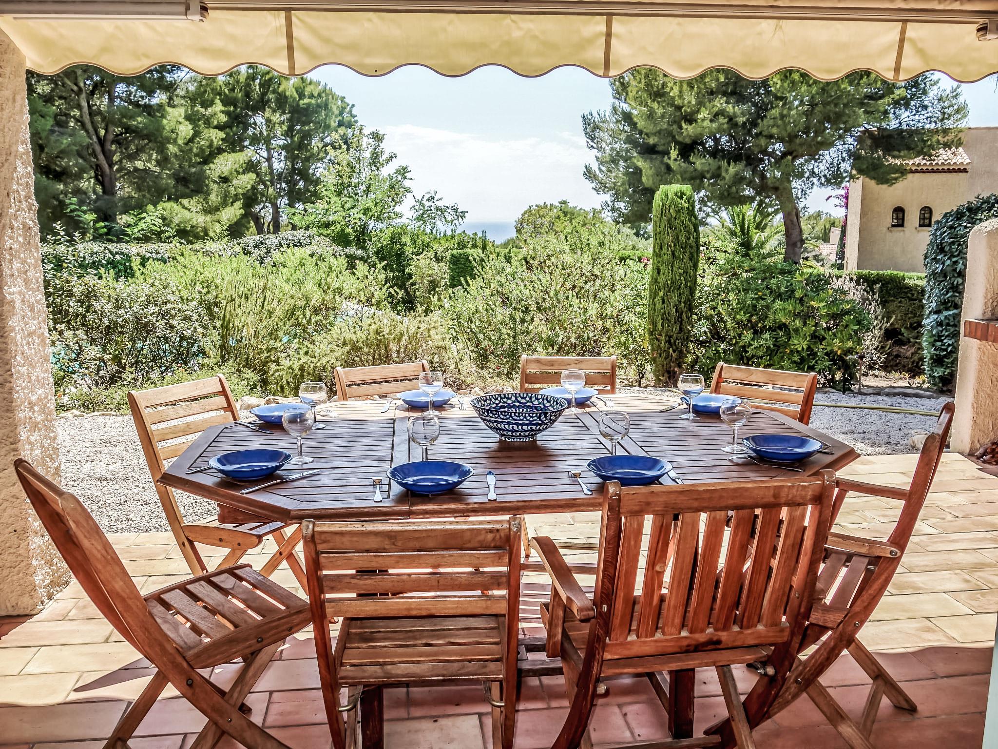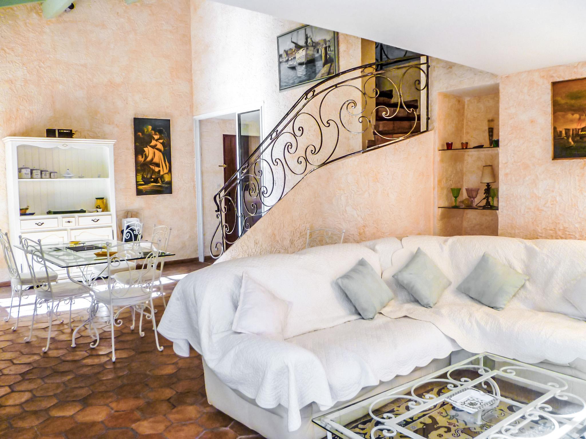 5-room villa 145 m2 on 2 levels. Comfortable furnishings: living/dining room with TV, hi-fi system, DVD and air conditioning. Exit to the terrace. 1 room with 1 french bed (160 cm, length 200 cm), bath/shower and air conditioning. Kitchen (oven, dishwasher, 3 ceramic glass hob hotplates, freezer, electric coffee machine, combination microwave). Sep. WC. Upper floor: 1 room with 2 beds (90 cm, length 200 cm). 1 room with 2 beds (80 cm, length 190 cm). 1 room with 1 french bed (160 cm, length 200 cm). Exit to the balcony. Shower, sep. WC, double hand-basin. Electric heating. Balcony 10 m2, south-west facing position, terrace 30 m2, roofed, south-west facing position. Terrace furniture, electric barbecue. Partial view of the sea. Facilities: washing machine, iron, baby cot for up to 2 year olds. Internet (WiFi, free). Parking (fenced 3 cars). Please note: TV only FR. Smoke alarm. 83112 000182 WX