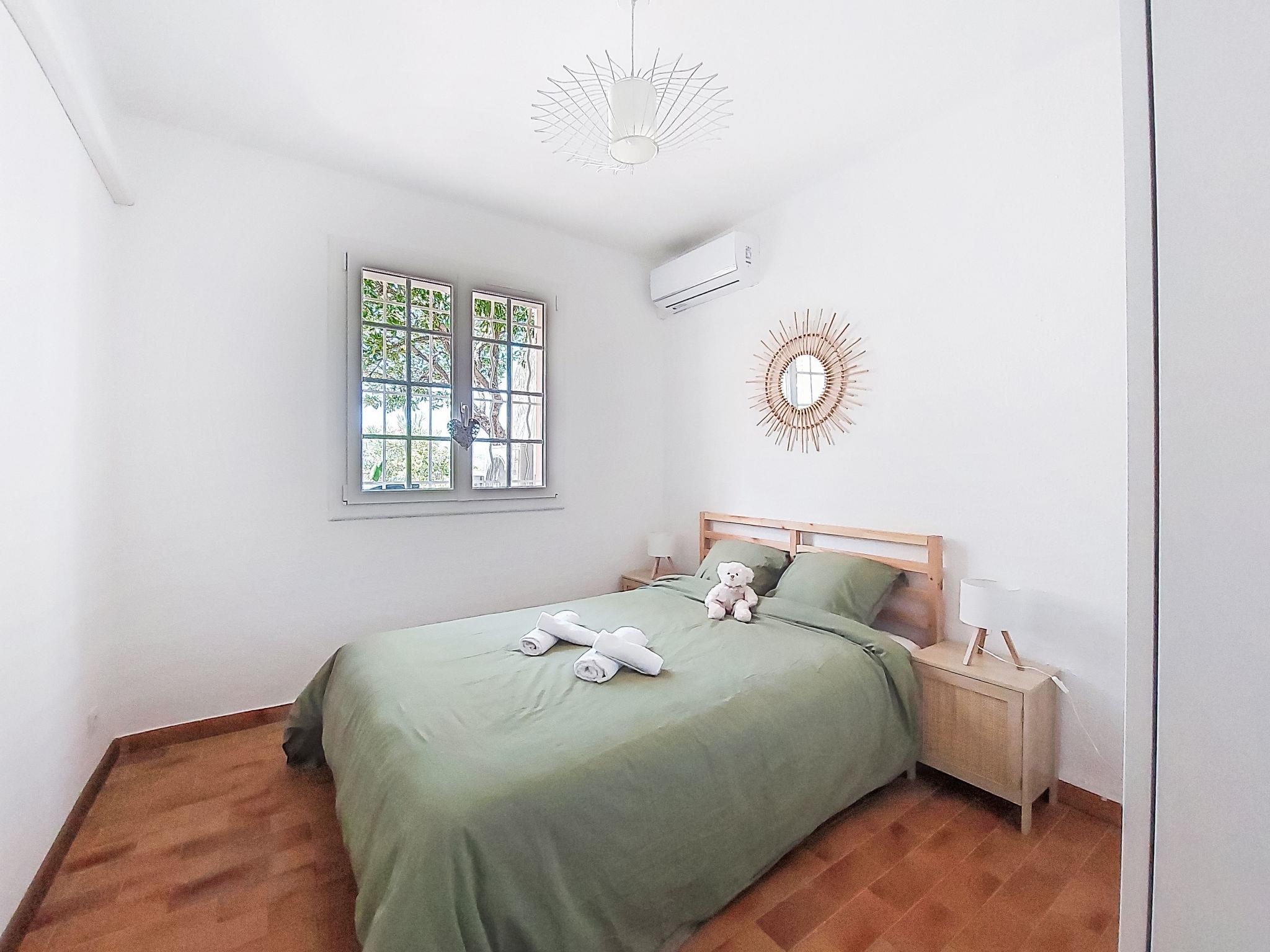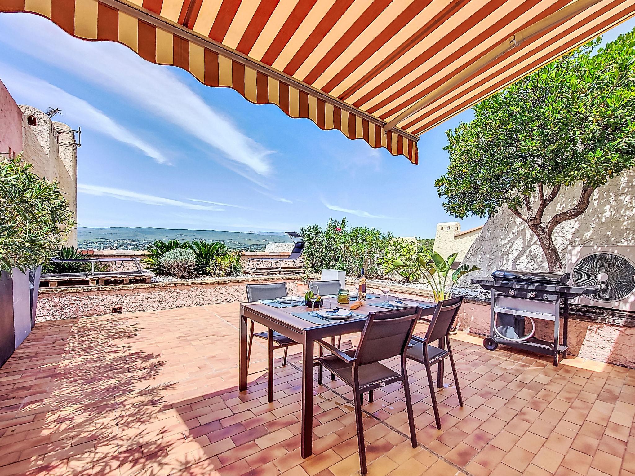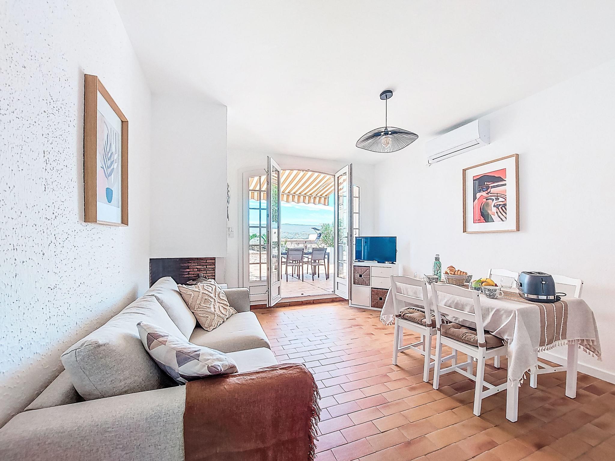 2-room apartment 43 m2 on 2nd floor. Comfortable and beautiful furnishings: living/dining room with 1 sofabed (140 cm, length 190 cm), open-hearth fireplace (only for decoration), TV and air conditioning. Exit to the terrace. 1 room with 1 french bed (140 cm, length 200 cm), air conditioning. Open kitchen (oven, 3 induction hot plates, toaster, kettle, microwave, freezer, electric coffee machine). Shower/WC. Forced-air heating. Large terrace 40 m2. Terrace furniture, barbecue. View of the sea. Facilities: washing machine. Internet (WiFi, extra). Please note: non-smokers only. TV only FR. Smoke alarm, no lift. Offer by a private individual according to Art. 155, IV of CGI. 83112 001790SR