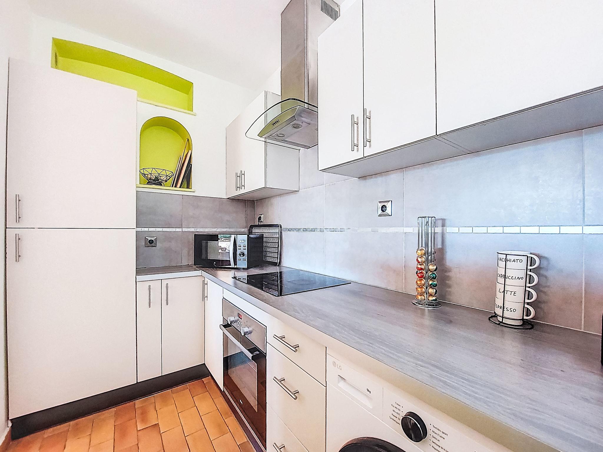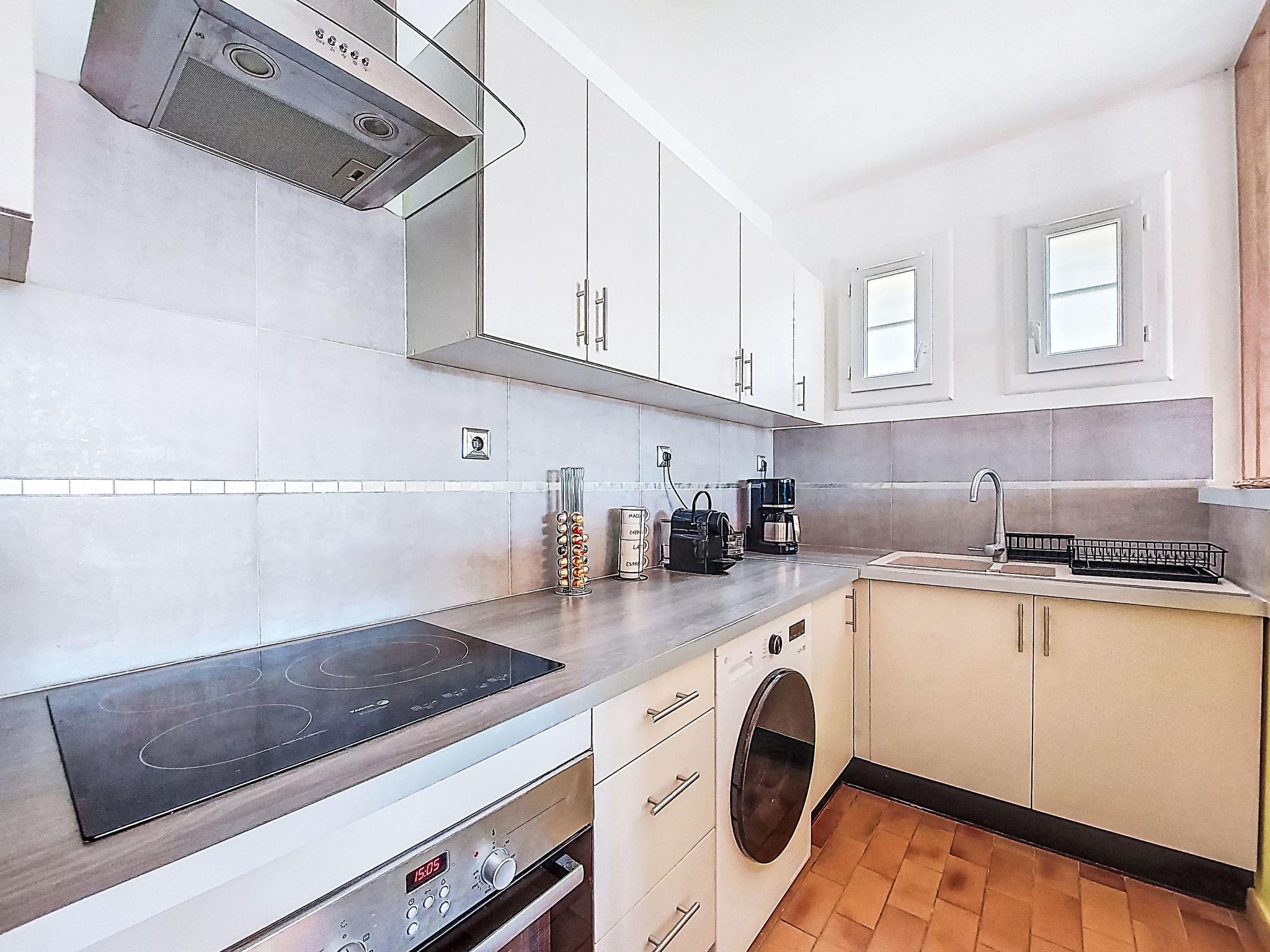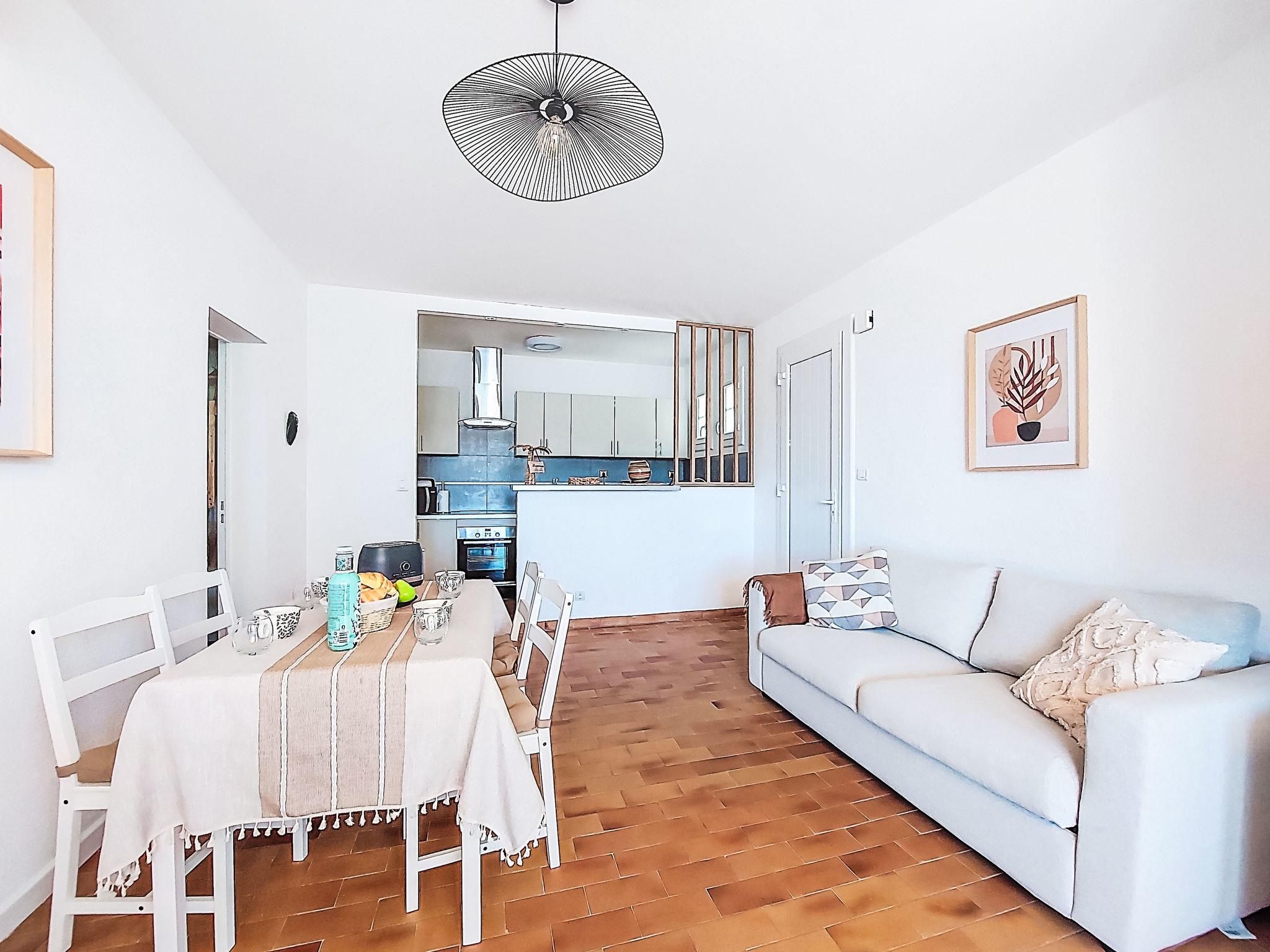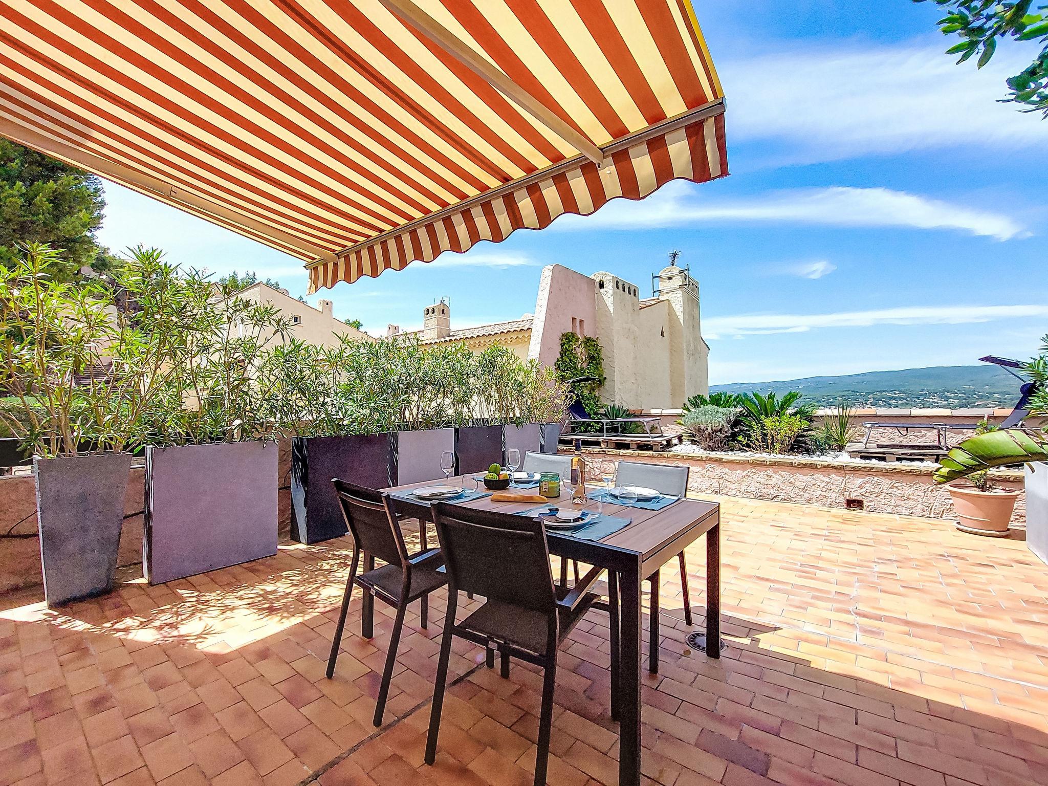2-room apartment 43 m2 on 2nd floor. Comfortable and beautiful furnishings: living/dining room with 1 sofabed (140 cm, length 190 cm), open-hearth fireplace (only for decoration), TV and air conditioning. Exit to the terrace. 1 room with 1 french bed (140 cm, length 200 cm), air conditioning. Open kitchen (oven, 3 induction hot plates, toaster, kettle, microwave, freezer, electric coffee machine). Shower/WC. Forced-air heating. Large terrace 40 m2. Terrace furniture, barbecue. View of the sea. Facilities: washing machine. Internet (WiFi, extra). Please note: non-smokers only. TV only FR. Smoke alarm, no lift. Offer by a private individual according to Art. 155, IV of CGI. 83112 001790SR