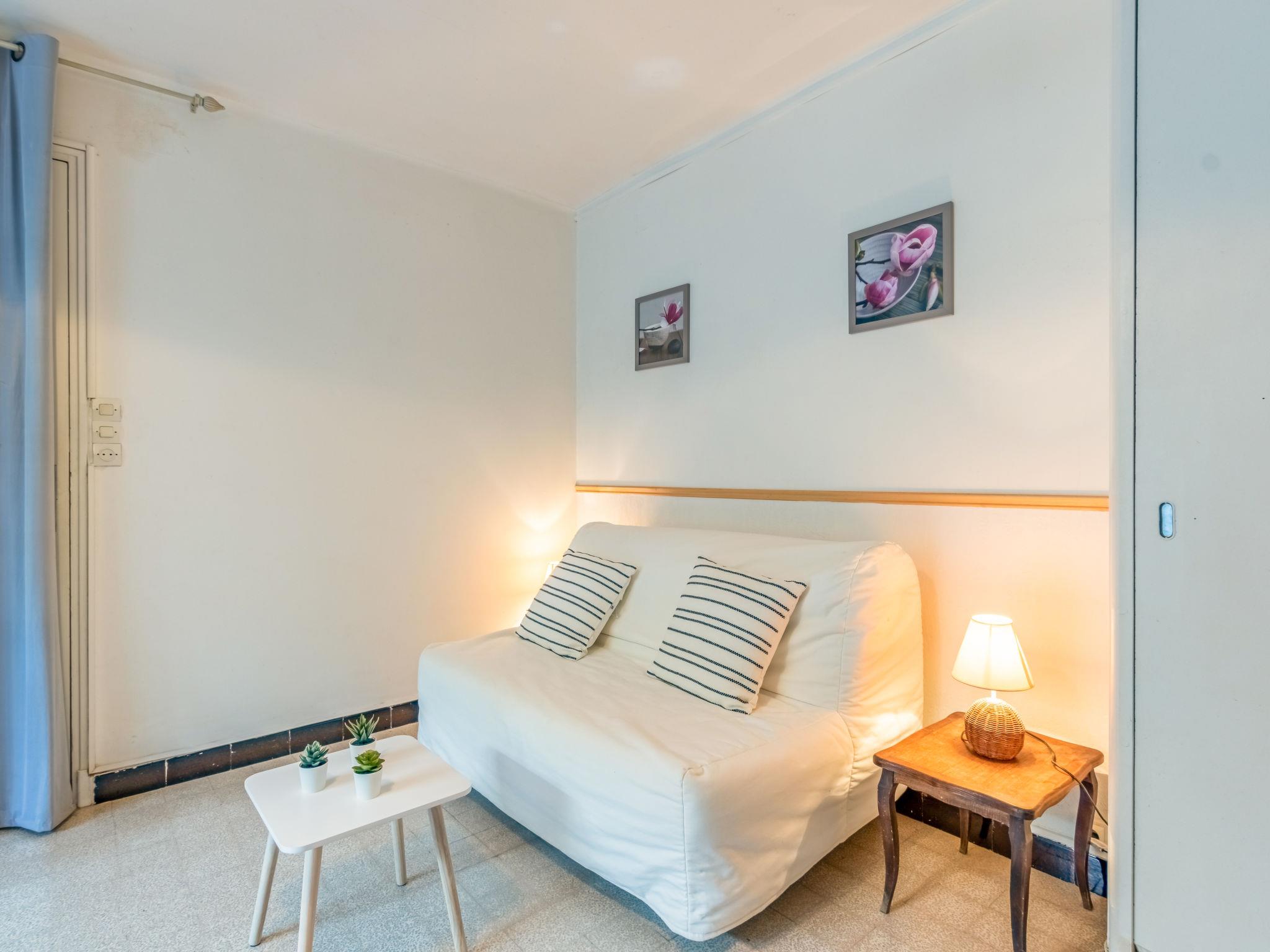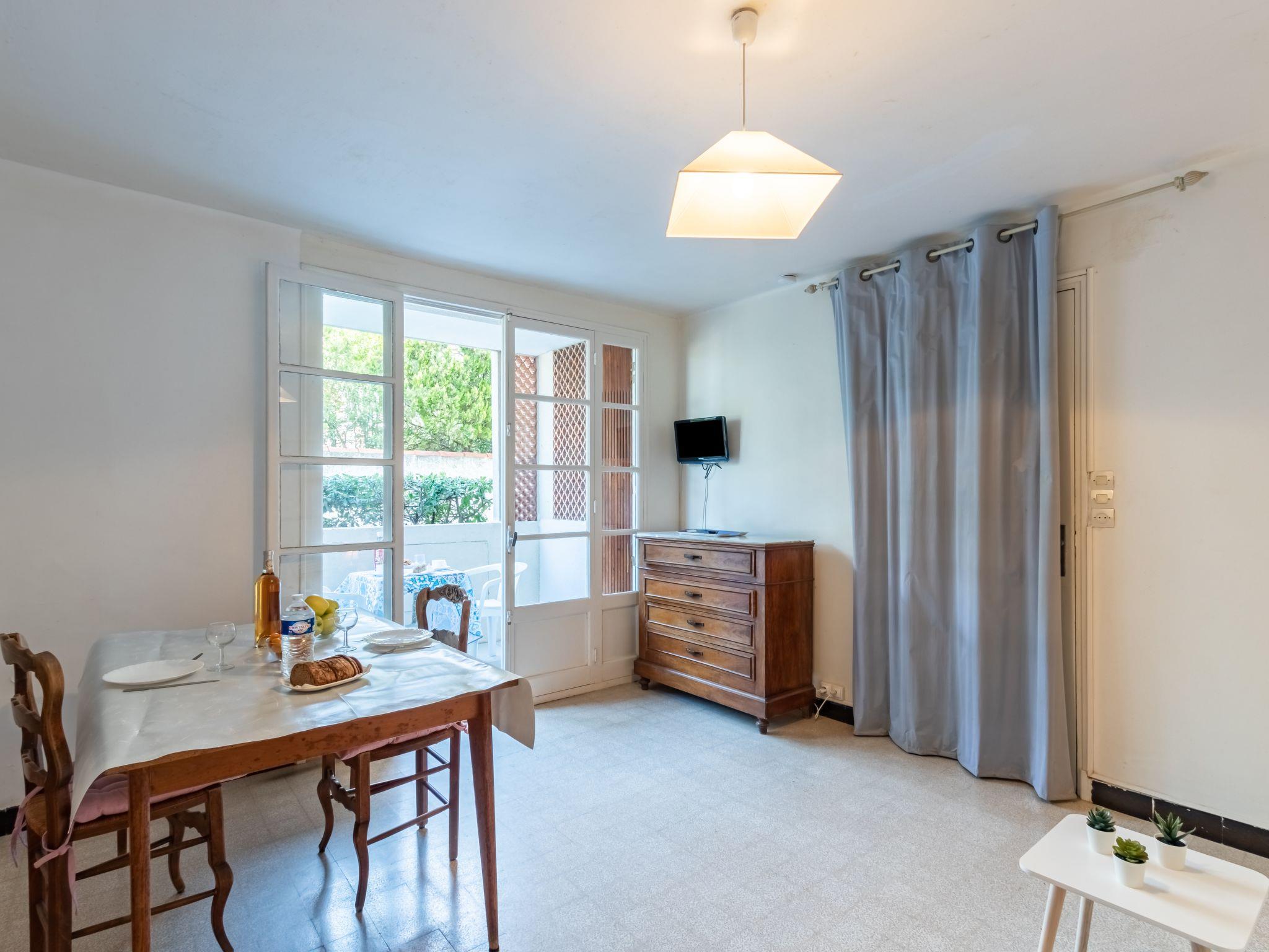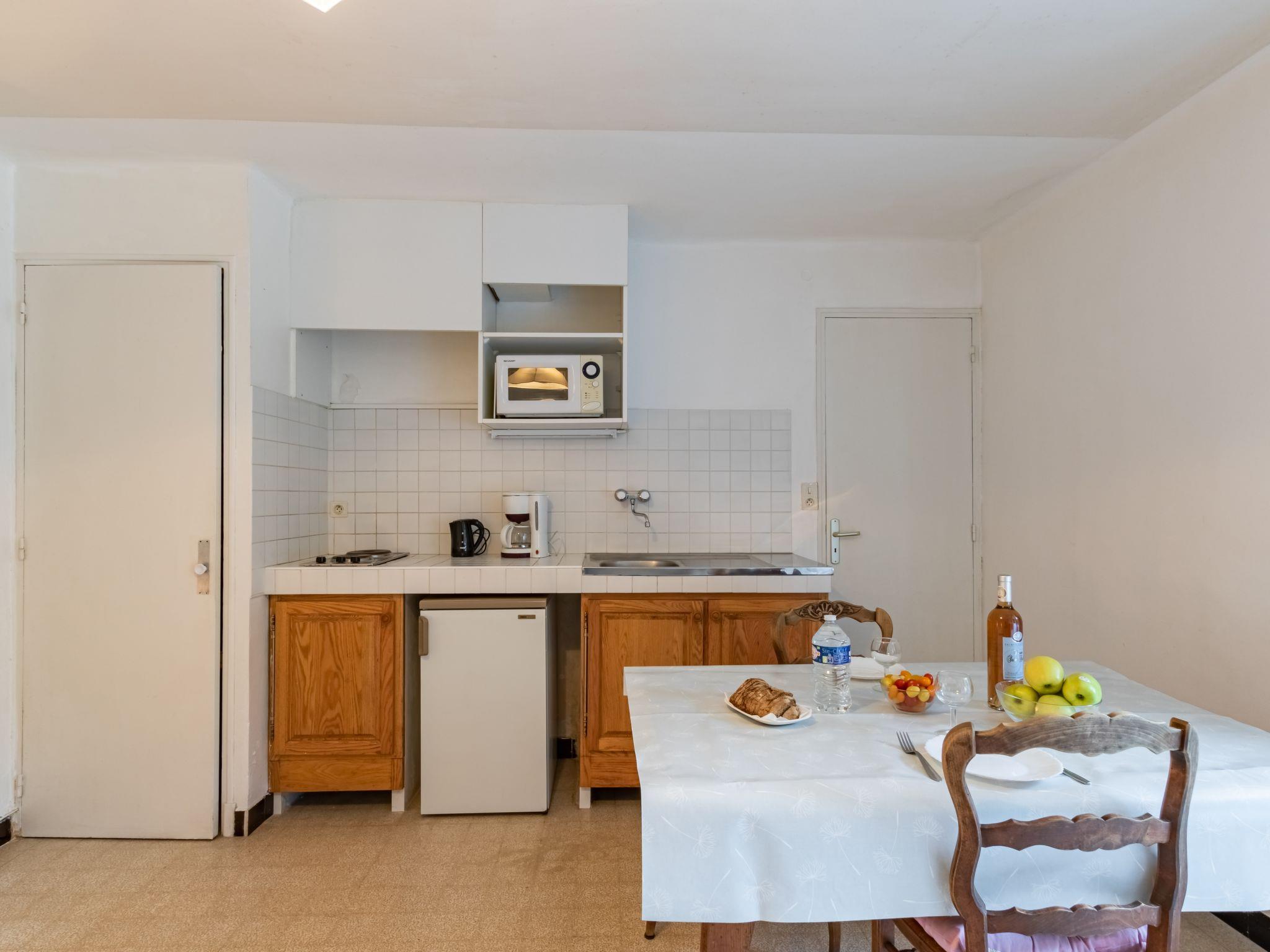 1-room apartment 26 m2, on the ground floor. Simple furnishings: living/dining room with 1 sofabed (140 cm, length 190 cm), TV (flat screen). Exit to the terrace. Kitchenette (2 hot plates, kettle, microwave, electric coffee machine). Shower, sep. WC. No heating option. Terrace 5 m2, roofed, north-west facing position. Terrace furniture. Facilities: Internet (WiFi, extra). Parking. Please note: not suitable for children under 3 years. TV only FR. Warning parking for one car only. 83112000014AI