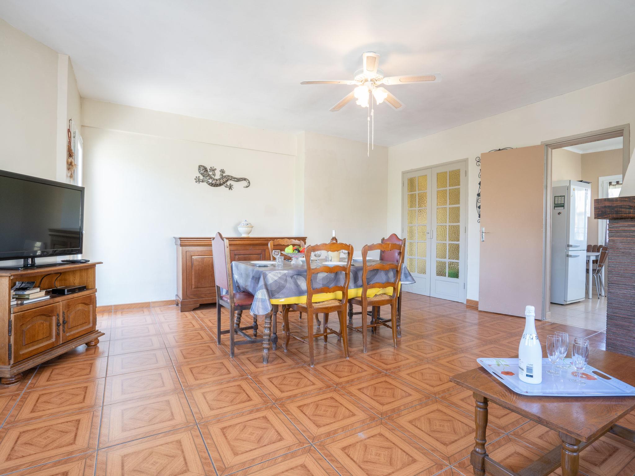 3-room apartment 75 m2 on 1st floor. Simple and practical furnishings: living/dining room with 1 sofabed (120 cm, length 190 cm), TV. Exit to the balcony. 1 room with 1 french bed (140 cm, length 190 cm). Exit to the balcony. 1 room with 1 french bed (140 cm, length 190 cm). Kitchen (4 hot plates, oven, toaster, kettle, microwave, freezer, electric coffee machine, Capsules for coffee machine (Senséo) extra). Bathroom, sep. WC. Electric heating. Small balcony 4 m2, south-east facing position, garden 160 m2, north-west facing position. Terrace furniture. Facilities: washing machine, iron. Internet (WiFi, extra). Parking at the house. Please note: maximum 1 small pet/ dog allowed. TV only FR. Smoke alarm. 83112 000404 KN