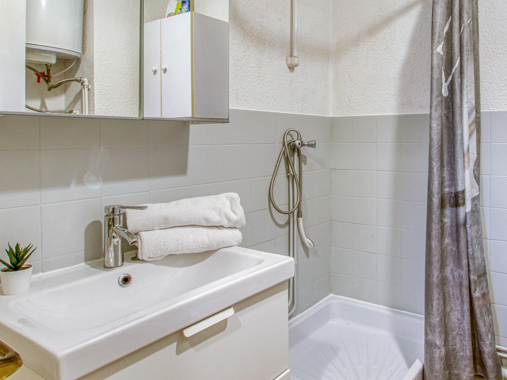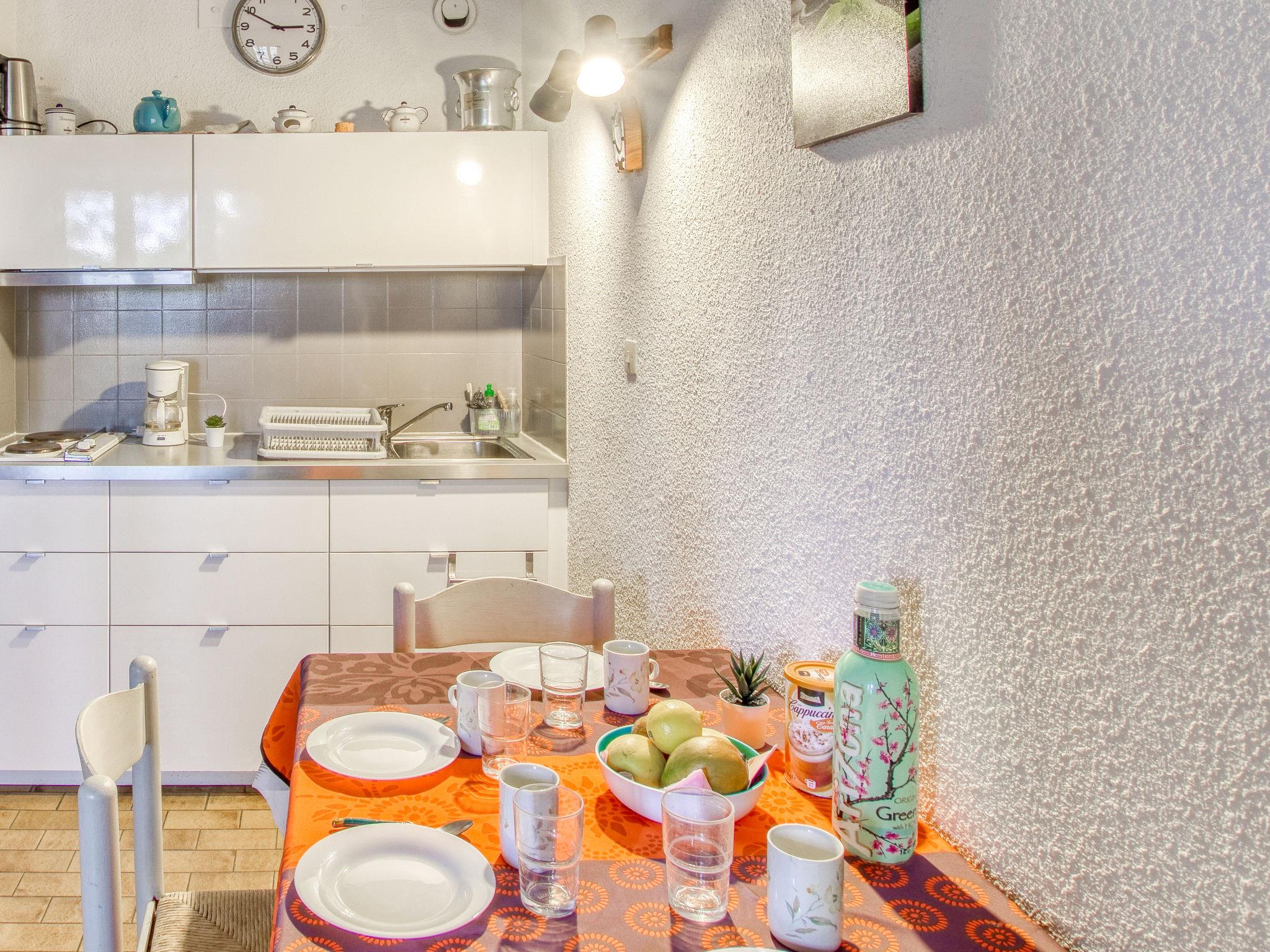 1-room studio 20 m2 on 1st floor. Comfortable furnishings: entrance hall with 1 x 2 bunk beds (80 cm, length 190 cm). Living/dining room with 1 double sofabed (130 cm, length 190 cm), TV (flat screen). Exit to the terrace. Kitchenette (2 hot plates, toaster, kettle, microwave, freezer, electric coffee machine). Shower/WC. Electric heating. Terrace 8 m2, roofed, south-east facing position. Terrace furniture. Partial distant view of the sea. Facilities: Internet (WiFi, extra). Parking space n 98. Please note: 1 small pet/ dog allowed. TV only FR. Smoke alarm. Offer by a private individual according to Art. 155, IV of CGI. 83112001097V1