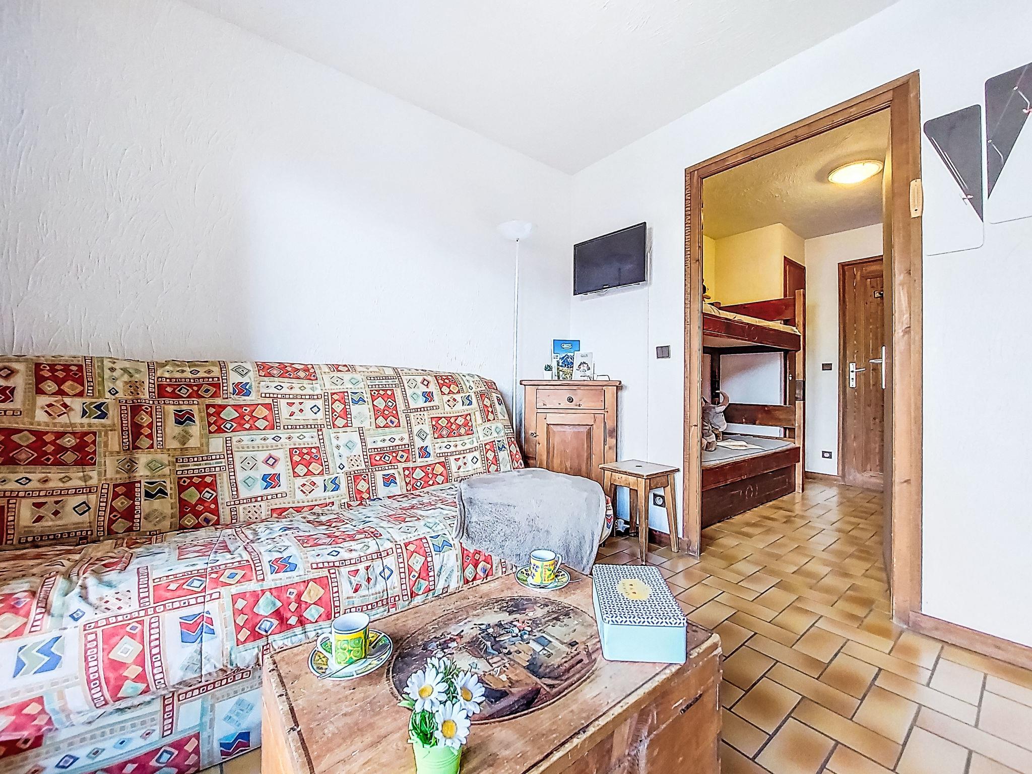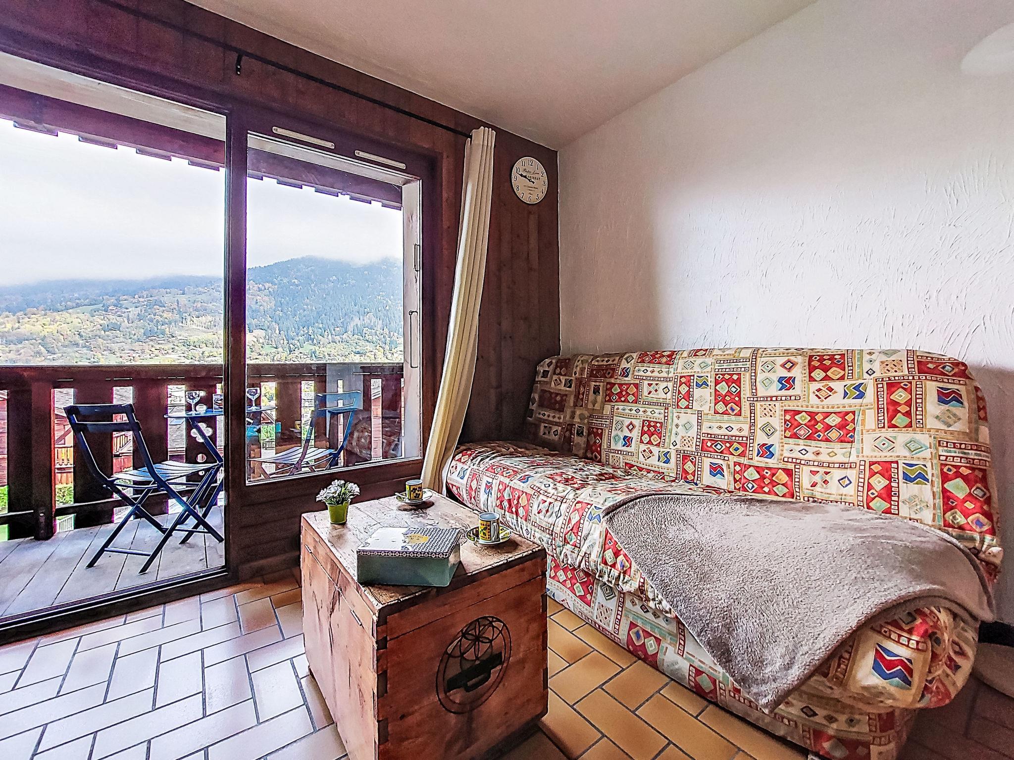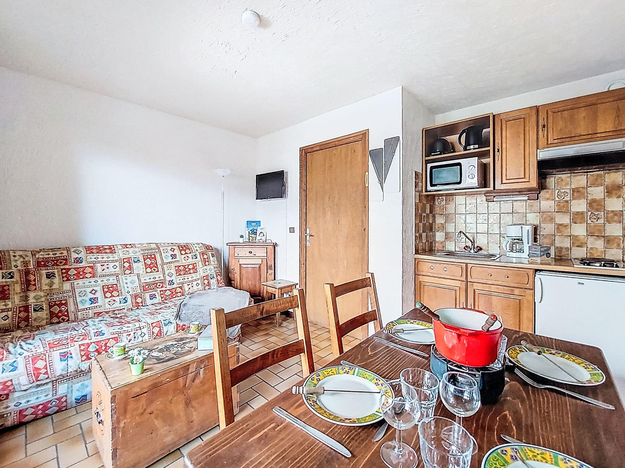 "Les Grets", 1-room studio 27 m2. Entrance hall with 1 x 2 bunk beds (80 cm, length 190 cm). Living/dining room with 1 sofabed (140 cm, length 190 cm), TV (flat screen). Exit to the balcony. Kitchenette (2 hot plates, toaster, kettle, microwave, electric coffee machine, raclette grill, fondue Set (cheese)). Bath/WC. Electric heating. Small balcony 3 m2, east facing position. Balcony furniture. Very beautiful view of the mountains and the swimming pool. Facilities: Internet (WiFi, extra). Please note: maximum 1 small pet/ dog allowed. TV only FR. Smoke alarm, no lift. Offer by a private individual according to Art. 155, IV of CGI.