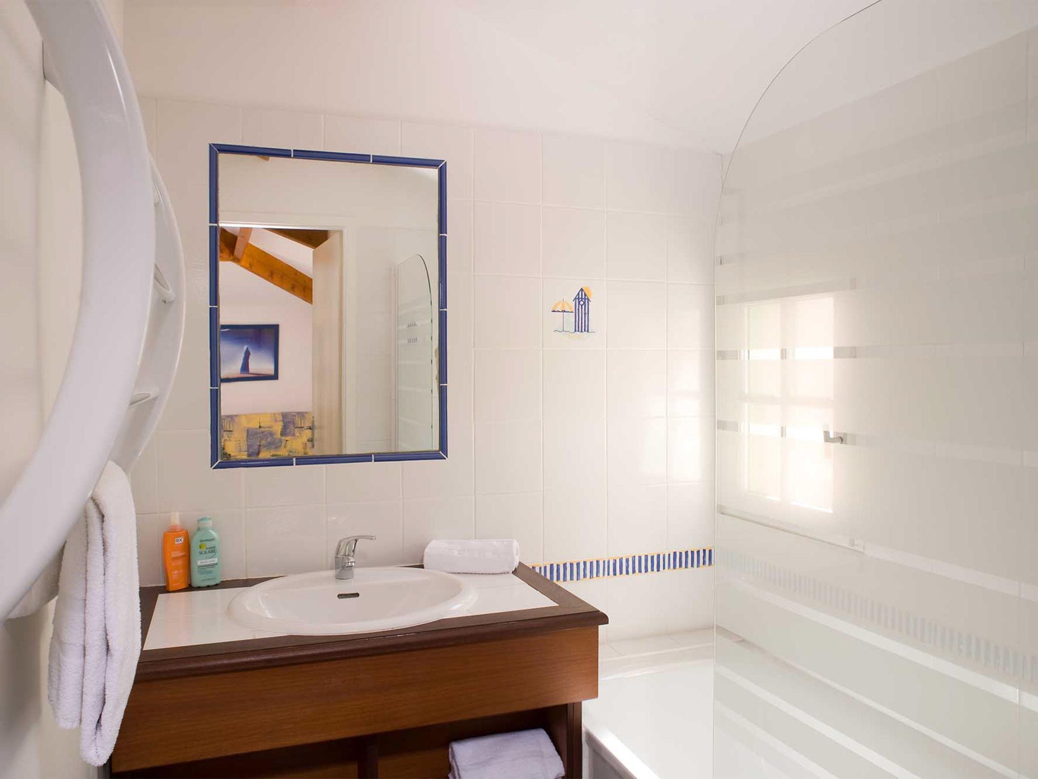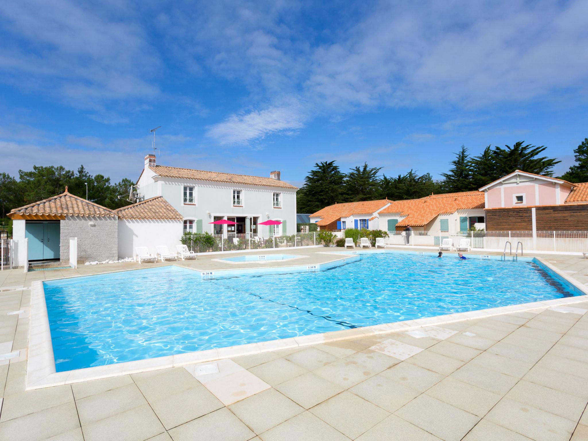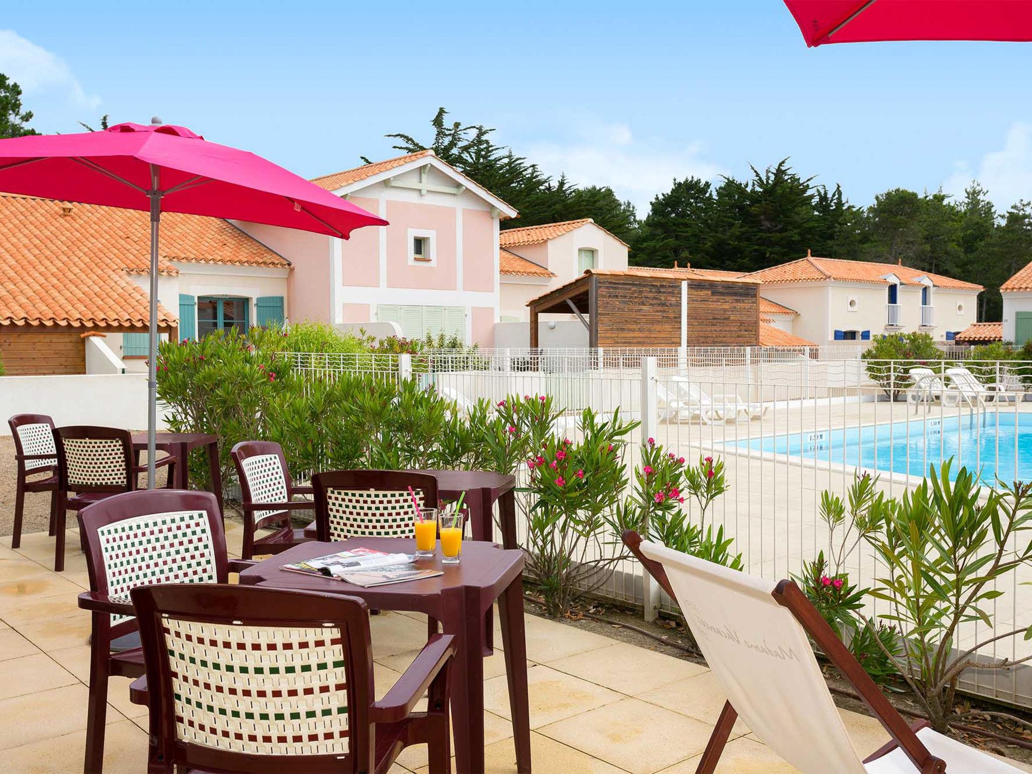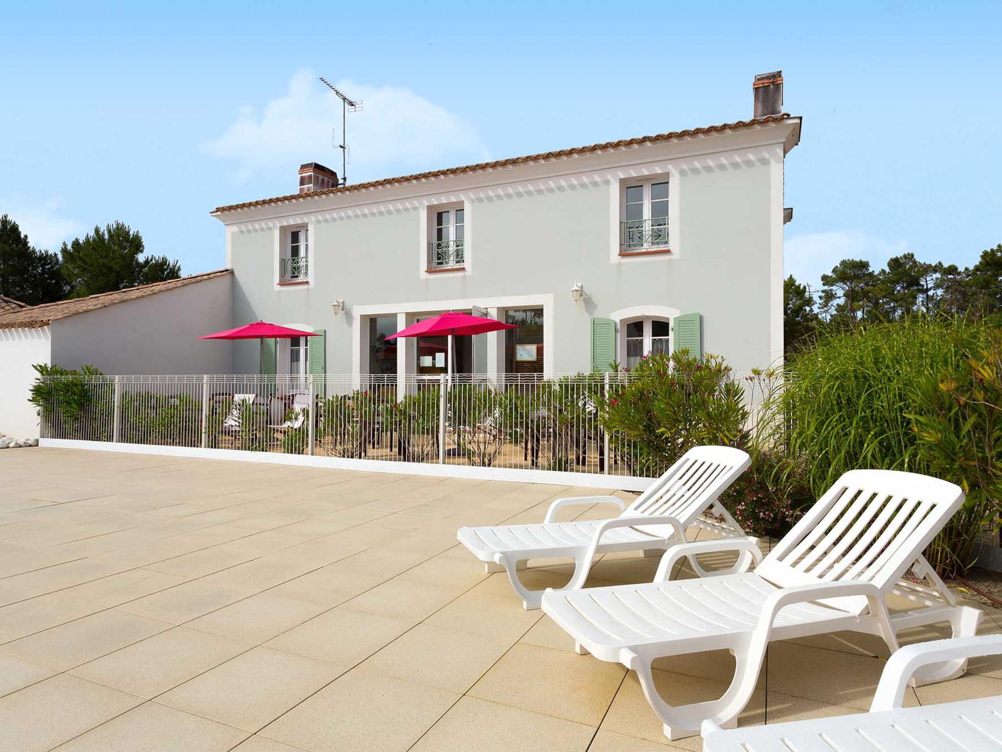 Large, beautiful resort "Les Mas de St. Hilaire", surrounded by trees. 147 houses in the resort. 6 km from the centre of St. Jean-de-Monts, 9 km from the centre of St. Hilaire de Riez, outside the resort, 55 km from the centre of Les Sables d'Olonne, 500 m from the sea. For shared use: property 3 ha (fenced) with plants and trees, swimming pool (160 m2, seasonal availability: 01.Jun. - 15.Sep.). Terrace. In the complex: reception, WiFi. Bread roll service. Parking on the premises. Supermarket 1.5 km, sandy beach 500 m. Please note: the photograph shows a typical example. The holiday properties may differ in living space, floorplan, equipment and furnishing. Wifi only at the reception.