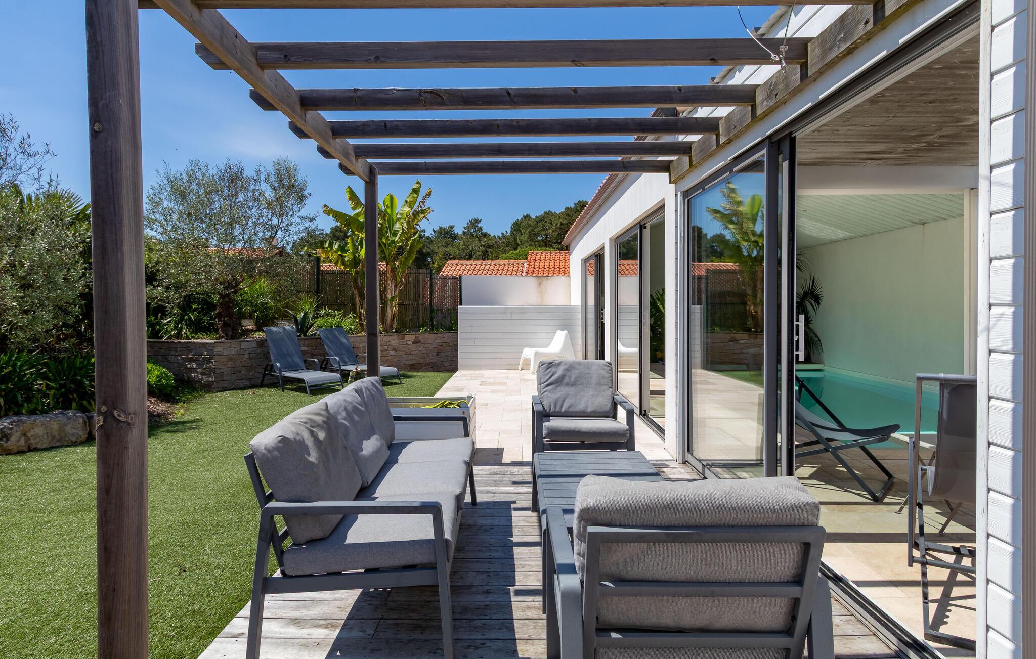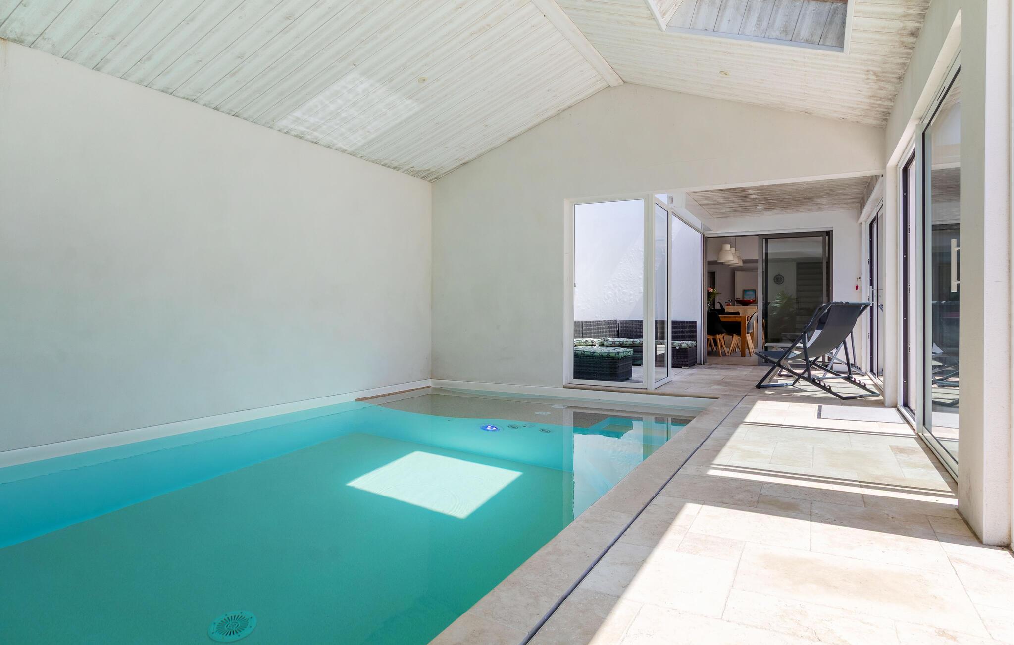 Freuen Sie sich auf eine sonnige Auszeit in diesem modernen Ferienhaus mit beheiztem Indoor-Pool.