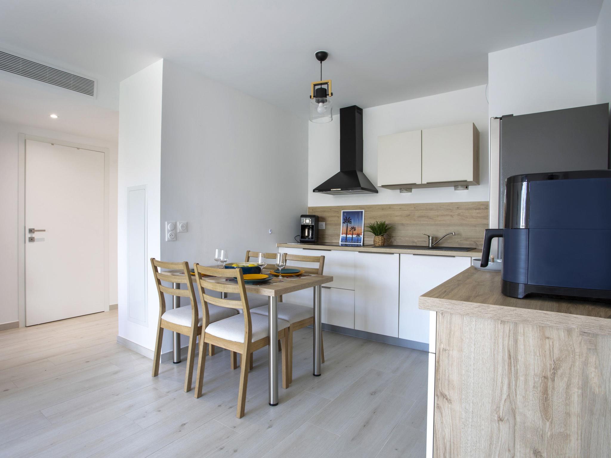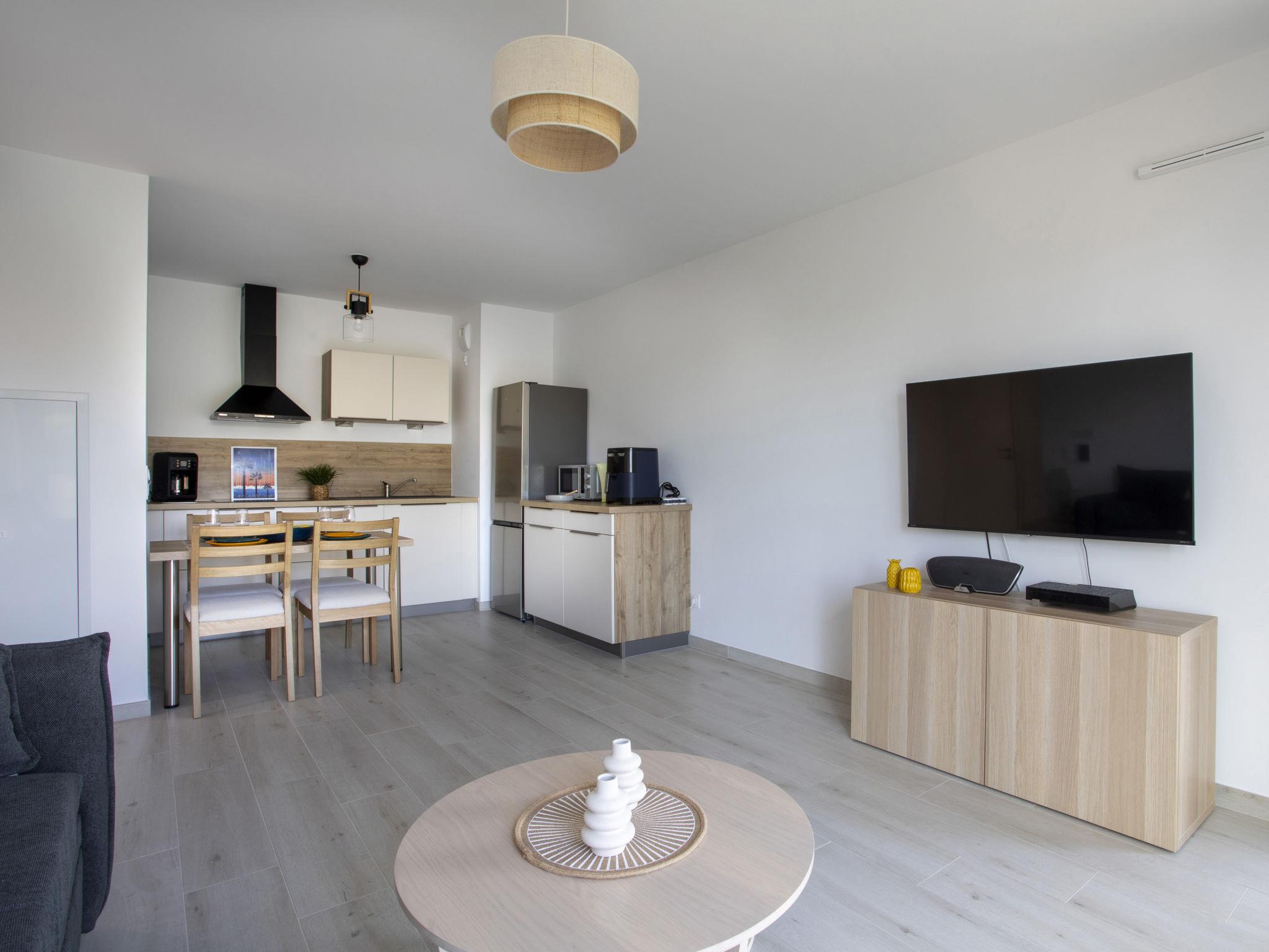 2-room apartment 47 m2 on 4th floor, north facing position. Comfortable and modern furnishings: living/dining room with 1 double sofabed (2 x 80 cm, length 200 cm), TV (flat screen). Exit to the balcony. 1 room with 1 french bed (1 x 160 cm, length 200 cm), TV (flat screen). Open kitchen (dishwasher, 3 induction hot plates, toaster, kettle, microwave, electric coffee machine). Exit to the balcony. Bathroom, sep. WC. Heating, air-conditioning. Balcony 8 m2, north facing position. Balcony furniture. View of the resort. Facilities: washing machine, iron, hair dryer. Internet (WiFi, free). Parking space n 121 (1 car). Please note: non-smoking house. Smoke alarm. Offer by a commercial proprietor according to Art. 155, IV, CGI 06123038460AK