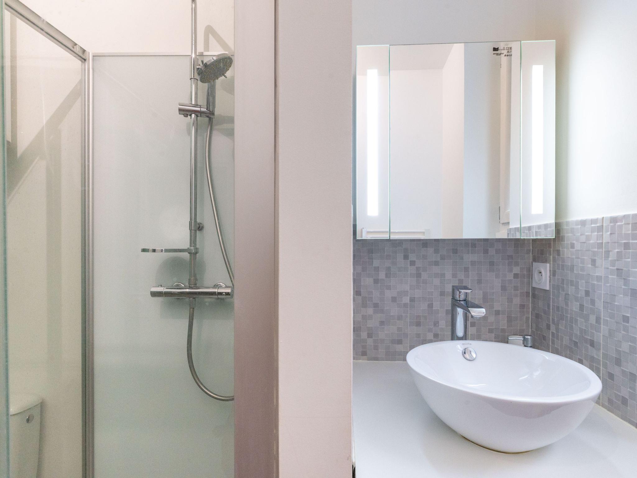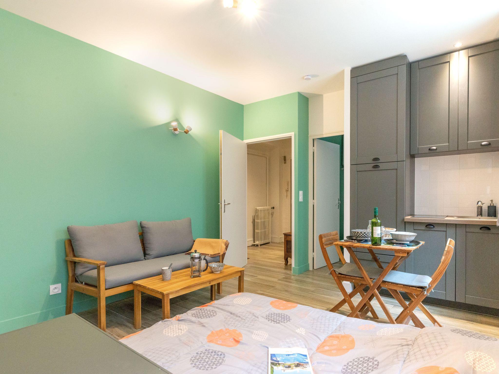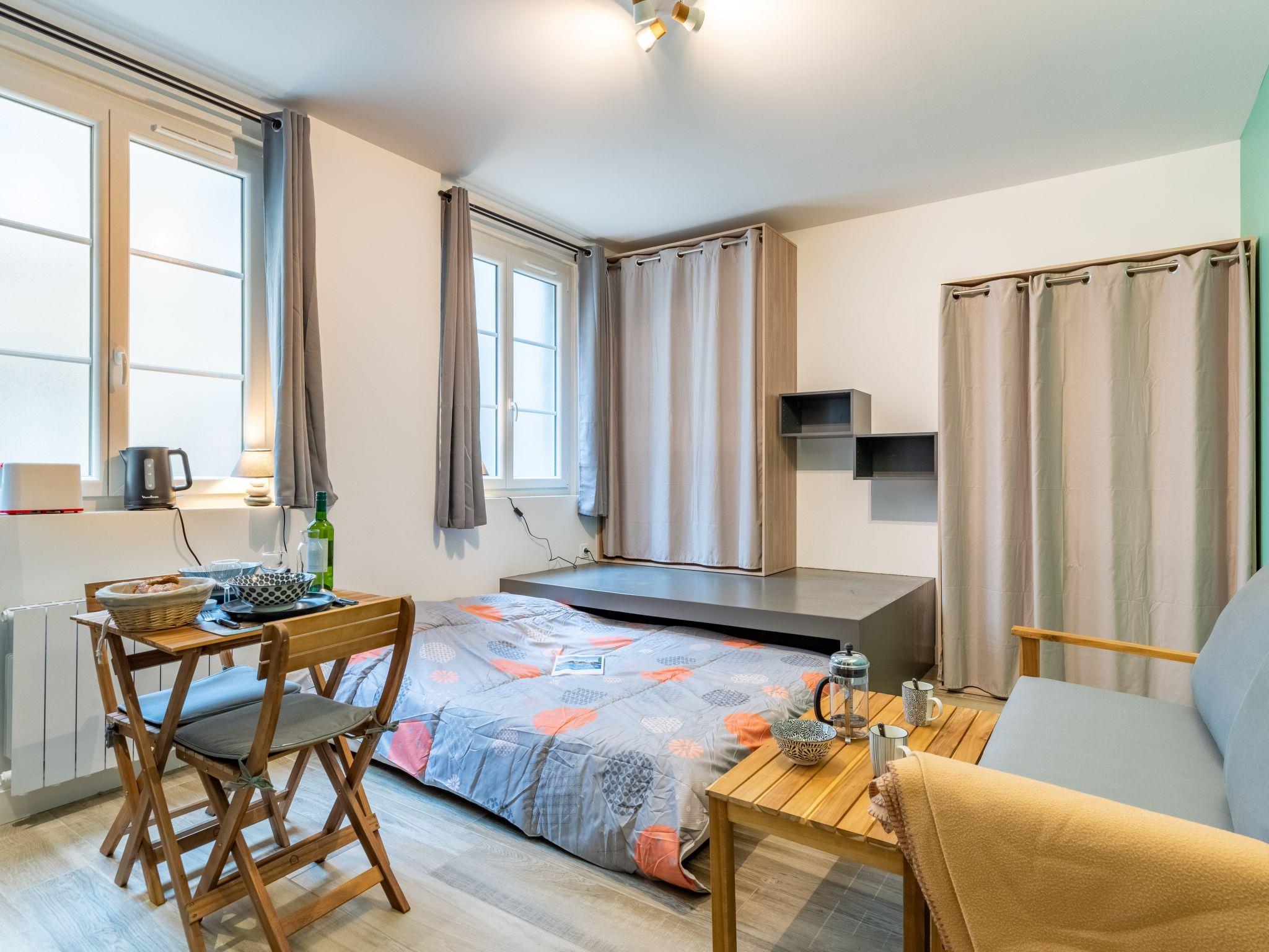 "Le studio St Vincent", 1-room studio 25 m2 on 2nd floor. Fully renovated in 2020, beautiful and tasteful furnishings: living/sleeping room with 1 french bed (1 x 140 cm, length 190 cm). Small, open kitchen (2 induction hot plates, toaster, kettle, freezer, combination microwave) with dining table. Shower/WC. Electric heating. Facilities: washing machine, iron, hair dryer. Internet (WiFi, free). Please note: apartment courtyard side. Smoke alarm. Offer by a private individual according to Art. 155, IV of CGI. 3528800266372