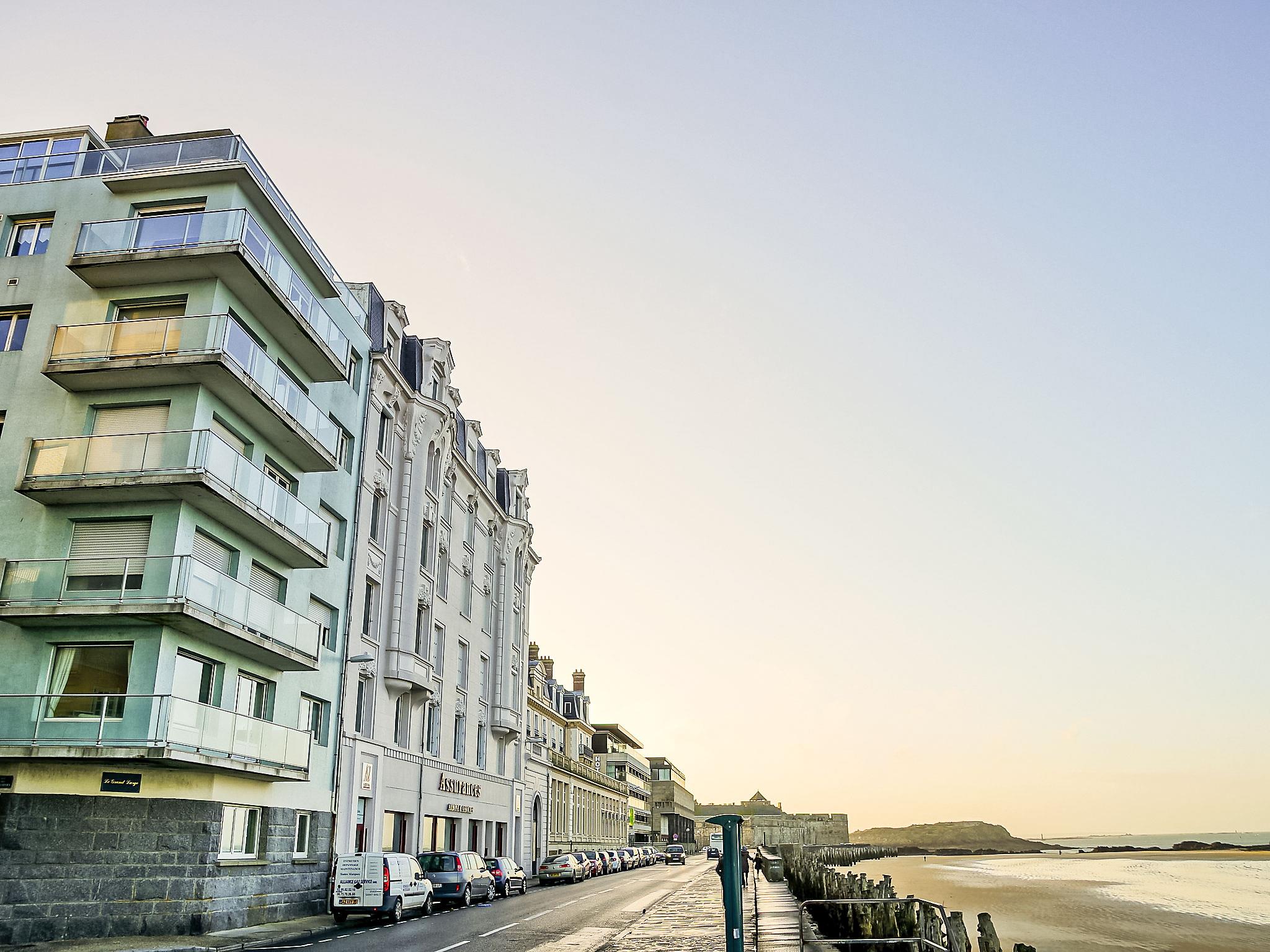 Residence "Le Grand Large", 4 storeys. In the district of Sillon, 20 m from the sea, 20 m from the beach, road to cross. In the complex: lift, central heating system, heating available only from 15.Oct. - 15.Apr.. Shop, grocery, restaurant, bar 250 m, bakery 200 m, bus stop "Intramuros" 400 m, railway station "Gare TGV St Malo" 1.2 km, ferry "Gare maritime du Naye" 1.9 km, sandy beach "Grande Plage du sillon" 20 m, park "La Briantais" 4 km, diving center 1.5 km, indoor swimming pool 1.5 km, thermal baths "Thermes Marin" 2 km. Sports harbour 250 m, golf course (18 hole) 17 km, surf school 1.7 km, sailing school 1.3 km. Nearby attractions: Le Mont St michel 56 km, Cancale 15 km, Dinan 33 km, Dinard 15 km, Casino Saint-Malo 300 m, Aquarium de St Malo 15 km. The keys‘ handover takes place by the agency Interhome in Saint Malo, 2 km.