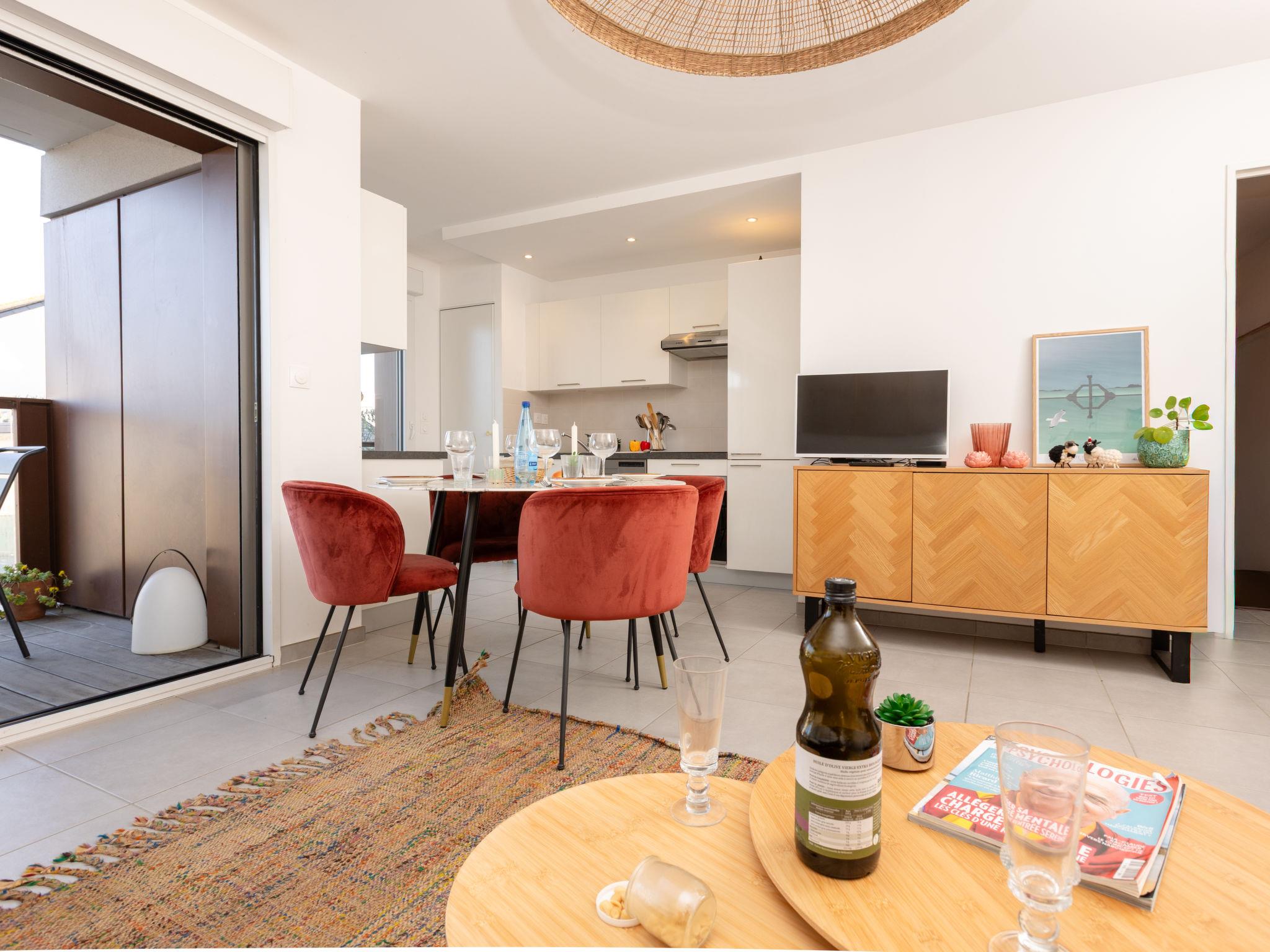 "Canephora", 3-room apartment 60 m2 on 1st floor. Comfortable and tasteful furnishings: large living/dining room with TV (flat screen). Exit to the balcony. 1 room with 1 french bed (1 x 140 cm, length 190 cm). Exit to the terrace. 1 small room with 1 pull-out bed (2 pers. 2 x 90 cm, length 190 cm). Exit to the terrace. Open kitchen (oven, dishwasher, 3 induction hot plates, toaster, kettle, microwave, freezer, electric coffee machine). Shower, sep. WC. Electric heating. Heating available only from 15.10. to 15.04. Small balcony 6 m2, large terrace 40 m2. Terrace furniture, balcony furniture, deck chairs. Facilities: washing machine, iron, hair dryer. Internet (WiFi, free). Parking space n 98 (fenced 1 car). Please note: non-smokers only. Smoke alarm. Offer by a private individual according to Art. 155, IV of CGI.