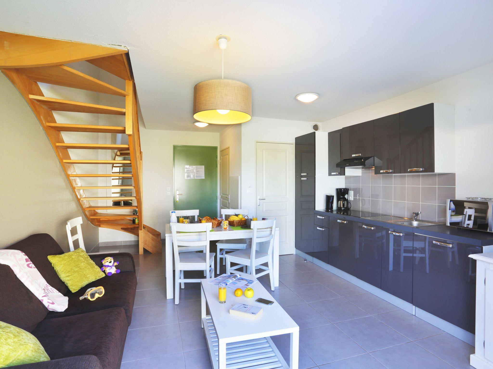 "Le Domaine des Mauriers", 2-room house 40 to 46 m2 on 2 levels. Bright, beautiful furnishings: living/dining room with 1 sofabed (140 cm, length 190 cm), dining table and TV can be hired. Exit to the balcony, to the terrace. Open kitchen (dishwasher, 4 ceramic glass hob hotplates, toaster, kettle, electric coffee machine, combination microwave). Sep. WC. Upper floor: 1 room with 1 french bed (140 cm, length 190 cm). Alcove with 1 x 2 bunk beds (80 cm, length 190 cm). Bathroom. Electric heating. Terrace. Terrace furniture. Facilities: children's high chair, baby cot. Internet (WiFi, extra). Please note: non-smoking house. Maximum 1 pet/ dog allowed. Smoke alarm. Instead of an enclosed bedroom, some sleeping areas are located in an open-plan area (gallery, alcove, etc.).