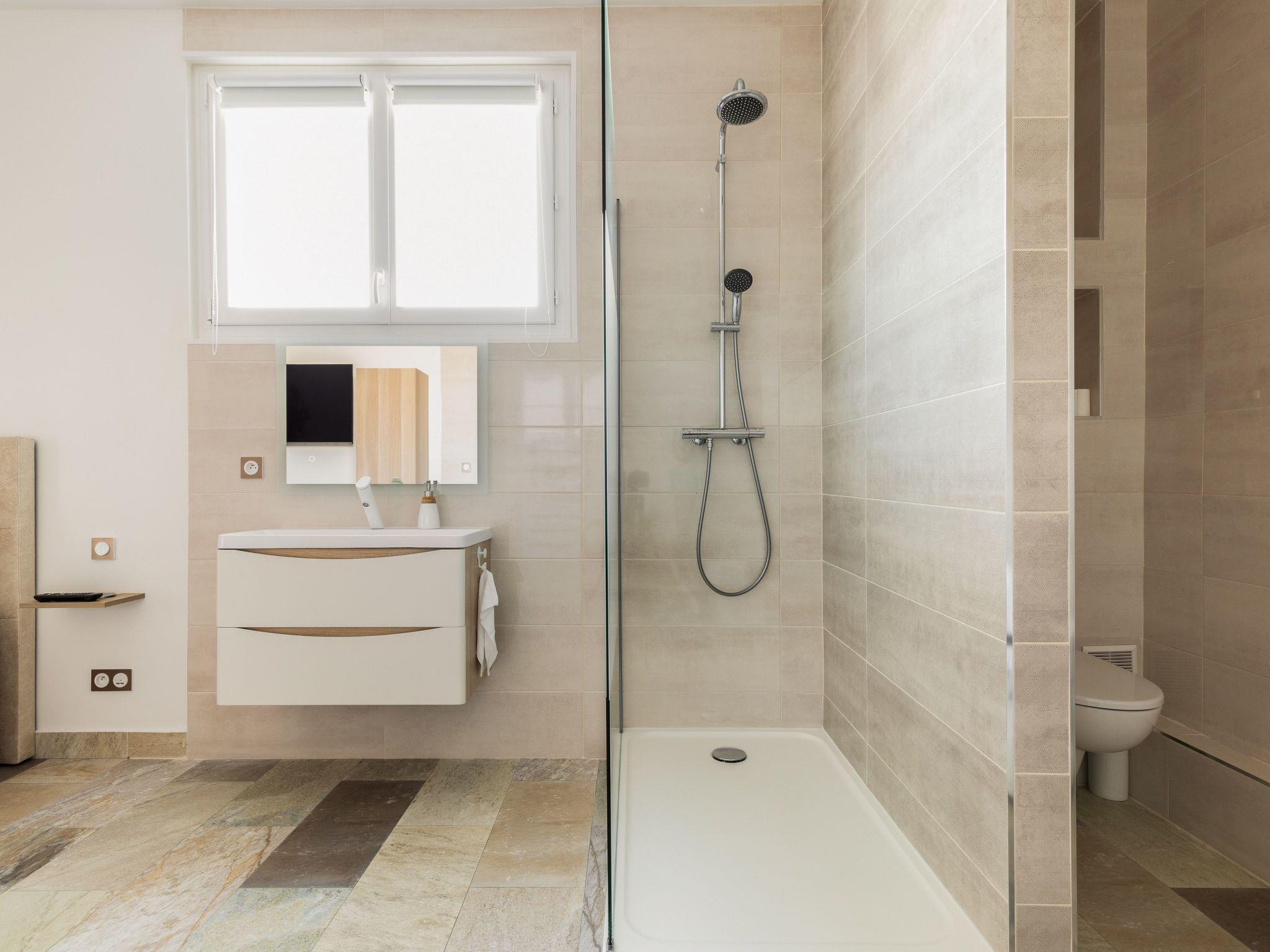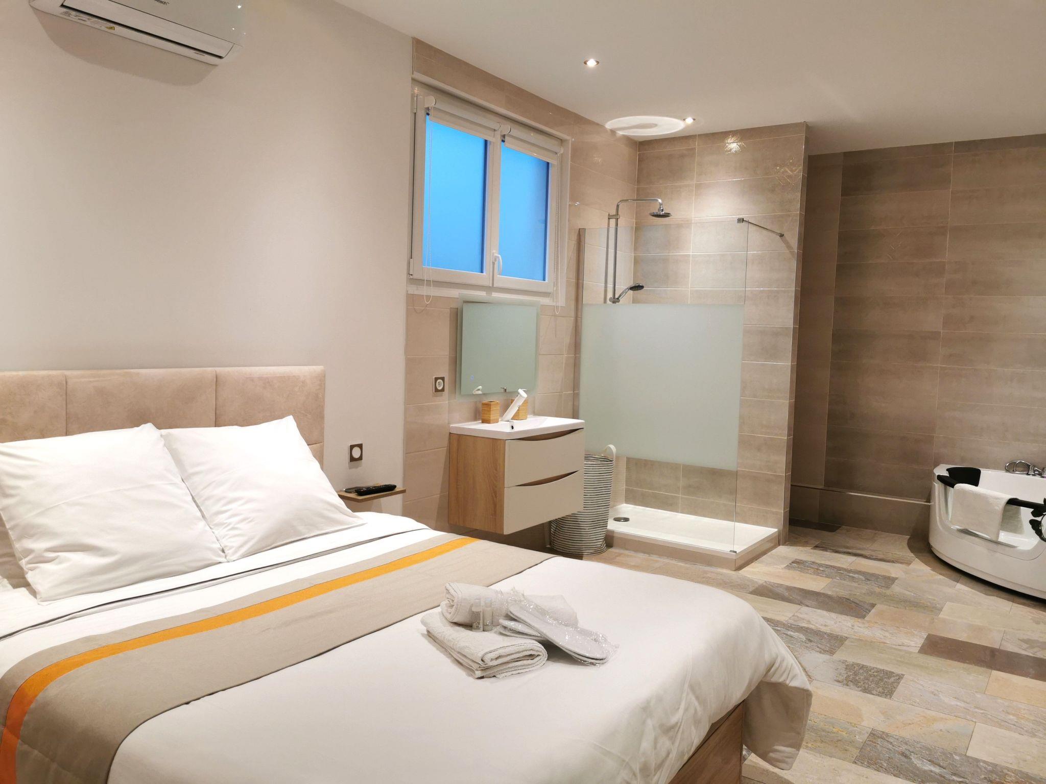 With a surface area of approximately 49 m², the accommodation comprises the following rooms: a fully-equipped kitchen with cooker, fridge with freezer, oven, microwave, washing machine, dishwasher, coffee maker, toaster, and dining area that can accommodate 4 people for a meal, flat-screen smart TV (TNT, Netflix, youtubes etc.) The bedroom with a 160cm bed opens onto the fully-equipped bathroom, with sink, shower, bathtub with 26 balneotherapy and light therapy jets for total relaxation, and toilet. free wifi