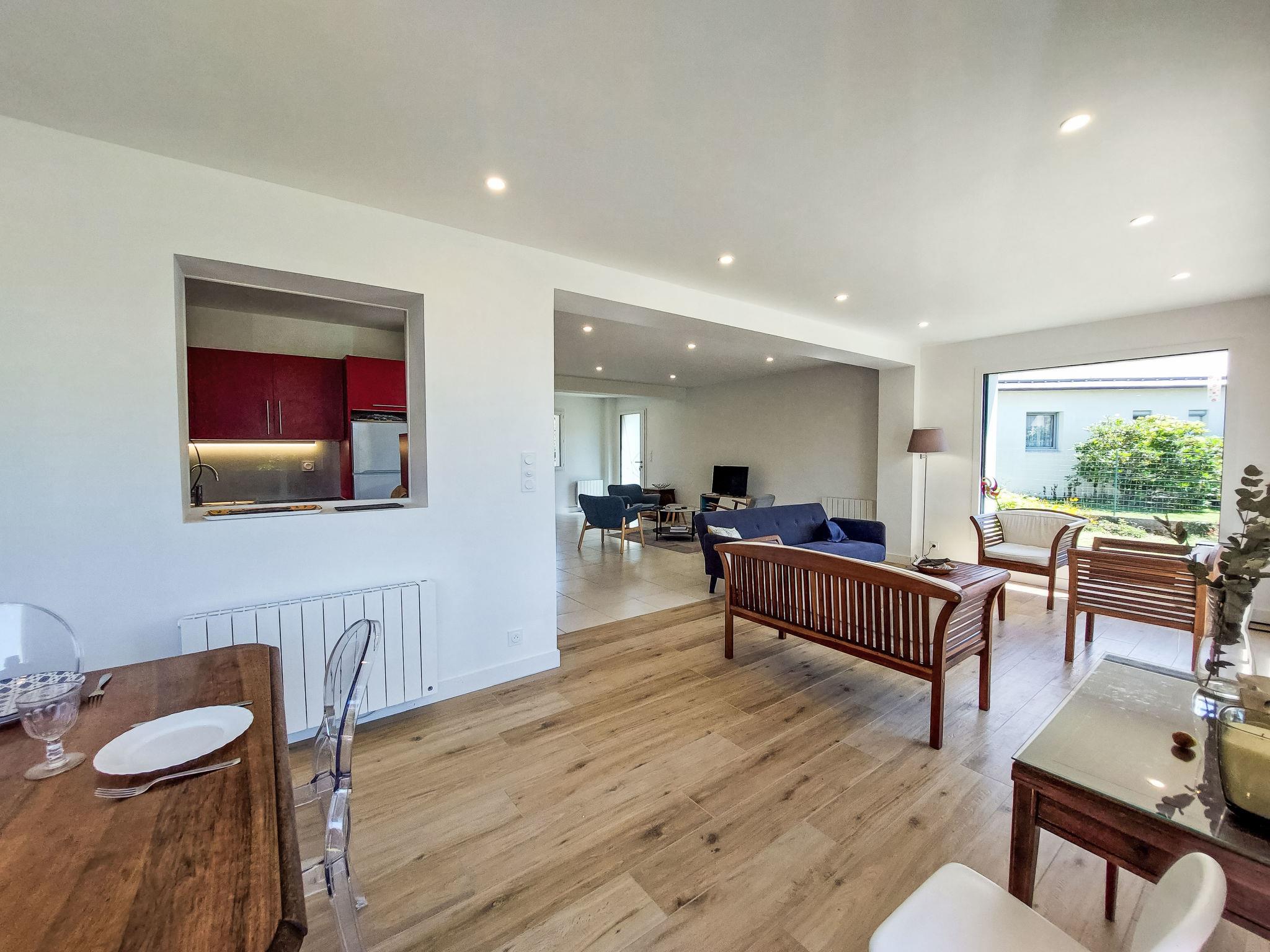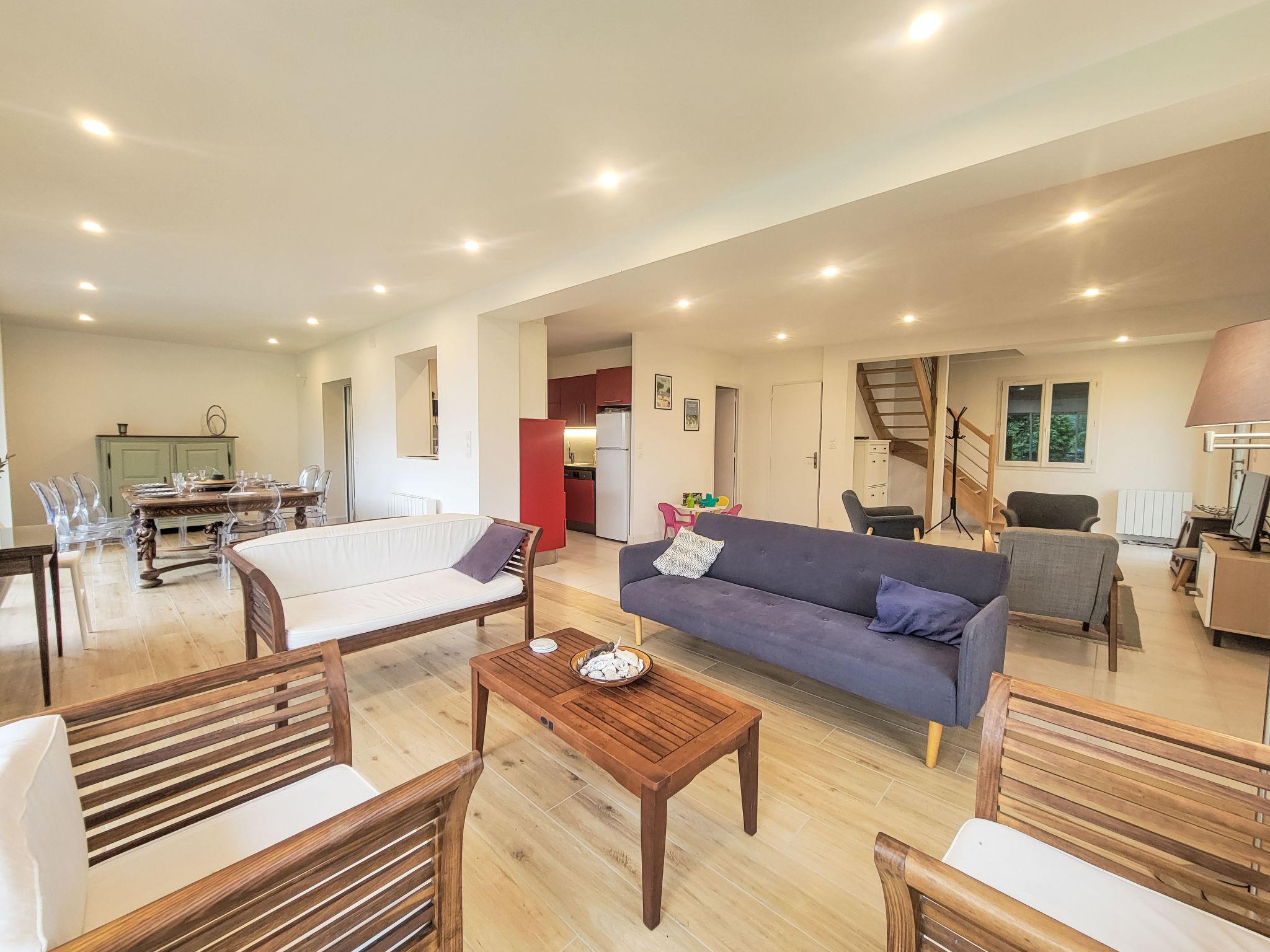 5-room house 150 m2 on 2 levels, on the ground floor. Beautiful furnishings: living/dining room with TV (flat screen). 1 room with 1 french bed (1 x 160 cm, length 200 cm). 1 room with 1 bed (80 cm, length 200 cm). Open kitchen (dishwasher, 4 ceramic glass hob hotplates, microwave, freezer, electric coffee machine, Capsules for coffee machine (Nespresso) extra). Shower, sep. WC. Upper floor: 1 room with 1 bed (90 cm, length 190 cm), 1 french bed (1 x 160 cm, length 200 cm), shower. 1 room with 2 beds (80 cm, length 200 cm). Sep. WC. Electric heating. Barbecue. Facilities: washing machine, children's high chair, baby cot. Internet (WiFi, free). Please note: maximum 1 pet/ dog allowed. Smoke alarm. 562330000534I