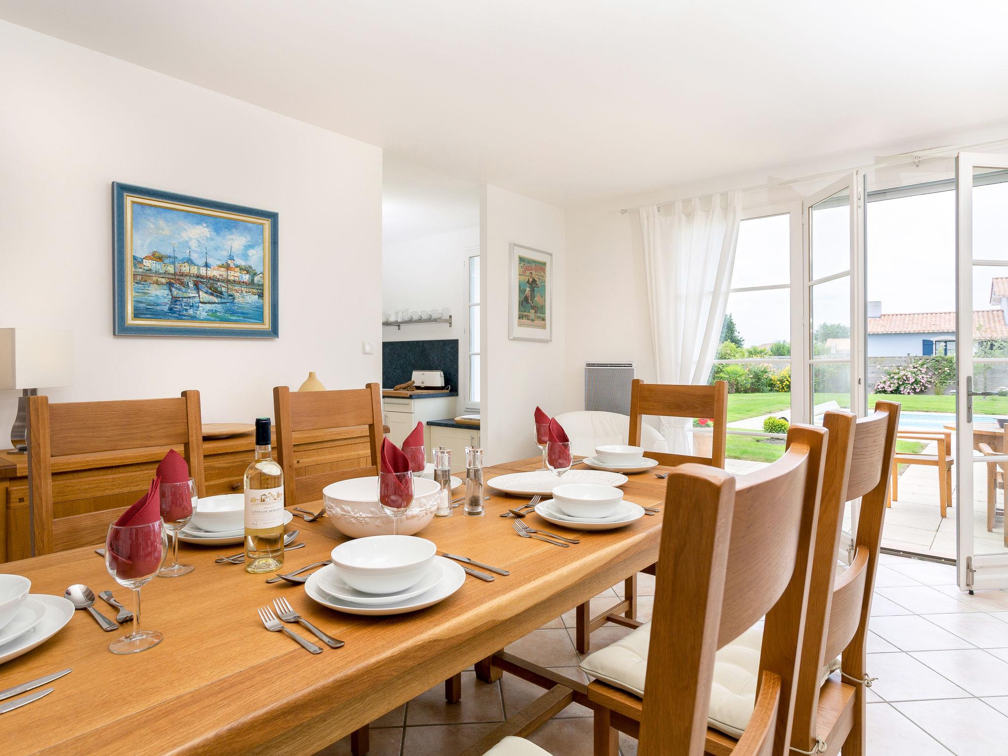 "Le Domaine de Fontenelles", 5-room house 128 m2. Bright, beautiful furnishings: living/dining room with dining table and TV. Exit to the terrace. 4 rooms, each room with 2 sleeping facilities. Kitchenette (4 hot plates, oven, dishwasher, toaster, kettle, freezer, electric coffee machine). Bathroom, shower, shower/WC, 2 sep. WC's. Electric heating. Terrace, small garden, lawn. Terrace furniture. Please note: non-smoking house. Maximum 2 pets/ dogs allowed. Smoke alarm. Private pool (7 x 4 m, 15.05.-15.09.). The house can also be on 2 floors.