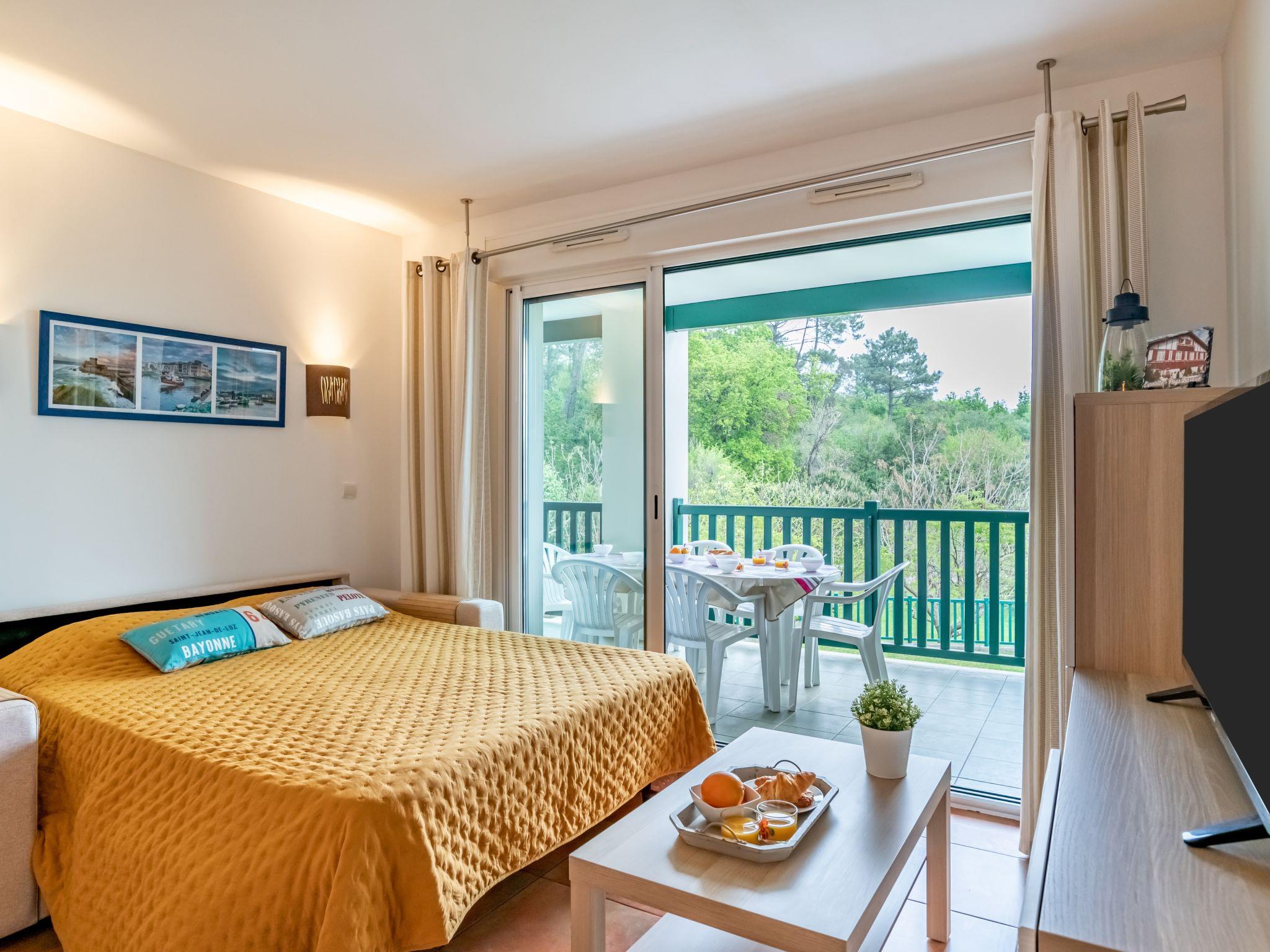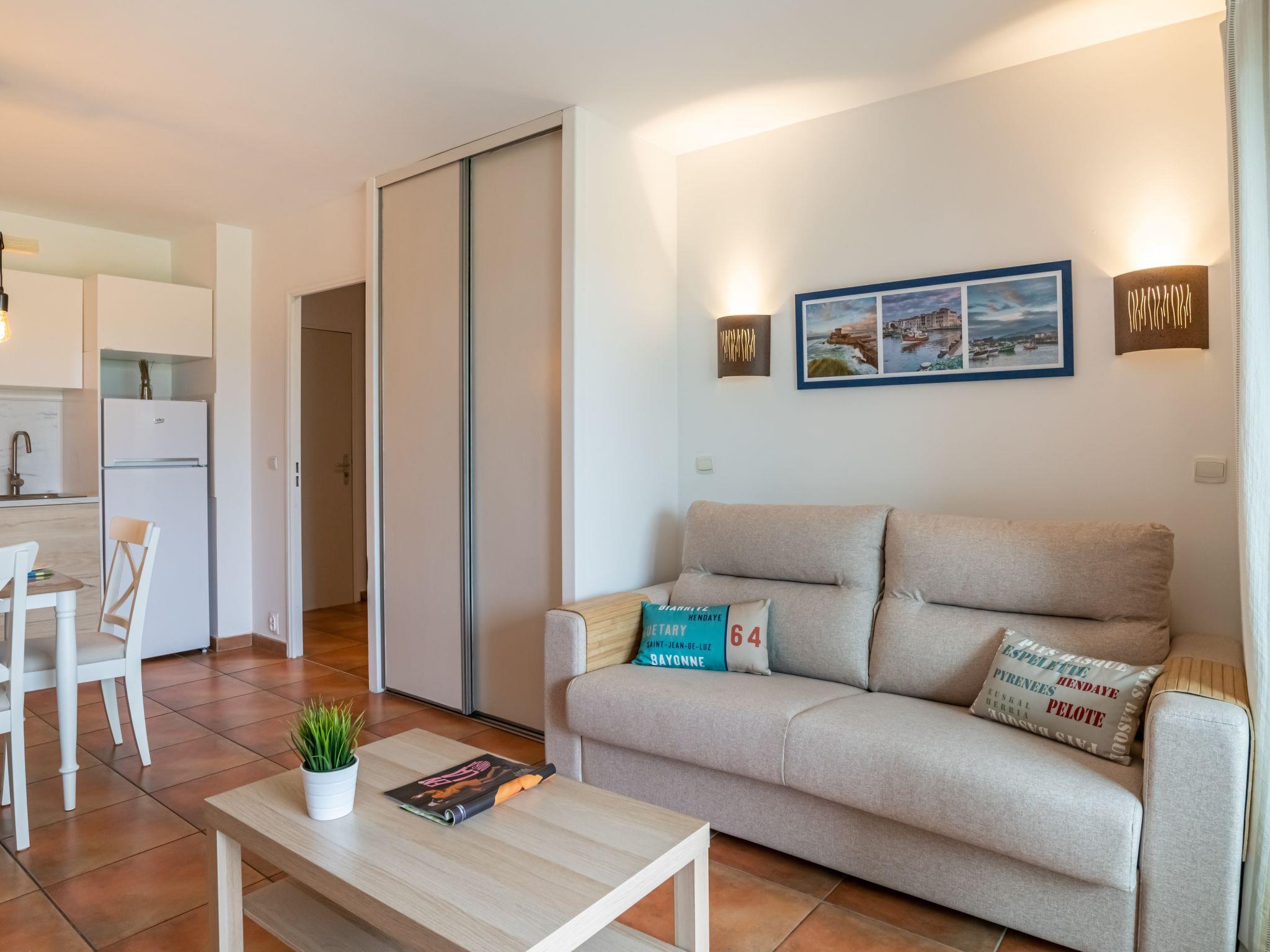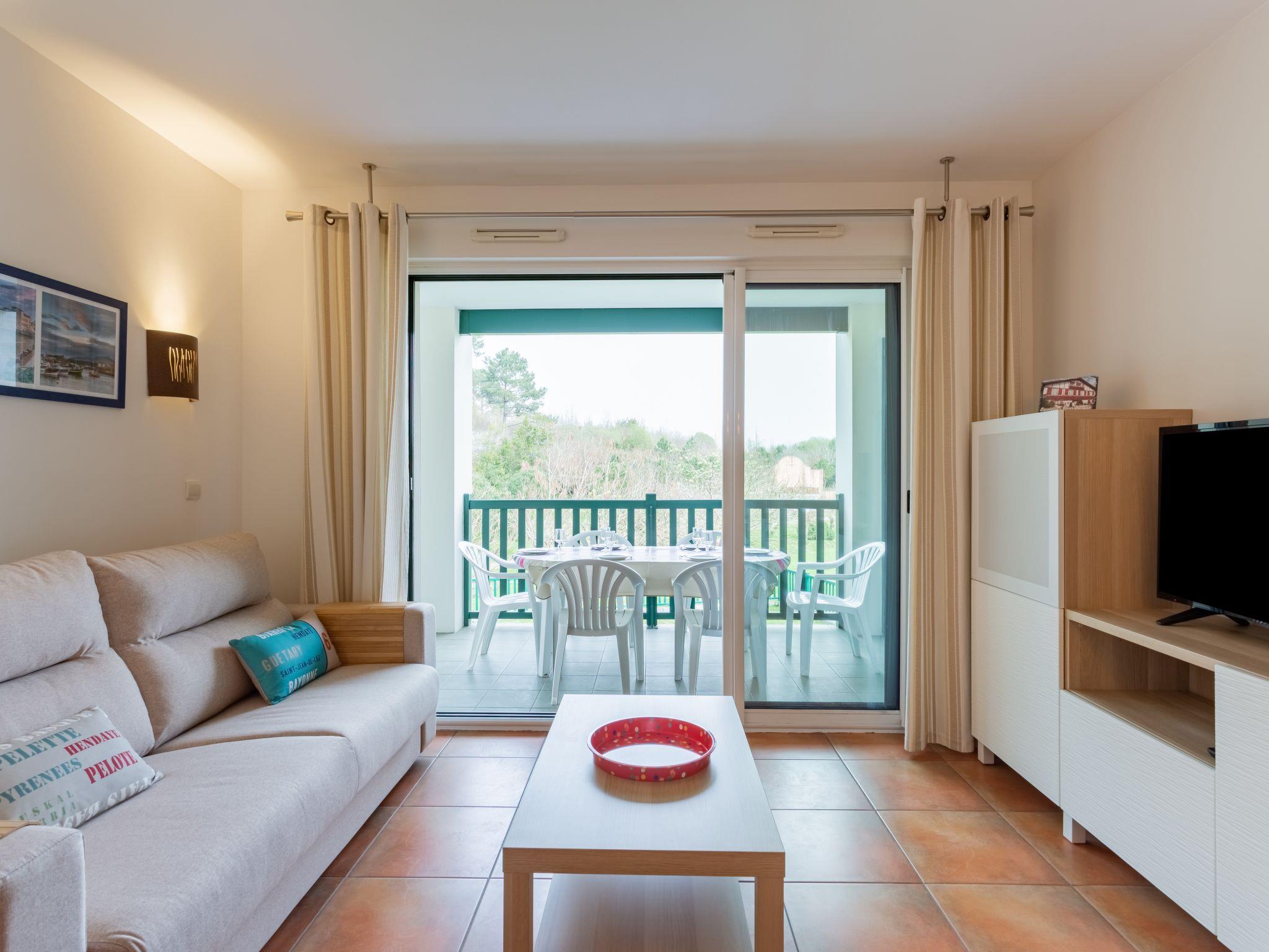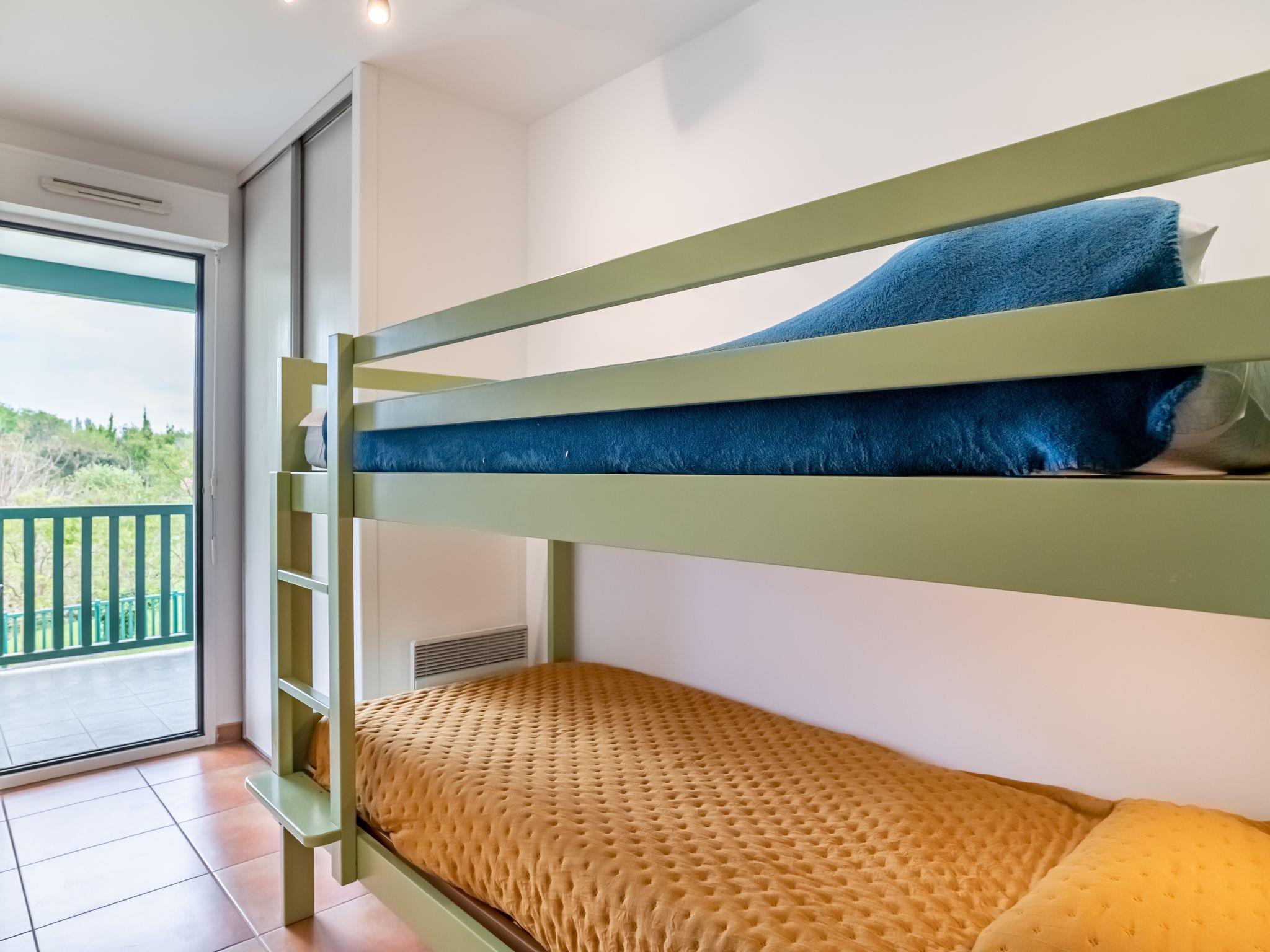 "Domaine Iratzia", 3-room apartment 45 m2 on 1st floor. Comfortable and beautiful furnishings: living/dining room with 1 double sofabed (140 cm, length 190 cm), TV (flat screen). Exit to the terrace. 1 room with 1 french bed (1 x 160 cm, length 200 cm). Exit to the terrace. 1 room with 1 x 2 bunk beds (90 cm, length 190 cm). Exit to the terrace. Open kitchen (dishwasher, 3 ceramic glass hob hotplates, toaster, kettle, microwave, electric coffee machine). Bathroom, sep. WC. Electric heating. Terrace 17 m2. Terrace furniture. Beautiful view of the garden. Facilities: washing machine, iron, hair dryer. Internet (WiFi, free). Parking (roofed). Please note: smoke alarm. 6448300186952