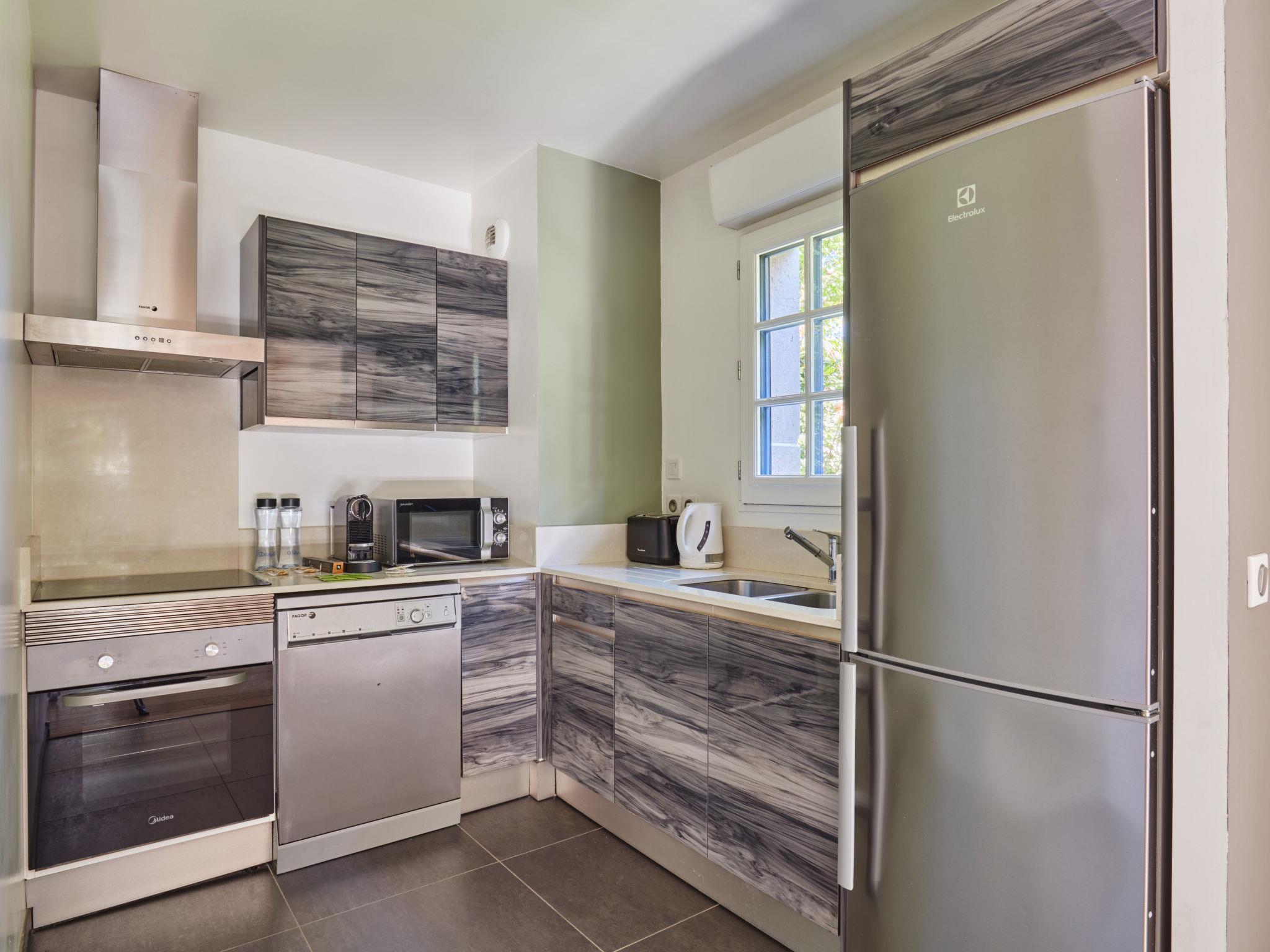 "Villas Odalys Collection Domaine de Lana", 5-room house 100 to 125 m2 on 2 levels. Modern and tasteful furnishings: living room with dining table and TV (flat screen). Exit to the terrace. 1 room with 1 french bed (140 cm, length 190 cm). Open kitchen (oven, dishwasher, 3 ceramic glass hob hotplates, toaster, kettle, microwave, freezer, electric coffee machine). Shower, sep. WC, double hand-basin. Upper floor: 2 rooms with sloping ceilings, each room with 2 beds (90 cm, length 190 cm). 1 room with sloping ceilings with 1 french bed (140 cm, length 190 cm), TV (flat screen). Exit to the balcony. Sep. WC, bath or shower. Gas heating. Small balcony, terrace, small garden. Terrace furniture. Facilities: washing machine, children's high chair, baby cot. Internet (WiFi, free). Garage. Please note: non-smoking house. Maximum 2 pets/ dogs allowed. Smoke alarm.