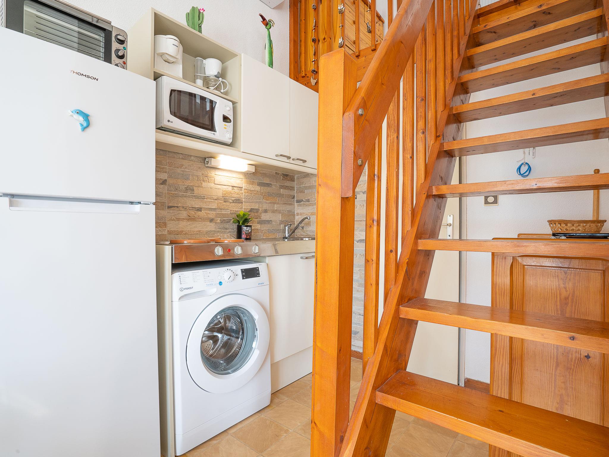 "Lou Cantalou", 3-room terraced house 47 m2 on 2 levels. Object suitable for 2 adults + 2 children. Very simple and practical furnishings: living/dining room with TV (flat screen), radio and air conditioning. Exit to the terrace. 1 room with 1 x 2 bunk beds (90 cm, length 190 cm). Kitchenette (3 hot plates, mini-oven, microwave, freezer). Shower/WC. Electric heating. Upper floor: (steep stair), 1 room with sloping ceilings with 1 french bed (1 x 140 cm, length 190 cm). Large terrace 68 m2. Terrace furniture, barbecue, deck chairs (2). Facilities: washing machine. Internet (WiFi, extra). Parking space n 24. Please note: non-smokers only. Smoke alarm.
