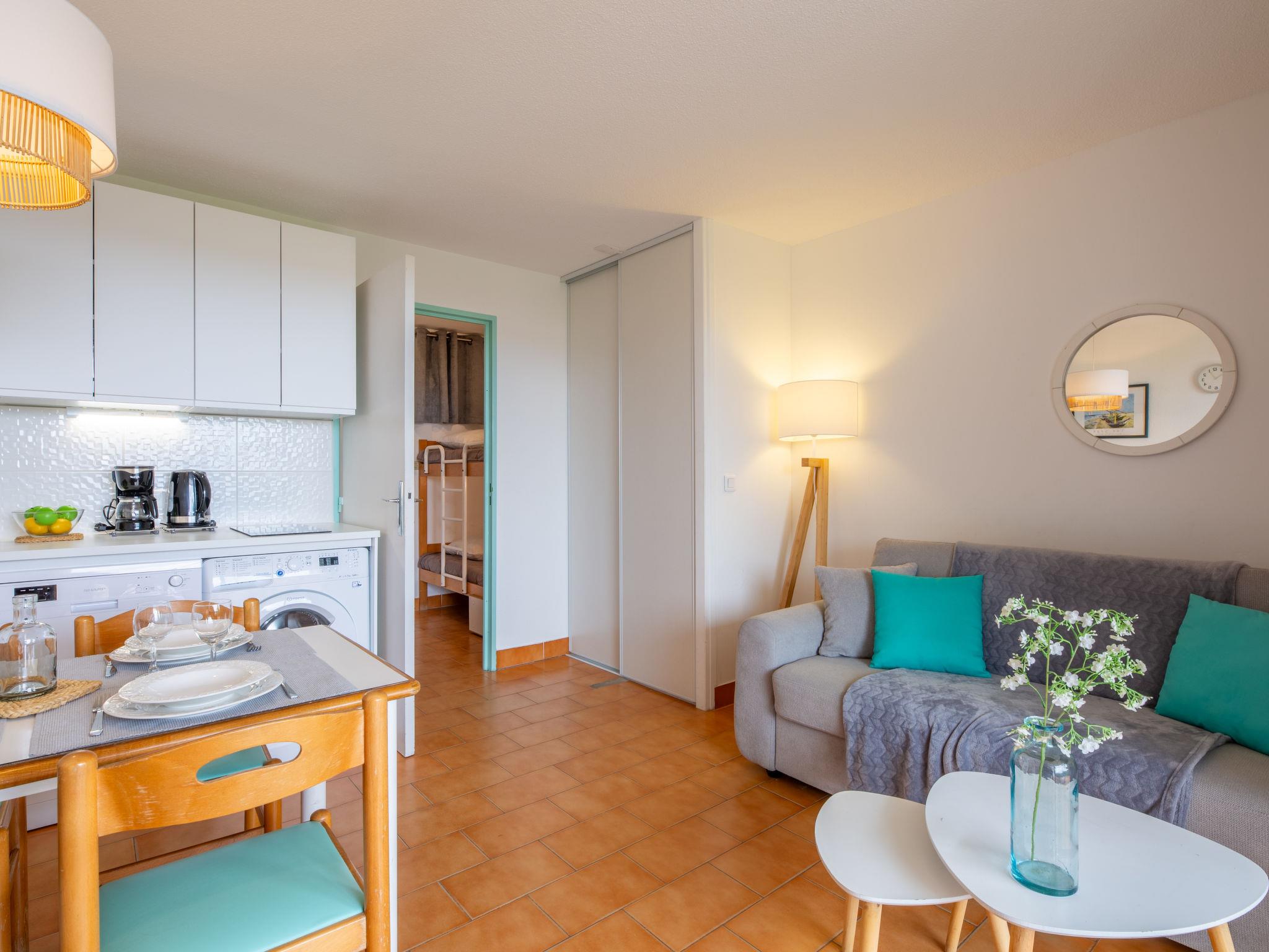 1-room apartment 21 m2, on the ground floor. Simple furnishings: entrance hall with 1 x 2 bunk beds (80 cm, length 190 cm). Living/sleeping room with 1 double sofabed (140 cm, length 190 cm), TV. Exit to the terrace. Kitchenette (2 hot plates, dishwasher, toaster, kettle, microwave, electric coffee machine). Bath/WC. Electric heating. Terrace 8 m2, roofed. Terrace furniture. Distant view of the sea. Facilities: washing machine. Internet (WiFi, extra). Parking space n 313. Please note: non-smokers only. Maximum 1 pet/ dog allowed. Smoke alarm. Instead of an enclosed bedroom, some sleeping areas are located in an open-plan area (gallery, alcove, etc.). 83115003104HT