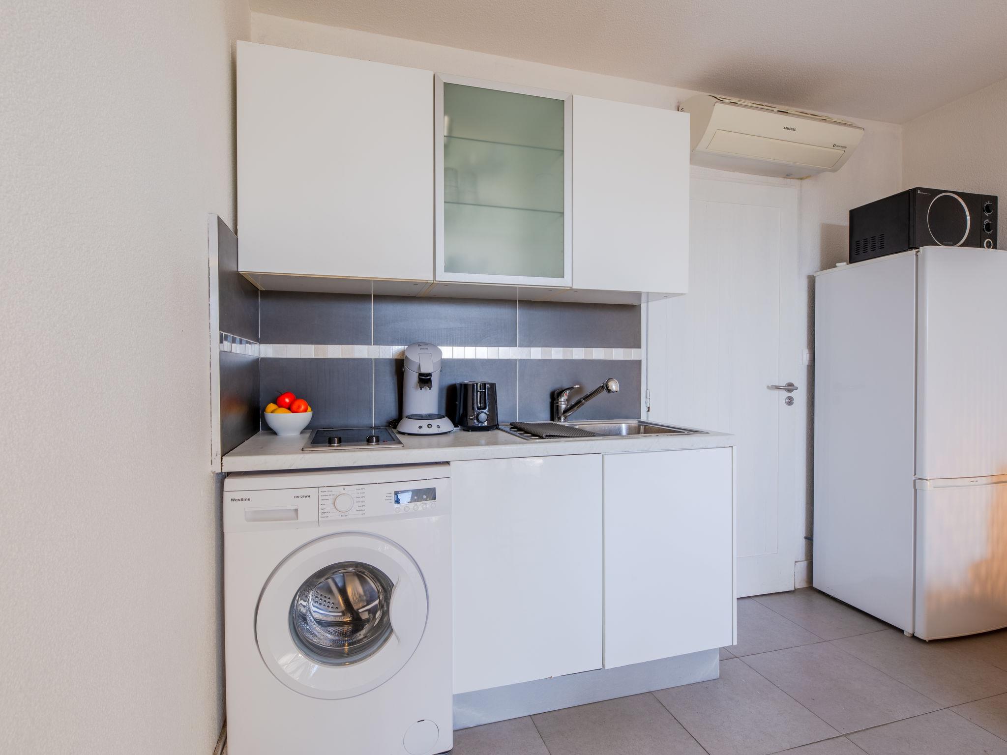 2-room apartment 27 m2, on the ground floor. Simple furnishings: living/dining room with 1 double sofabed (160 cm, length 200 cm), TV (flat screen). Exit to the terrace. 1 small room with 1 double bed (140 cm, length 190 cm). Kitchenette (2 ceramic glass hob hotplates, freezer, combination microwave). Bathroom, sep. WC. Electric heating, air-conditioning. Terrace 16 m2, south-west facing position. Distant view of the sea. Facilities: washing machine. Internet (WiFi, extra). Parking. Please note: non-smokers only. Maximum 1 pet/ dog allowed. Smoke alarm. Offer by a private individual according to Art. 155, IV of CGI. 83115005594HT