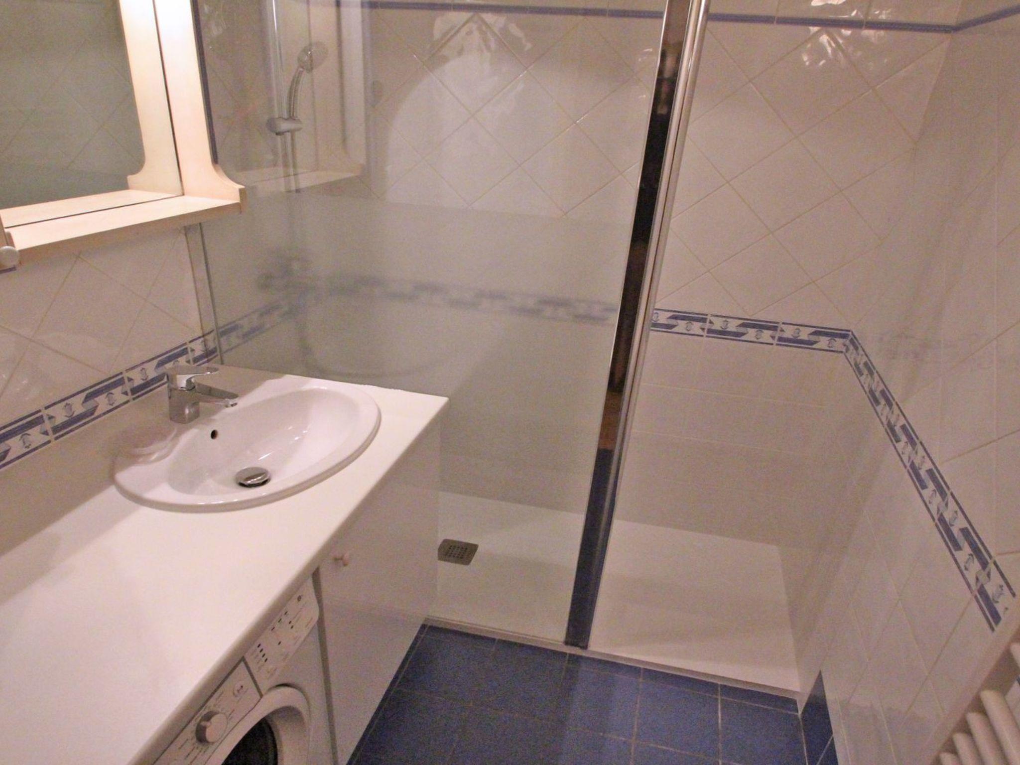 - 1 bathroom with walk-in shower, vanity unit and washing machine