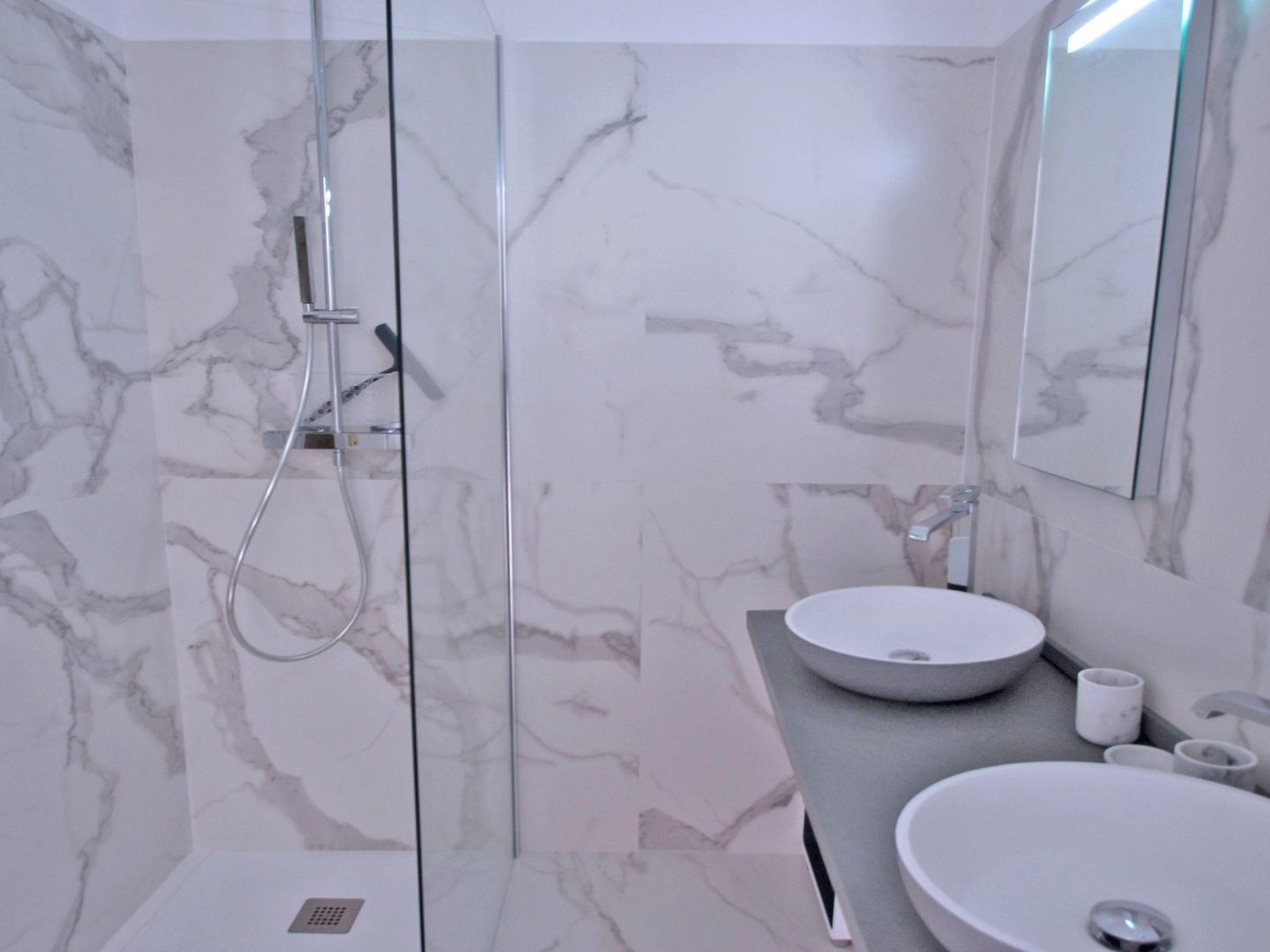 - Bathroom with double washbasin, heated towel rail and walk-in shower
