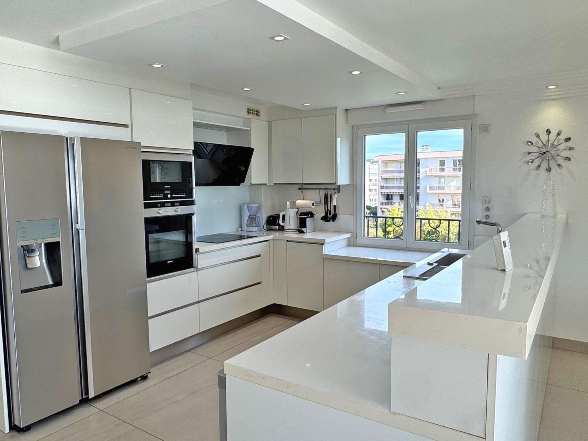 - Large living room with lounge and dining area with sofa, coffee table, flat-screen TV, table and chairs, double door opening onto terrace - Fully-equipped open-plan kitchen with US fridge/freezer, dishwasher, oven, microwave, coffee maker, kettle, 3-burner hob, crockery, cooking utensils and electric wine cellar