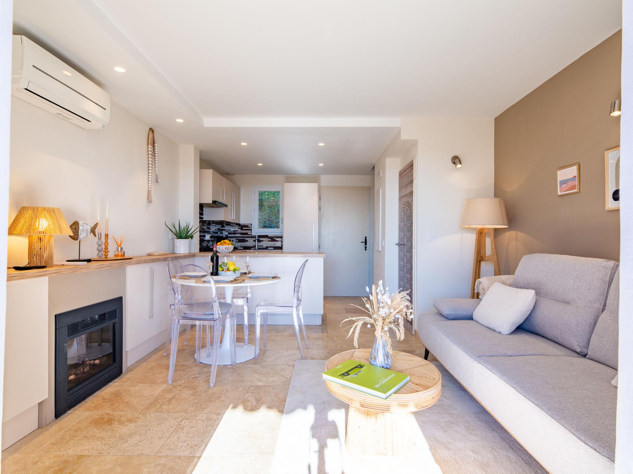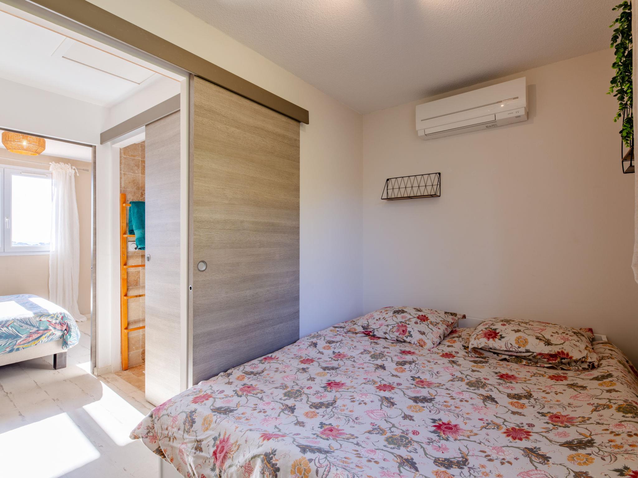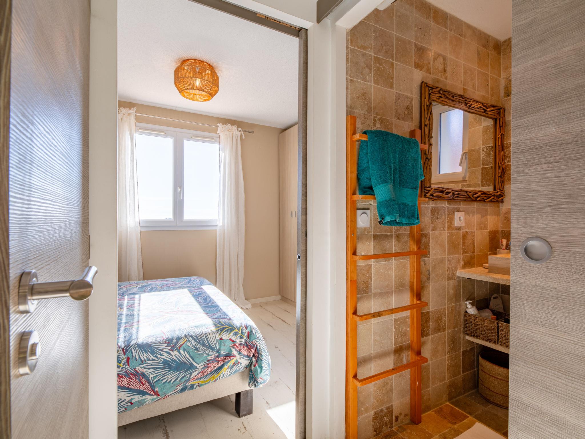 "Le Bougainvillier", 3-room terraced house 48 m2 on 2 levels, south facing position. Object suitable for 2 adults + 2 children. Renovated in 2024, modern and tasteful furnishings: living/dining room 22 m2 with veranda with TV (flat screen), air conditioning. Exit to the loggia. Open kitchen (oven, dishwasher, 4 ceramic glass hob hotplates, toaster, kettle, microwave, freezer, electric coffee machine). Upper floor: 1 room 10 m2 with 1 french bed (1 x 160 cm, length 200 cm). 1 room 7 m2 with 1 pull-out bed (2 pers. 2 x 80 cm, length 200 cm), air conditioning. Shower, sep. WC. Heating, air-conditioning. Balcony furniture, electric barbecue, covered balcony. Distant view of the sea and golf course. Facilities: washing machine. Internet (WiFi, free). Garage (1 car). Please note: non-smoking house. Smoke alarm. Offer by a commercial proprietor according to Art. 155, IV, CGI 83115005475MX