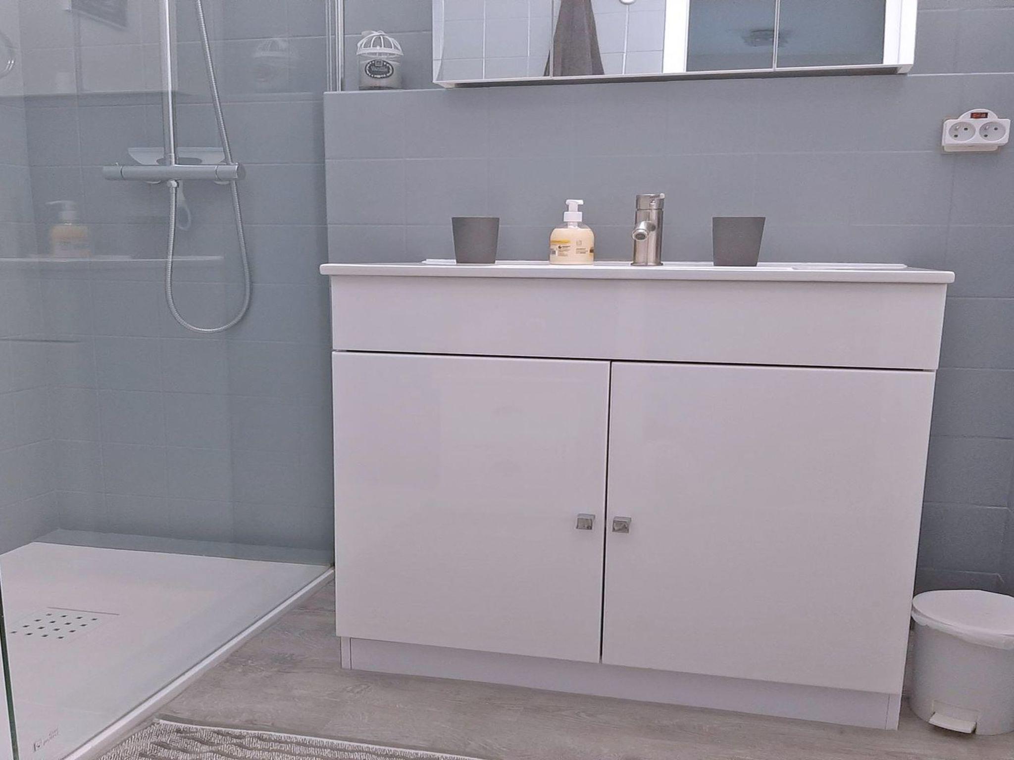 - Bathroom with walk-in shower, vanity unit and heated towel rail