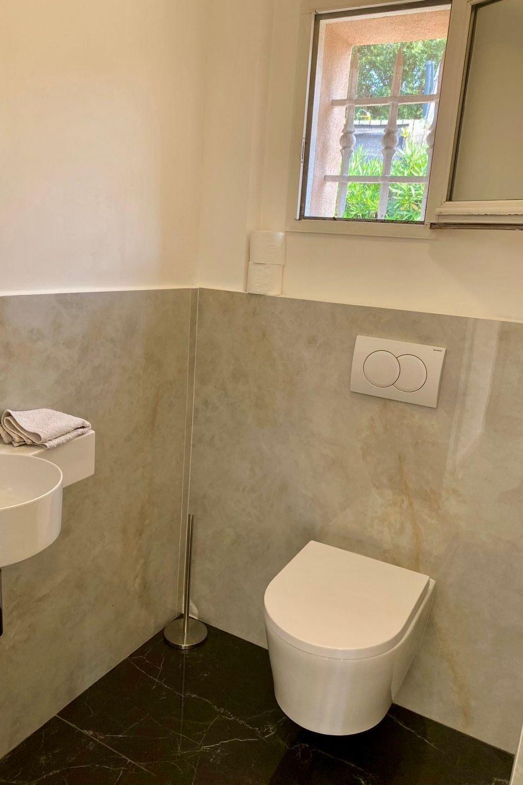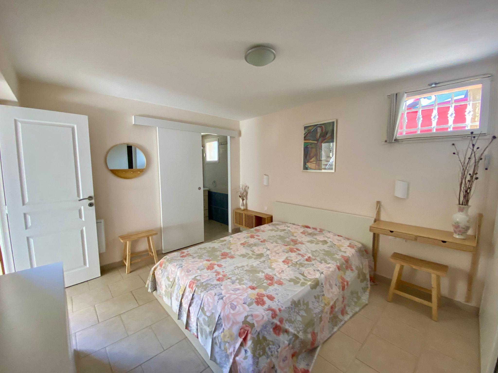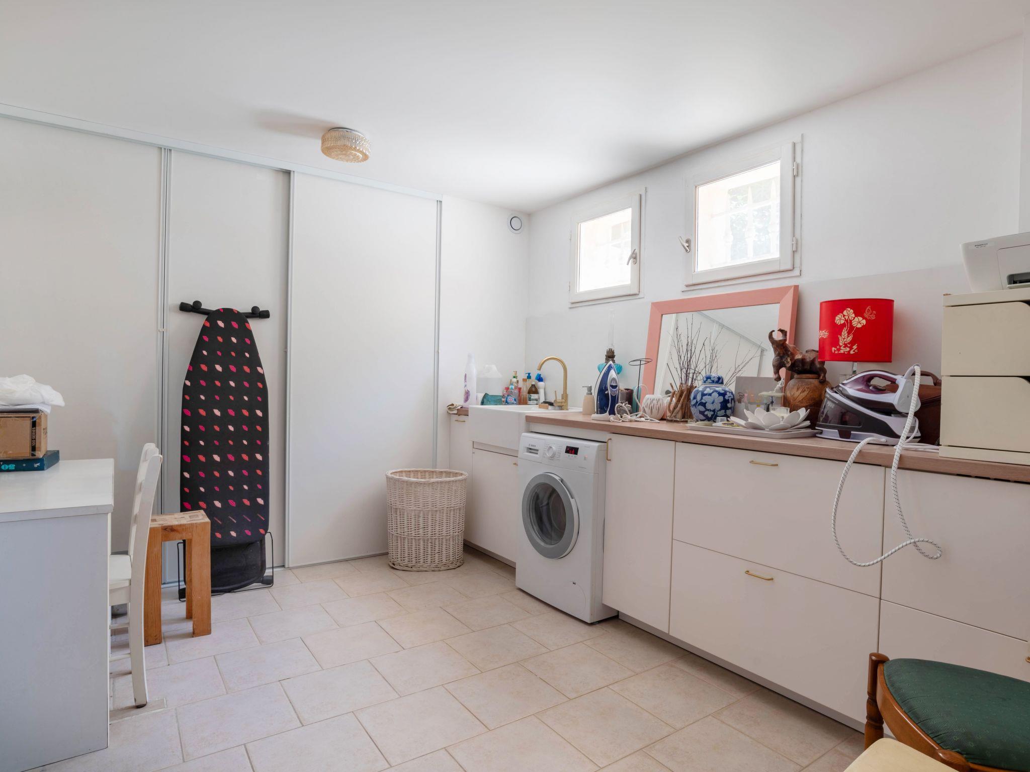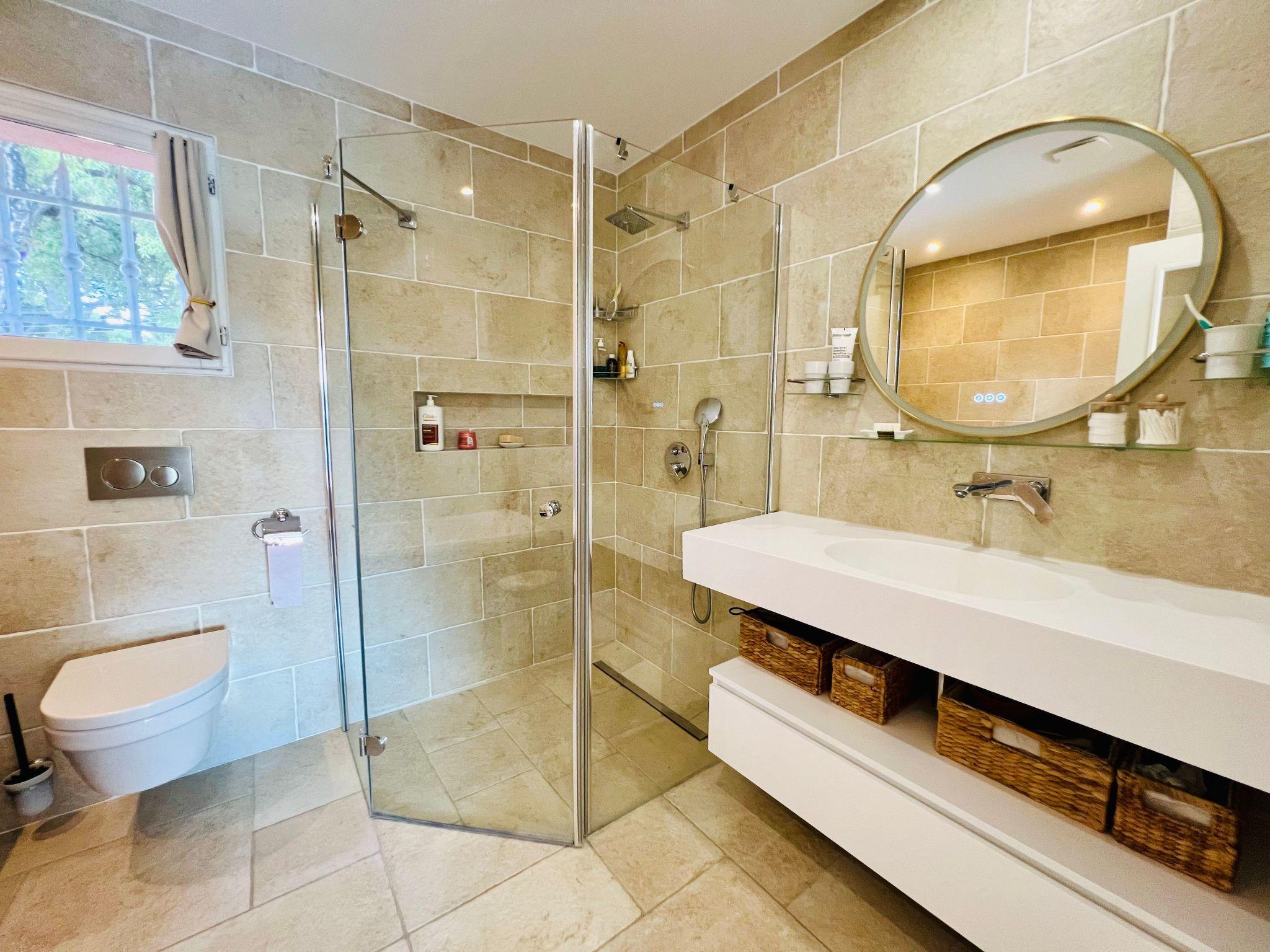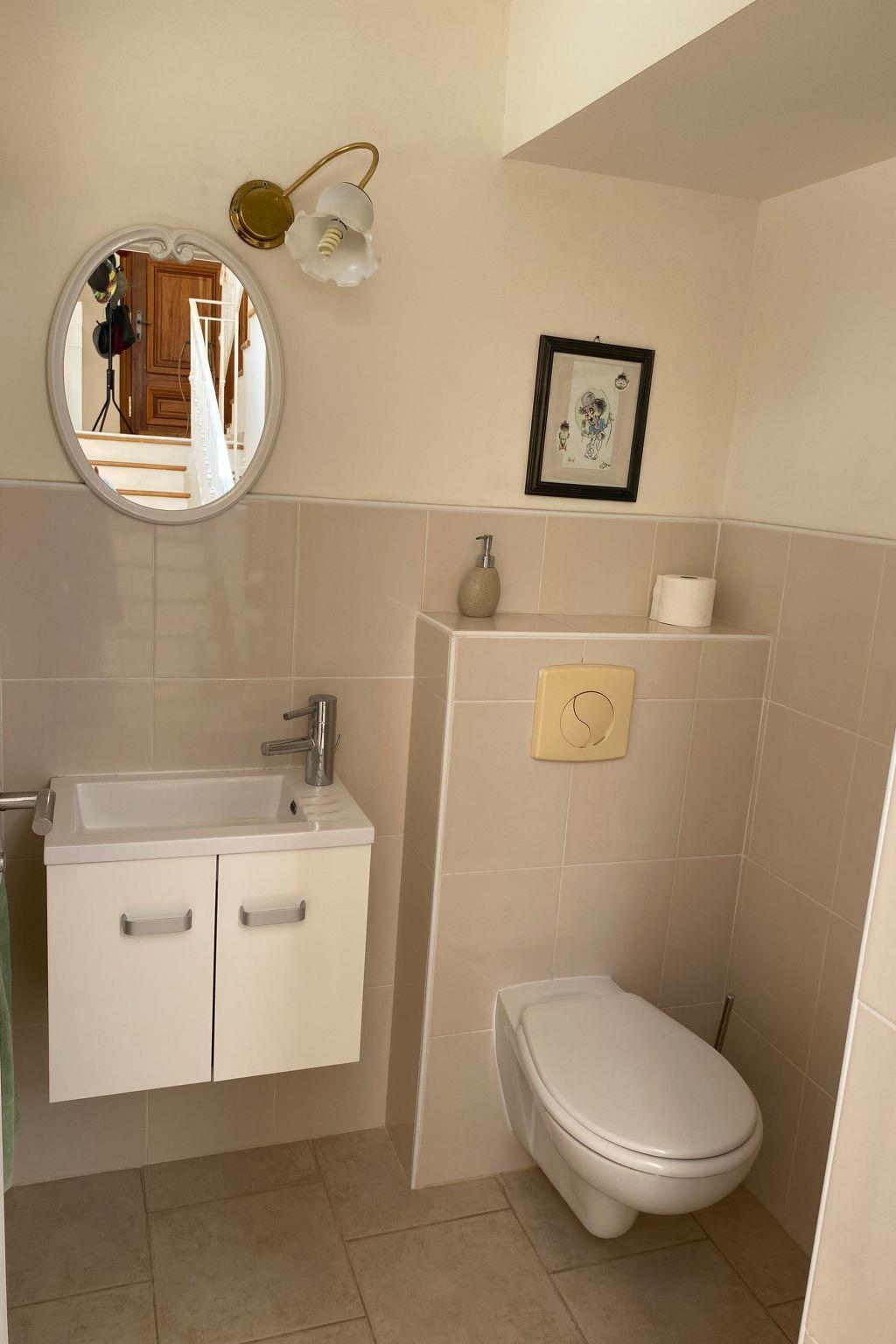 This charming villa for two to six people, with its private swimming pool in an enclosed flower garden, has a first bedroom adjoining the bathroom with a bathtub and shower cubicle, furnished with a washbasin and mirror. ATTENTION: we do not wish to rent the villa to families with small children who cannot swim! The second bedroom adjoins a large bathroom with bathtub and is furnished with two washbasins and two mirrors. The third bedroom adjoins the shower room and also has a vanity unit with washbasin and mirror. There are also three WCs, a lounge with a 46-inch Led flat-screen TV, a dining room, a separate kitchen equipped with induction cooker, oven, microwave, Senseo coffee machine in capsule, dishwasher; a laundry room with washing machine, internet connection.