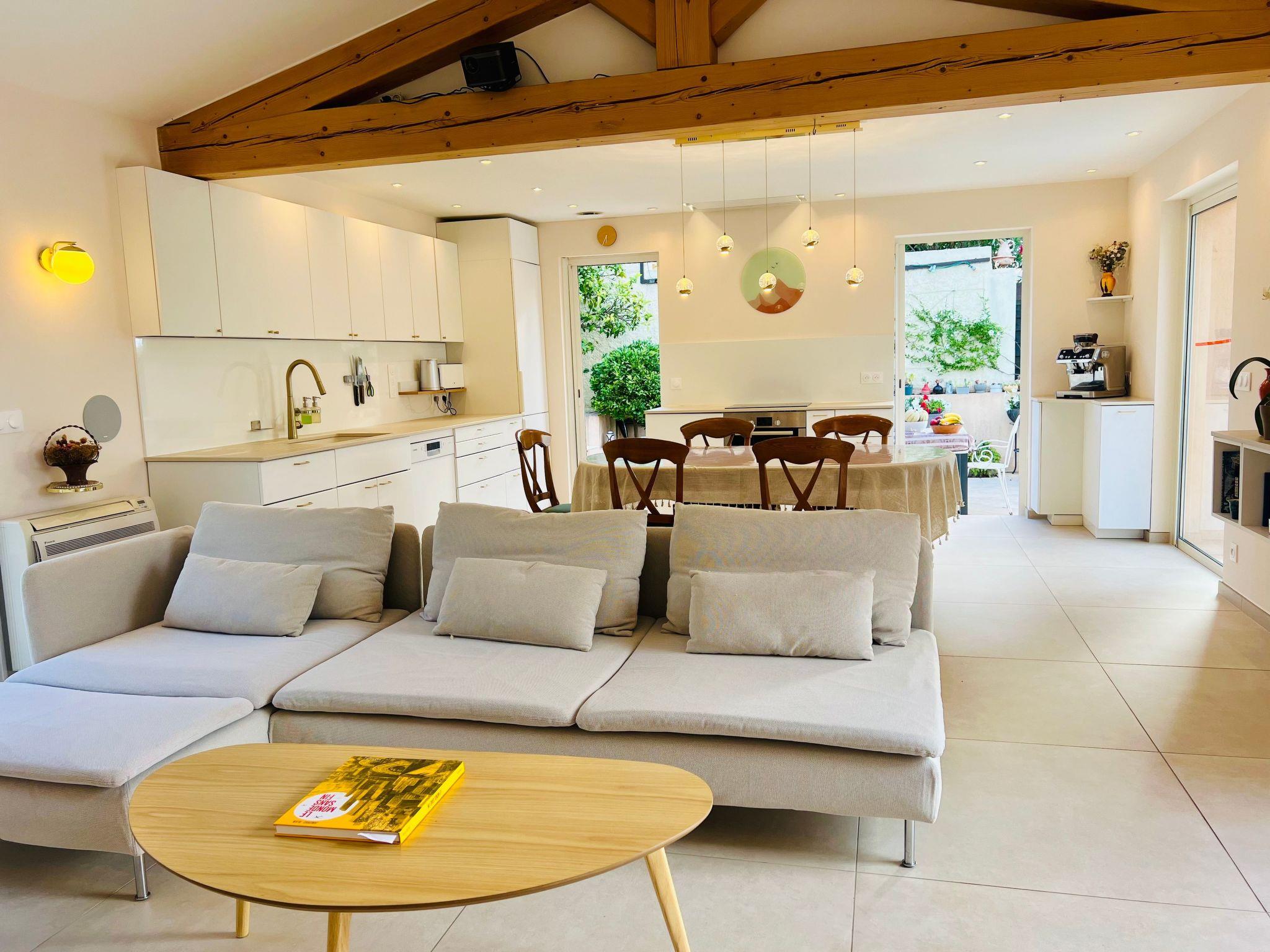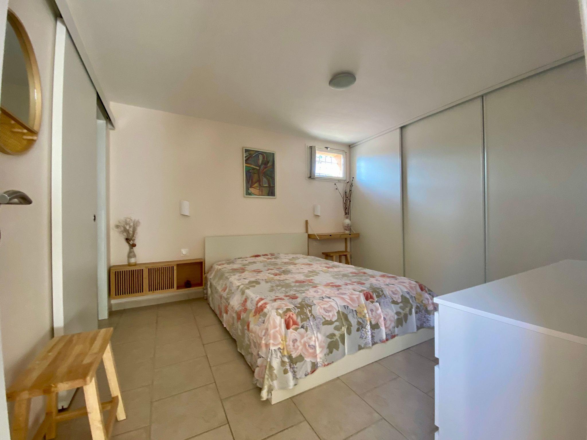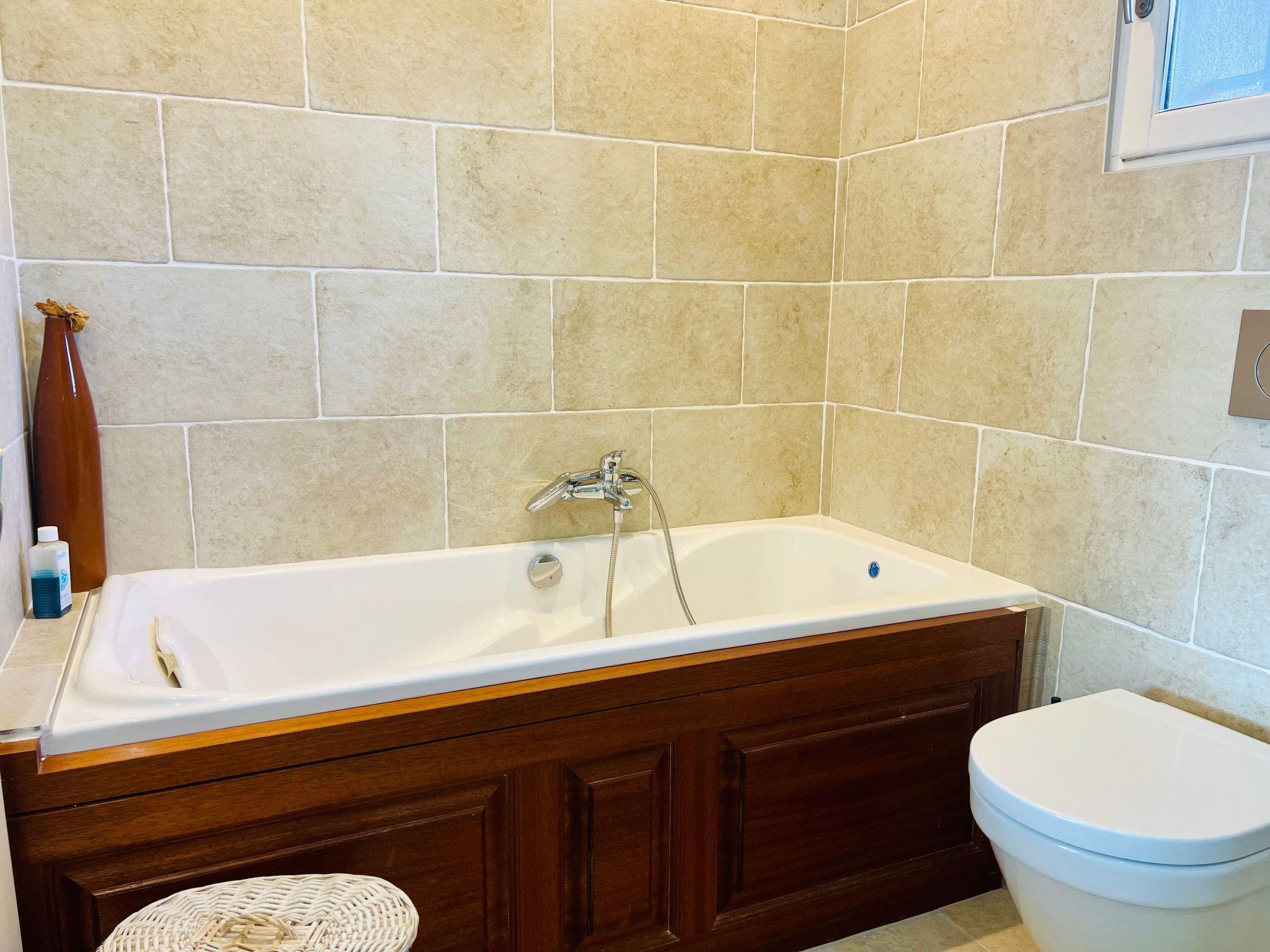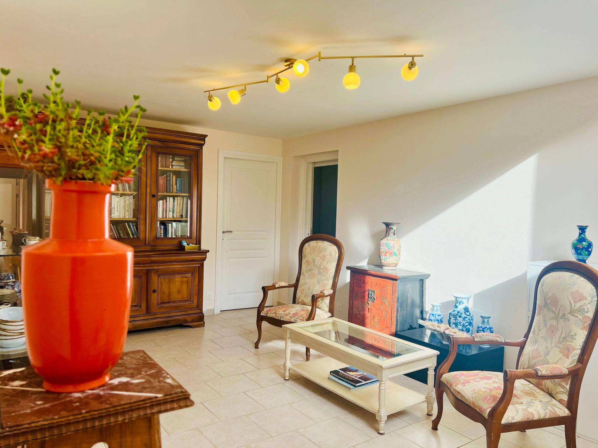 This charming villa for two to six people, with its private swimming pool in an enclosed flower garden, has a first bedroom adjoining the bathroom with a bathtub and shower cubicle, furnished with a washbasin and mirror. ATTENTION: we do not wish to rent the villa to families with small children who cannot swim! The second bedroom adjoins a large bathroom with bathtub and is furnished with two washbasins and two mirrors. The third bedroom adjoins the shower room and also has a vanity unit with washbasin and mirror. There are also three WCs, a lounge with a 46-inch Led flat-screen TV, a dining room, a separate kitchen equipped with induction cooker, oven, microwave, Senseo coffee machine in capsule, dishwasher; a laundry room with washing machine, internet connection.