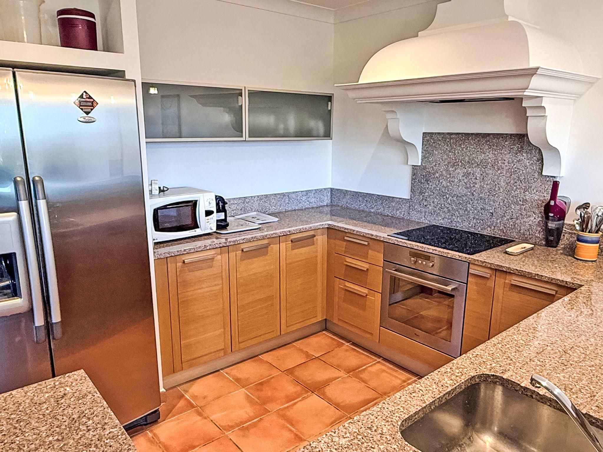 - Fully-equipped open-plan kitchen with sink, 4-burner ceramic hob, oven, microwave, coffee machine, American fridge, dishwasher, crockery, etc.