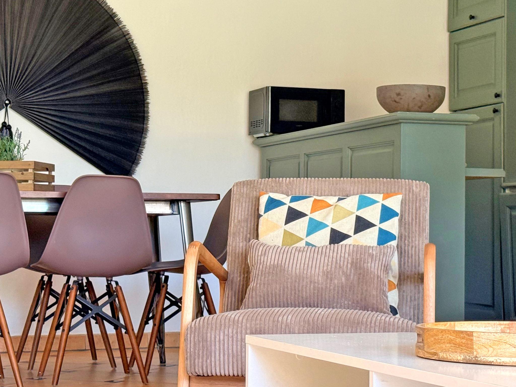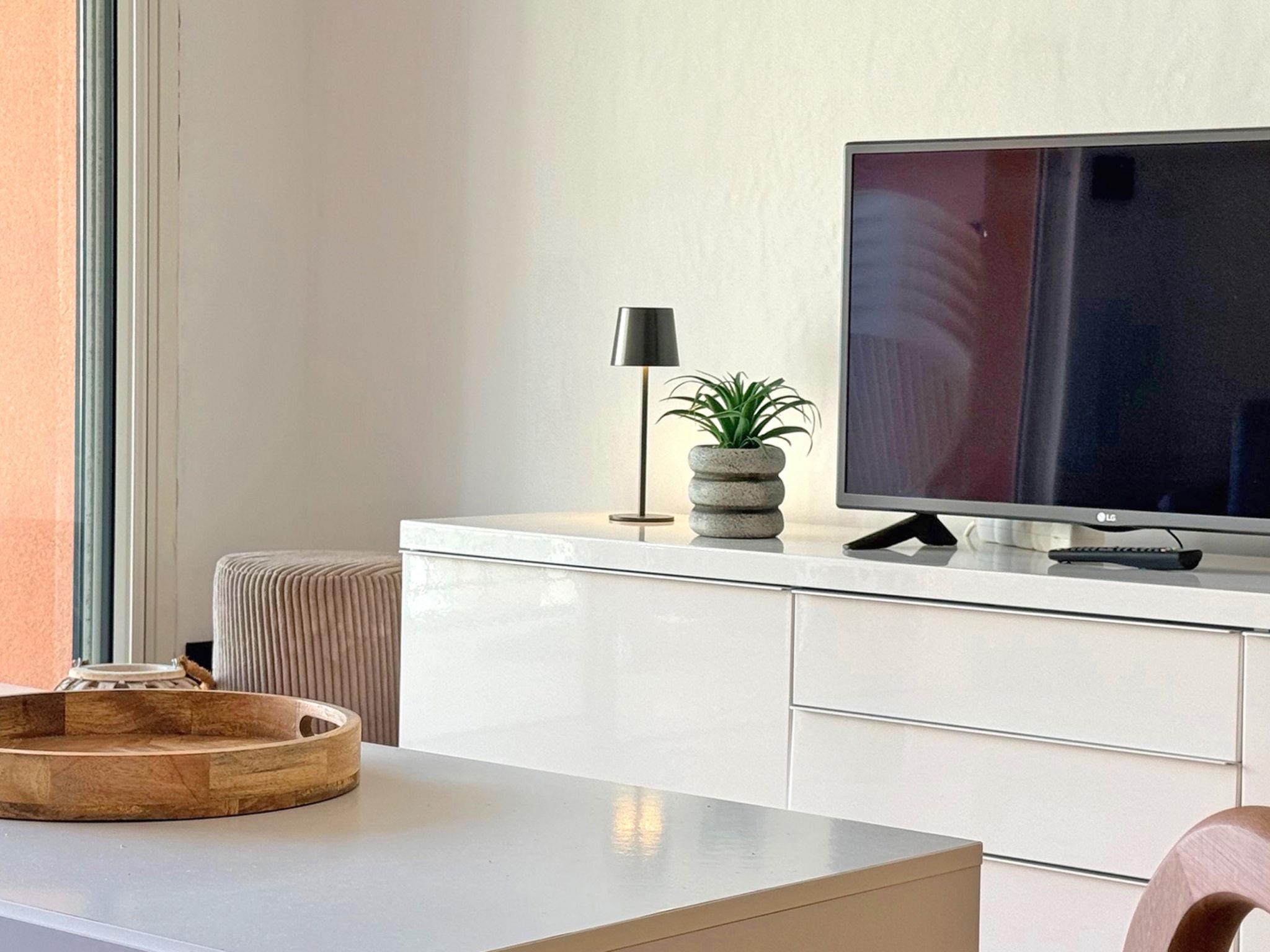 - Beautiful air-conditioned living room with sofa bed (140cm), coffee table, TV, direct access to the terrace and dining area with table and chairs.