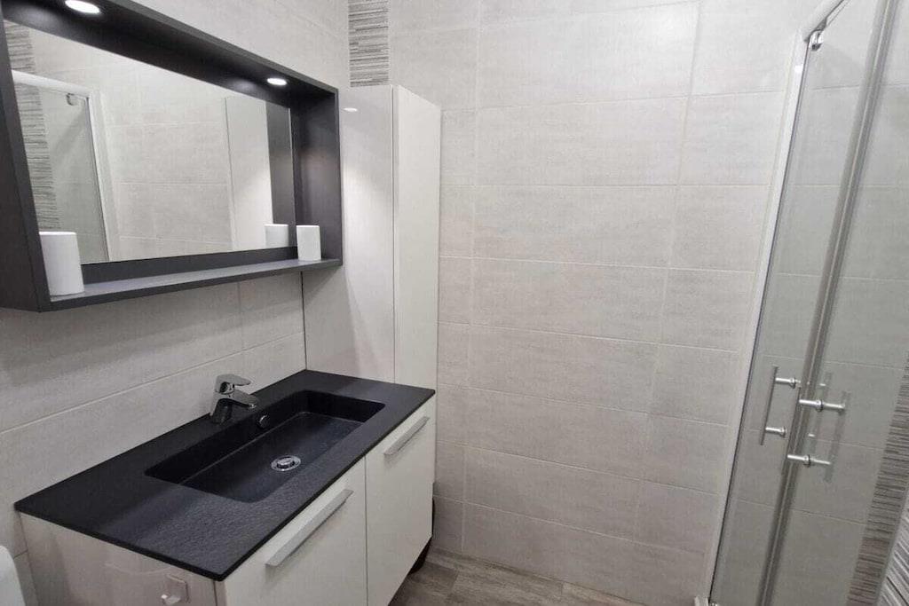 Klimatisiertes Appartement auf 48 m², das hübsch eingerichtet ist und sich im 2. Stock mit Aufzug befindet. Der Balkon ist 5 qm groß und bietet einen atemberaubenden Blick nach Westen. Die Gegend ist sehr ruhig. 4 Personen können hier schlafen und es gibt Schränke, in denen Sie Ihre eigenen Sachen aufbewahren können. Im Wohnzimmer befindet sich ein Schlafsofa mit einer möglichen Breite von 140cm - TV ist vorhanden. Es gibt auch eine unabhängige und gut ausgestattete Küche (2 Kochplatten, Backofen, Mikrowelle, Kühlschrank mit Gefrierfach, Waschmaschine, Geschirr, Schränke). Das Schlafzimmer verfügt über ein 160cm großes Bett und Schränke, ein Badezimmer mit Waschbecken und Waschmaschine sowie eine separate Toilette. Zur Wohnung gehört auch die durch eine automatische Schranke verschlossene Garage. Pool in der Residenz ist vorhanden.