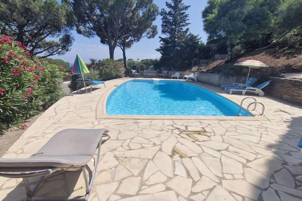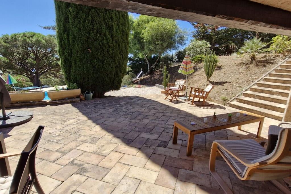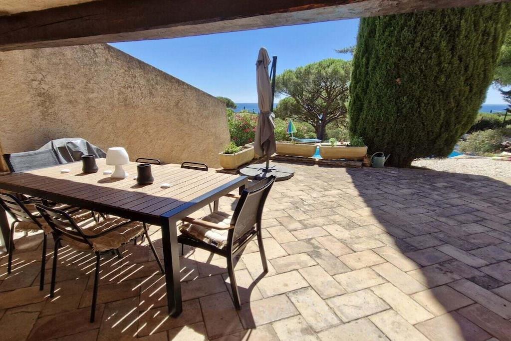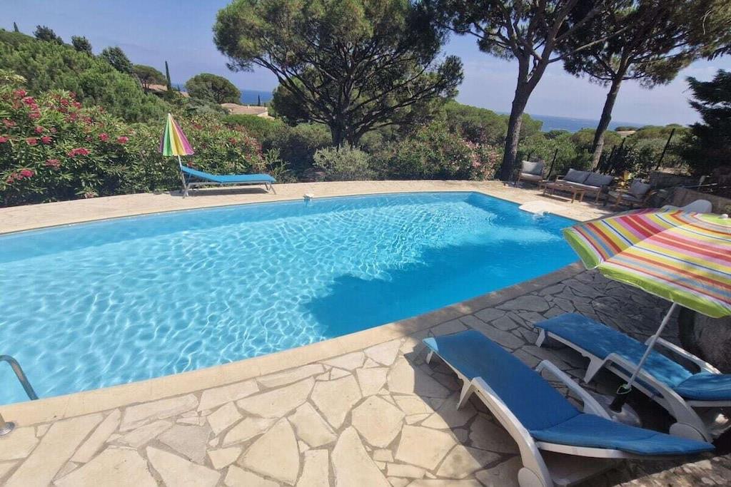 This beautiful villa, surrounded by greenery and featuring four main rooms, boasts a magnificent private swimming pool and a beautiful sea view. Enjoy a relaxing holiday near the beaches of La Nartelle in Sainte-Maxime. The holiday home is equipped as follows: Entrance - Garage with freezer. Fully equipped kitchen (dishwasher, refrigerator with freezer, 4-burner gas stove, electric oven, microwave, Senseo coffee machine, and filter coffee machine). Private toilets. Living/dining room with a 140cm sofa bed and satellite TV. Upstairs: A reading room on the mezzanine. A bedroom with two single beds and a baby cot. A room with a 160cm bed. A room with four 80cm bunk beds. A bathroom. A bathroom with a washing machine. Covered terrace with dining table, sunbathing area, gas barbecue...