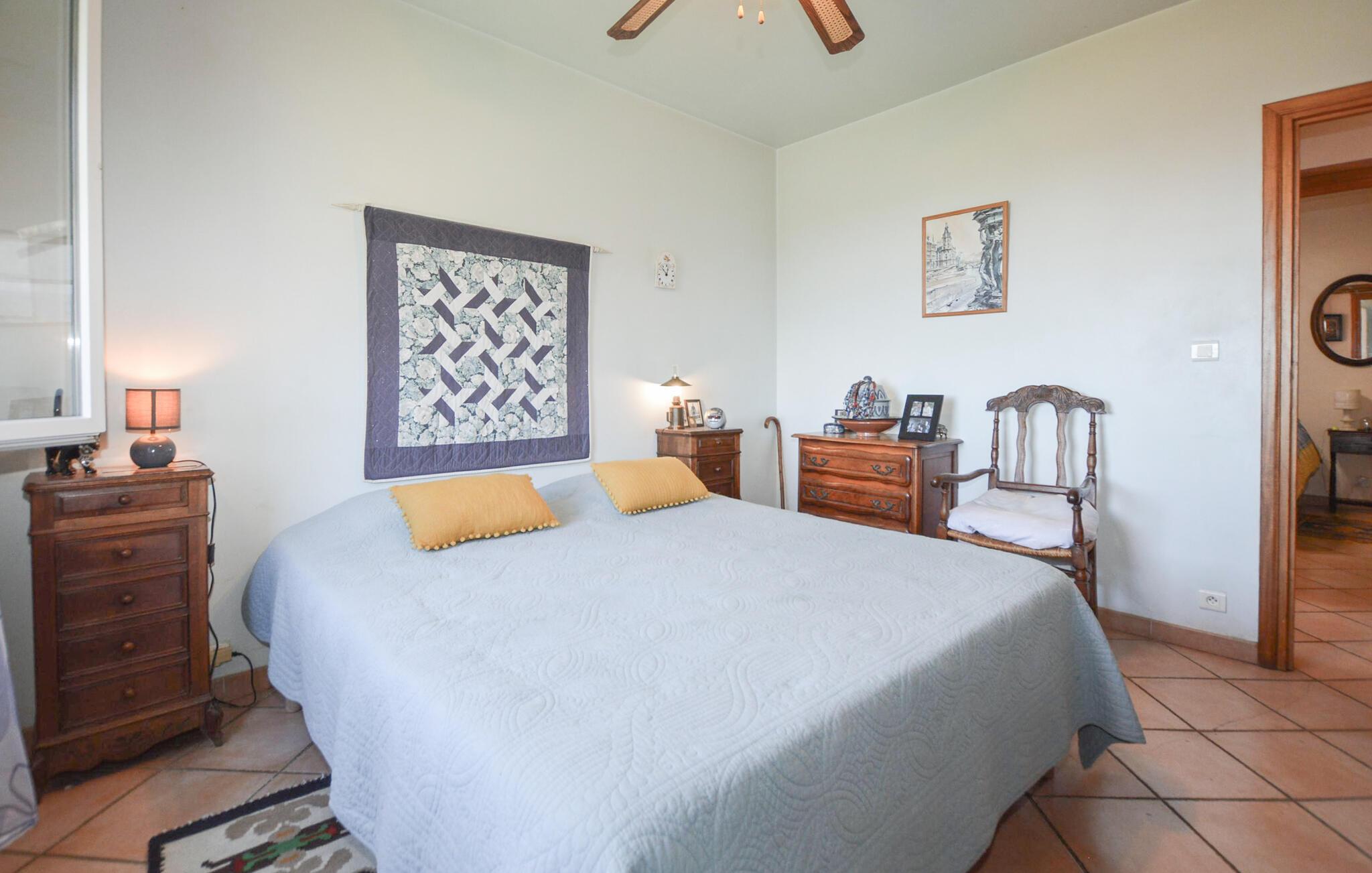 Lassen Sie sich in Ihrer gemütlichen Villa von der wohnlichen Atmosphäre empfangen. Der helle Wohnbereich verbindet Essplatz und Sitzbereich zu einem offenen Raum. Machen Sie es sich auf dem bequemen Sofa bequem und genießen Sie den Blick durch die großen Terrassentüren, die den Raum mit Licht erfüllen. Nehmen Sie am Esstisch Platz und planen Sie in aller Ruhe Ihren nächsten Ausflug. Die Küche ist funktional eingerichtet und bietet alles, was Sie für die Zubereitung regionaler Spezialitäten benötigen. Holzmöbel, Terrakottafliesen und liebevolle Dekorationen verleihen dem Haus eine typisch mediterrane Ausstrahlung.